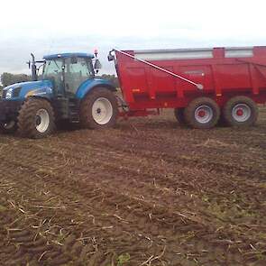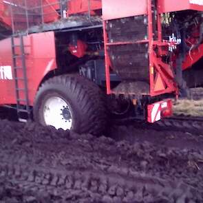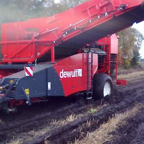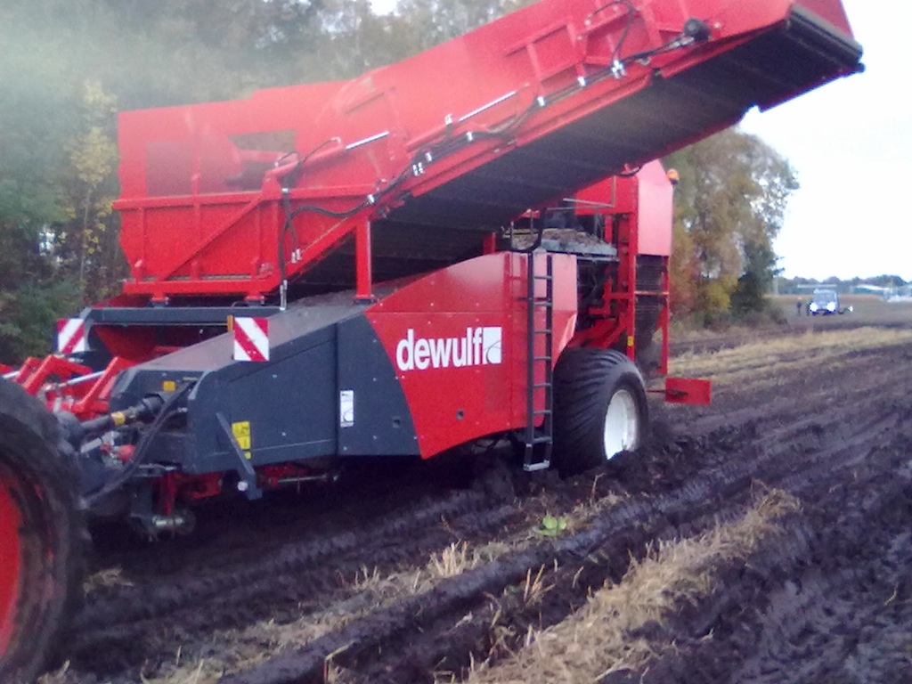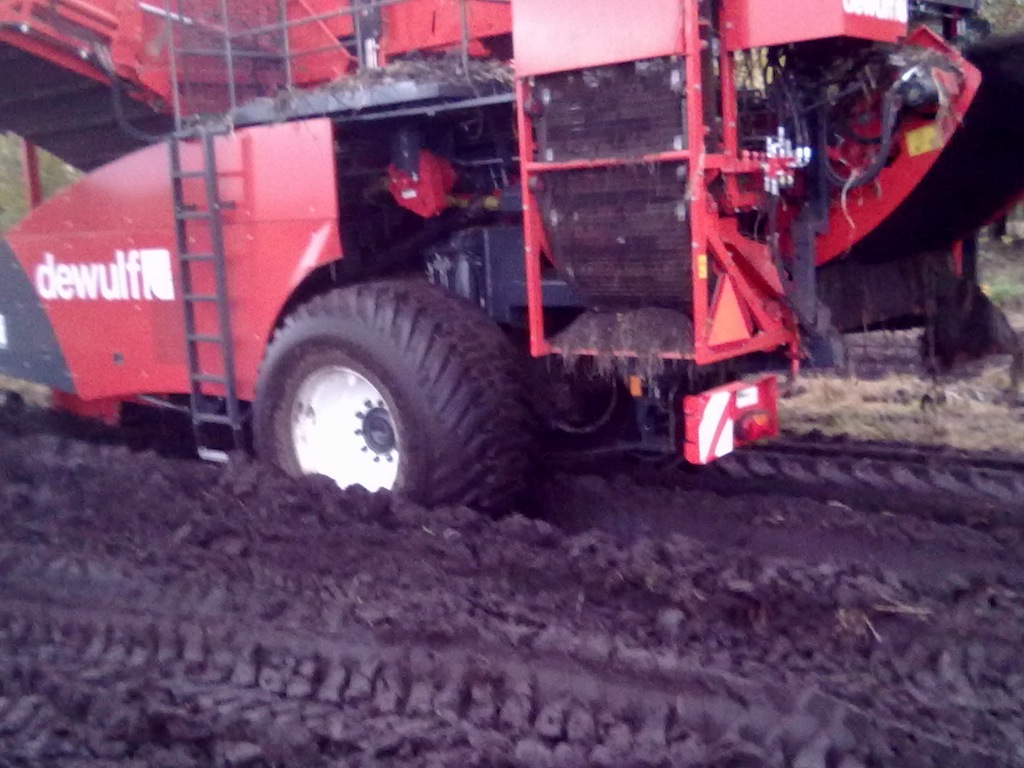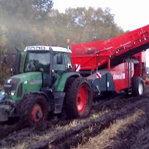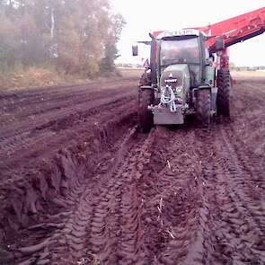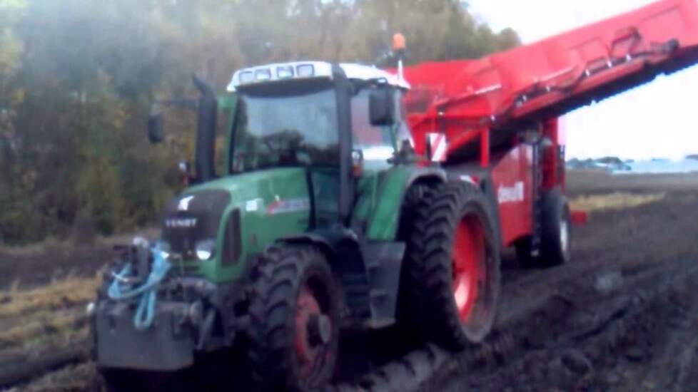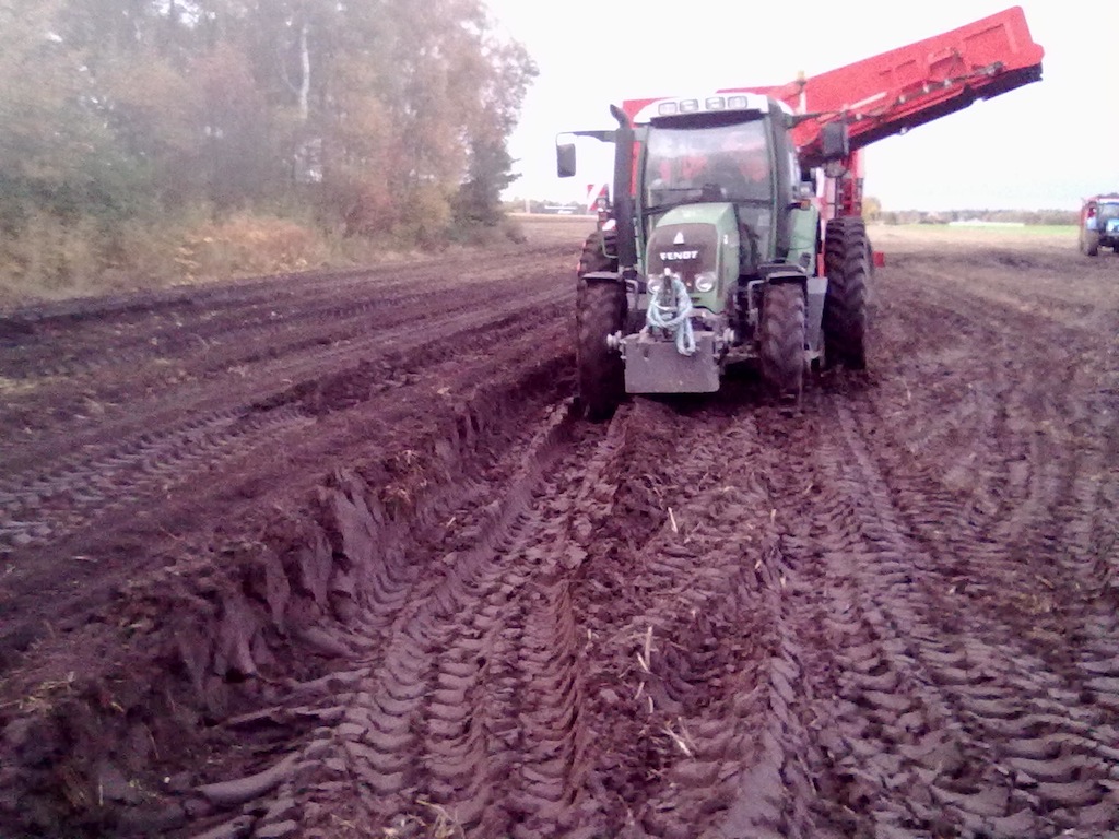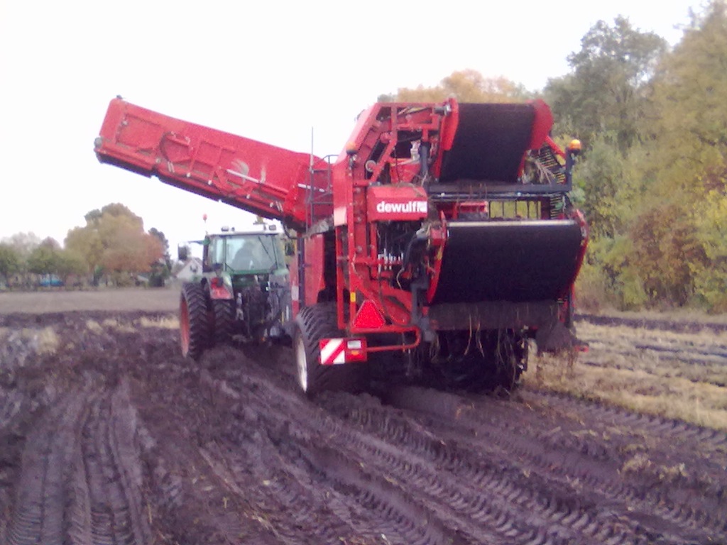 Nijboer Vroomshoop aan het aardappels rooien op een nat perceel. Het valt niet mee om de aardappels uit de grond te krijgen, maar de Dewulf rooier met wielaandrijving houdt het erg lang vol. Ook de Fendt 413 vario heeft weinig probelemen met het trekken en aadrijven van de rooier.
