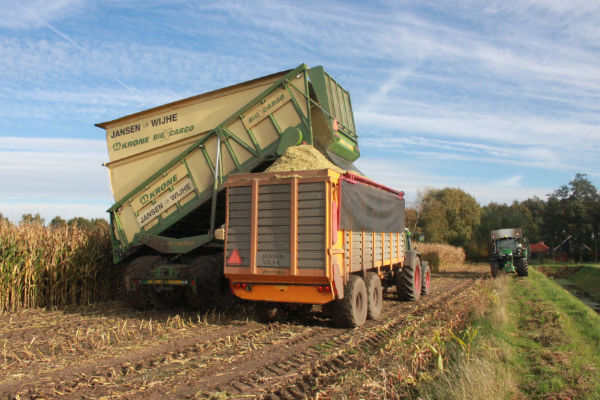 Jansen Wijhe aan het hakselen met de Krone Big X bunkerhakselaar. Ook waren er vijf Fendts en drie John Deers aanwezig voor het transport. Op de kuil een Fendt en Volvo shovel.