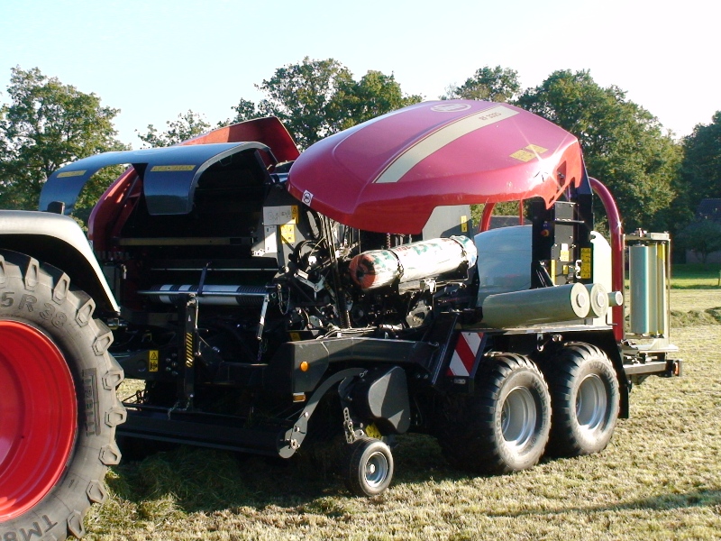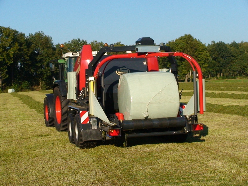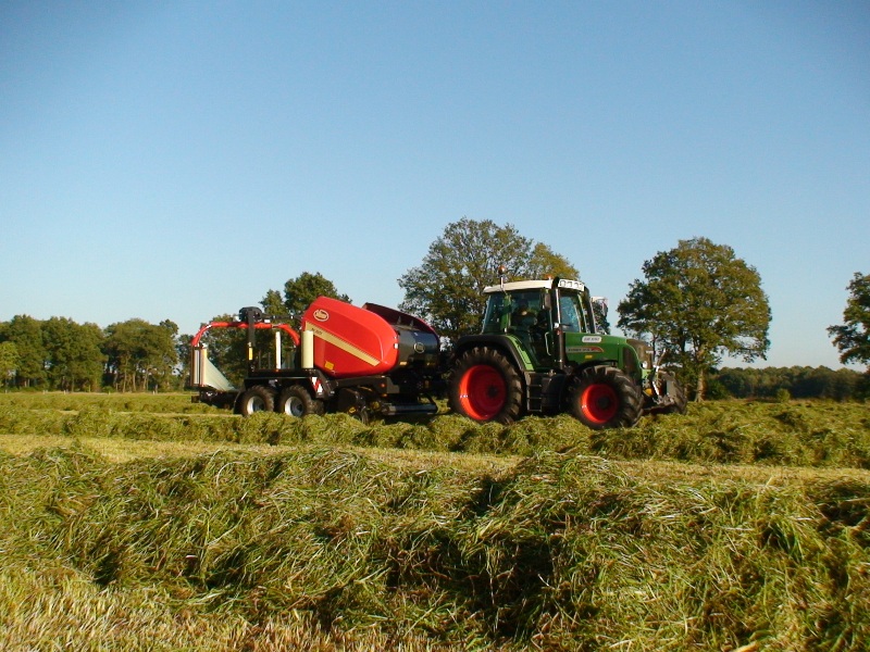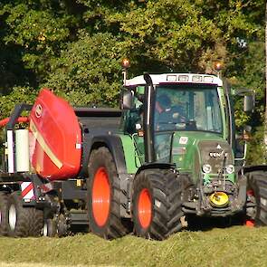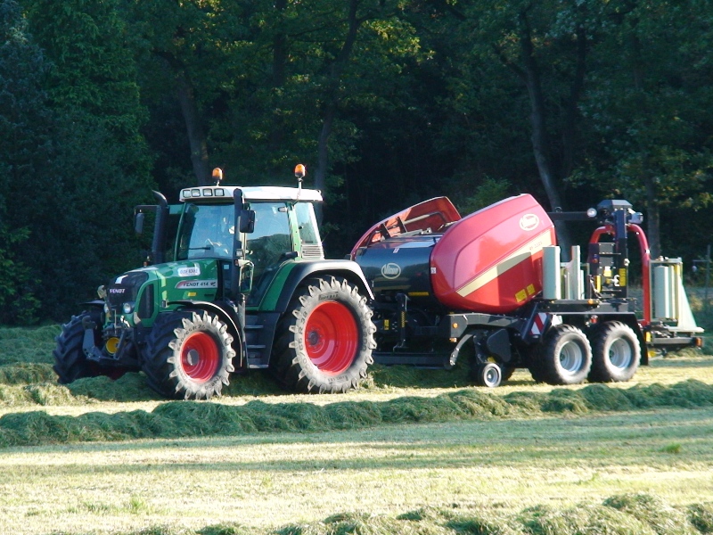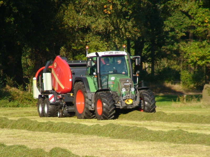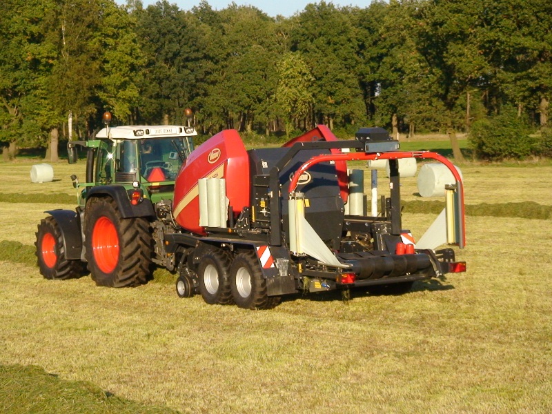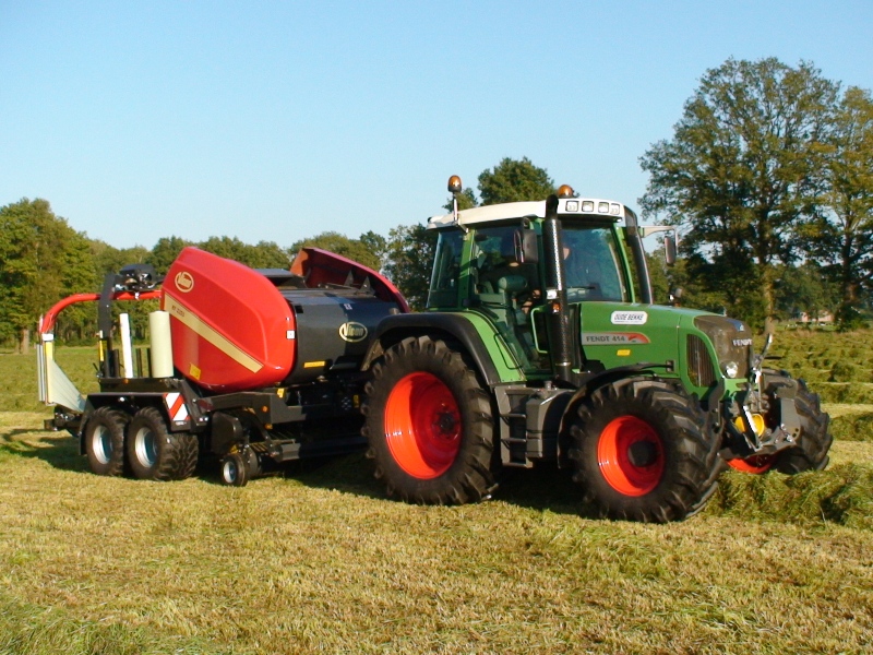 De eerste Vicon RF3325 Flexiwrap in Nederland op demo bij loonbedrijf Oude Bekke te Zenderen. De pers maakte mooie, strakke balen in het taaie najaarsgras. Voor de pers staat een Fendt 414 Vario.