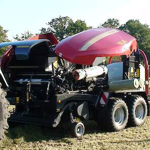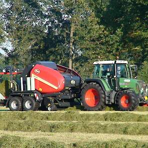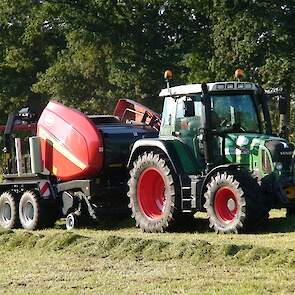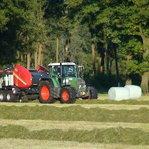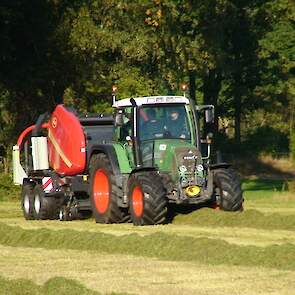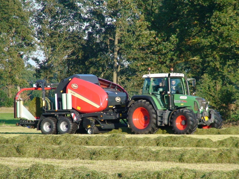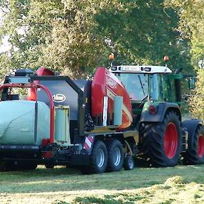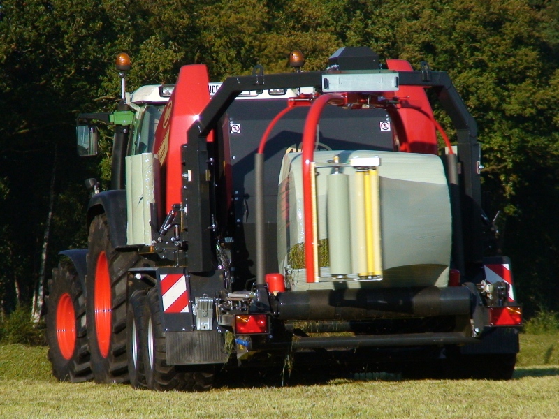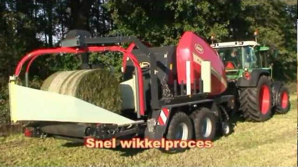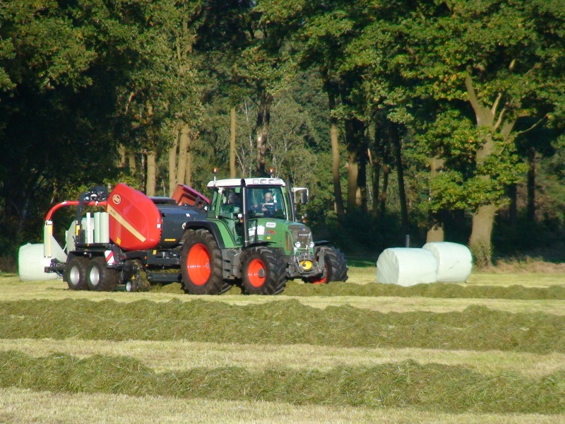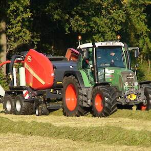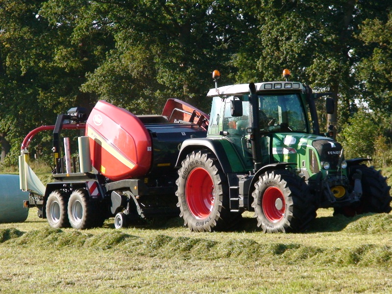 De eerste Vicon RF3325 Flexiwrap in Nederland op demo bij loonbedrijf Oude Bekke te Zenderen. De pers maakte mooie, strakke balen in het taaie najaarsgras. Voor de pers staat een Fendt 414 Vario.