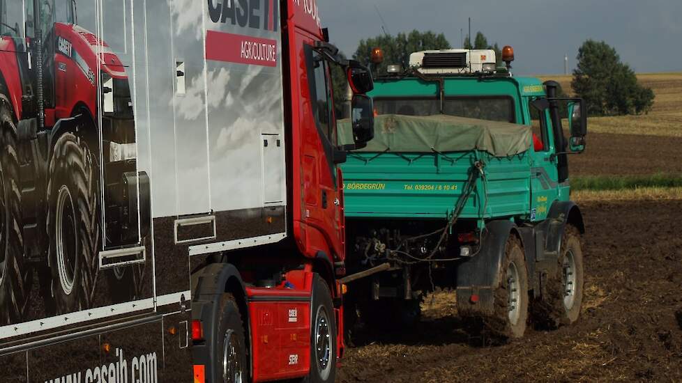 Unimog red vrachtwagen na afloop van een demonstratie in Magdeburg