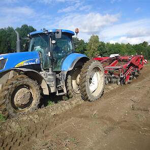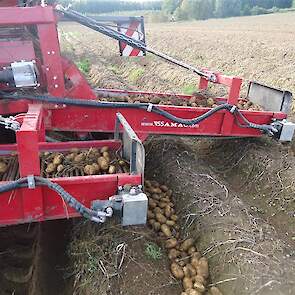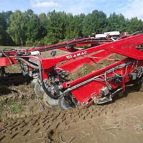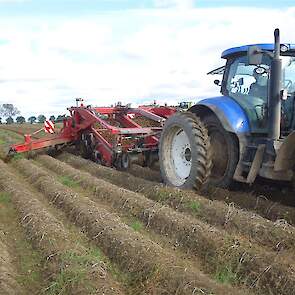 Het gerooide product wat is afgelegd plus de rijen waarin het is afgelegd worden gerooid m.b.v. een Ploeger AR-4w wagen rooier.