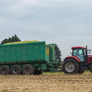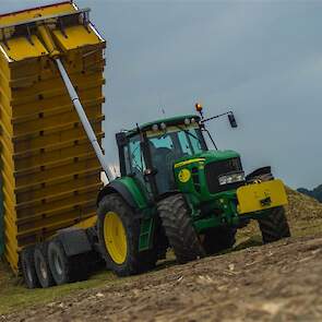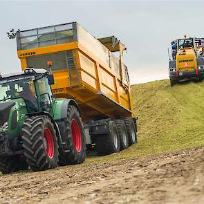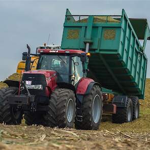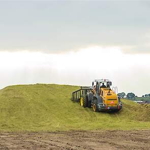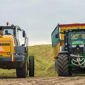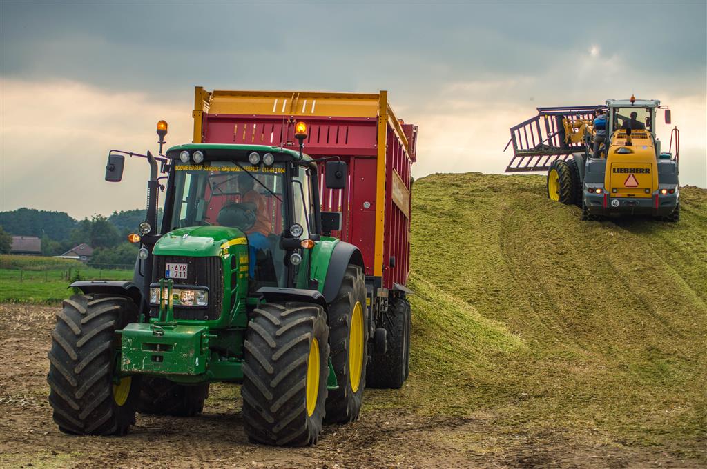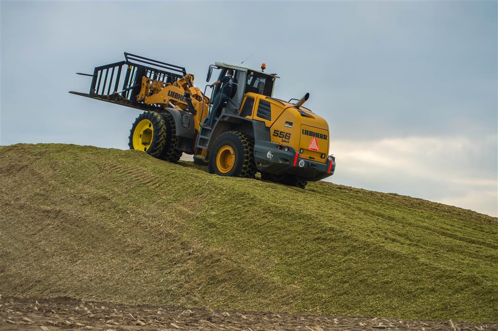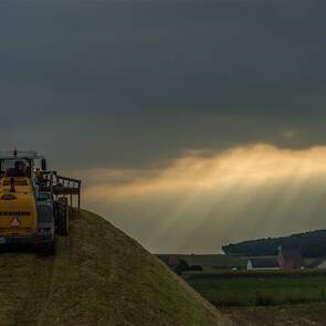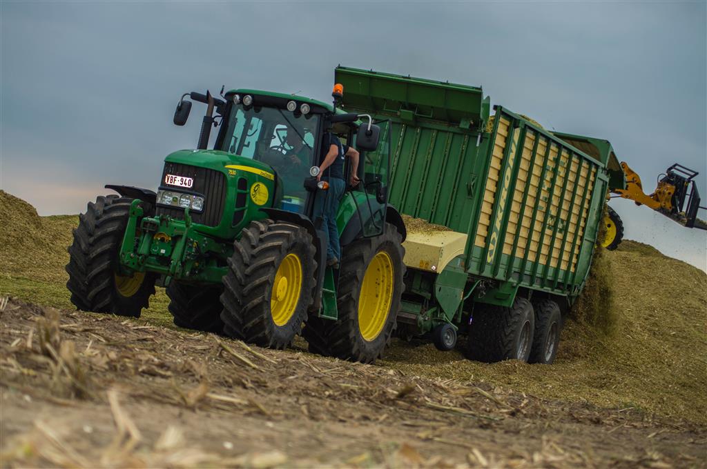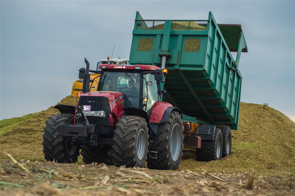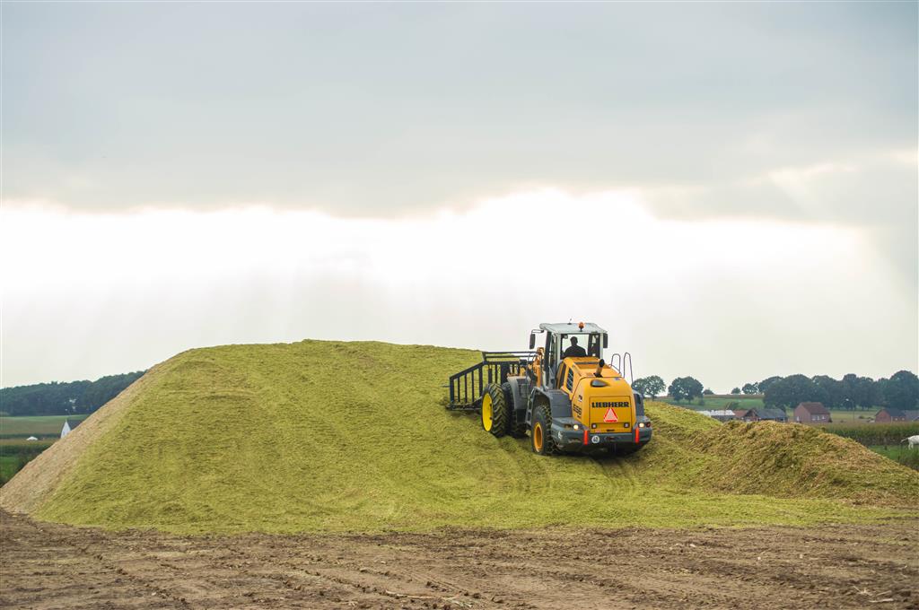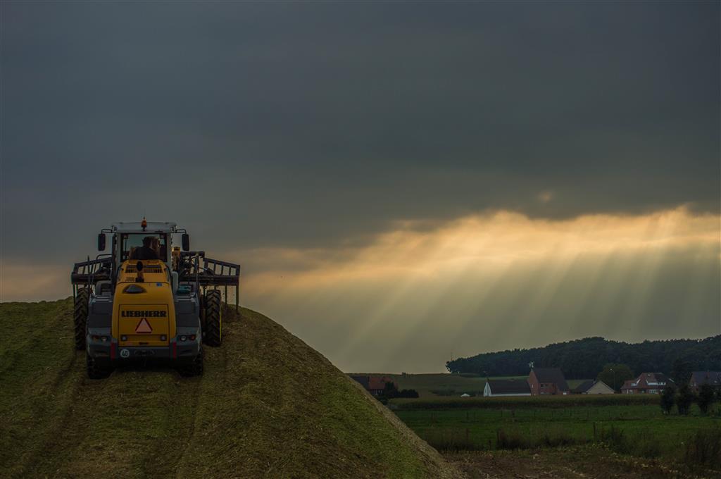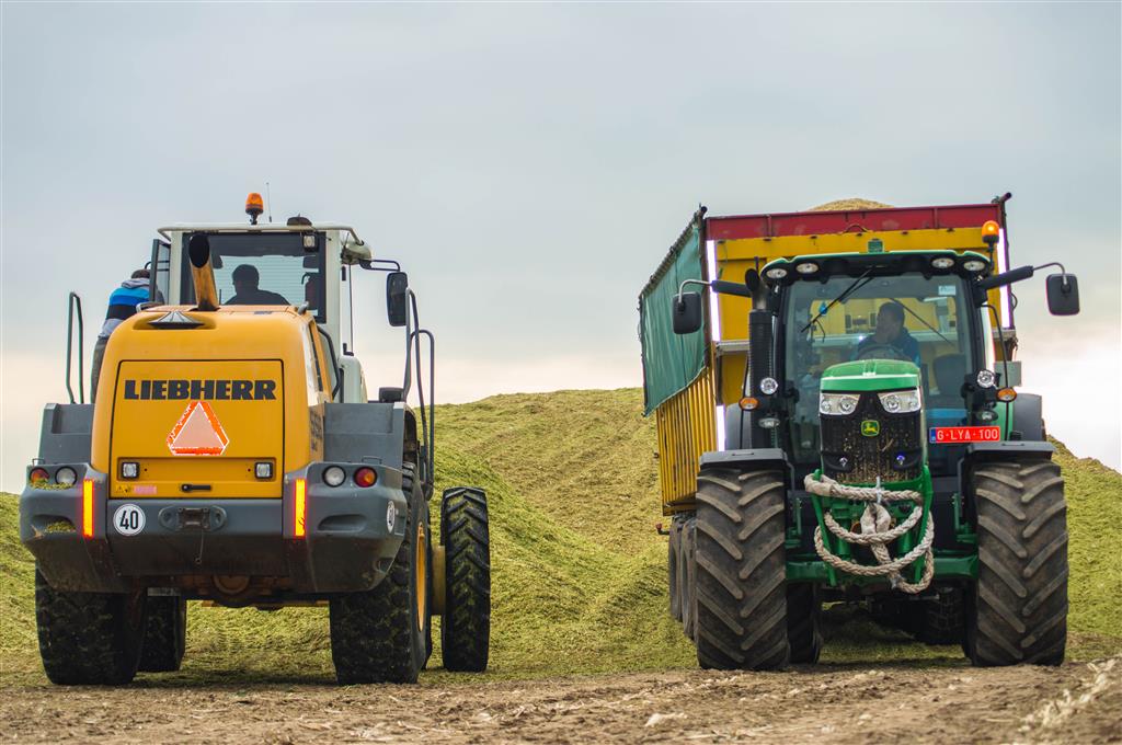 Loonbedrijf Gebr. Dewit, Loonbedrijf Geva Vandijck en Loonbedrijf Agroservice Partoens zijn mais aan het dumpen op een biogaskuil nabij Opitter (B). De kuil bij de installatie is nog niet klaar en daarom is er een kuil gemaakt op het veld. Partoens duwt de mais naar boven met hun Liebherr 556 2Plus2
