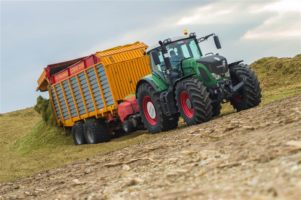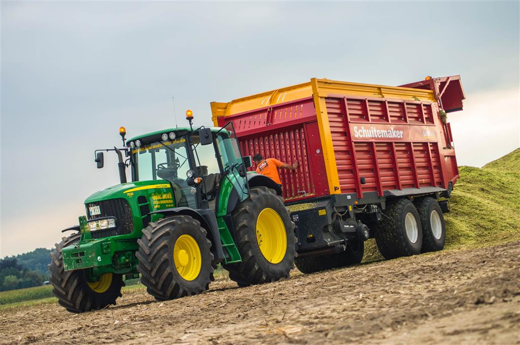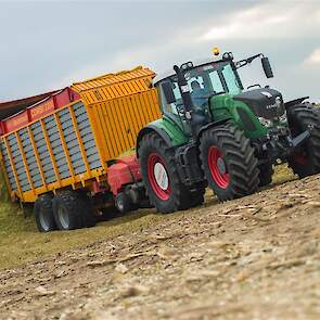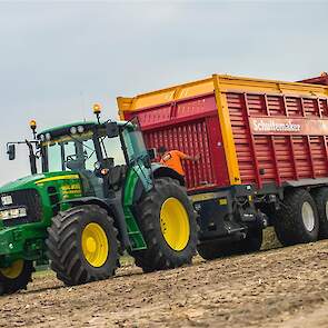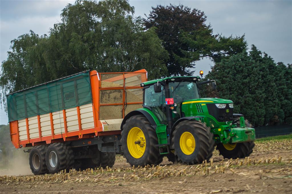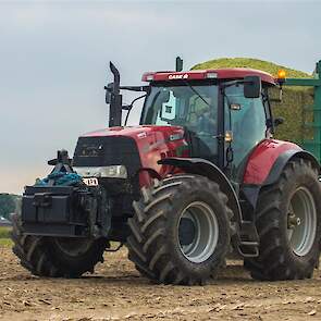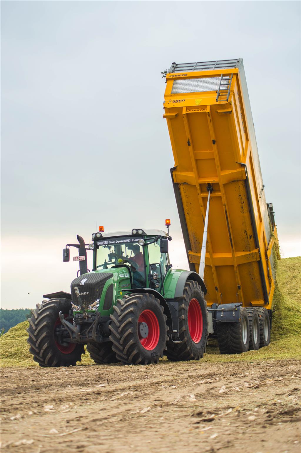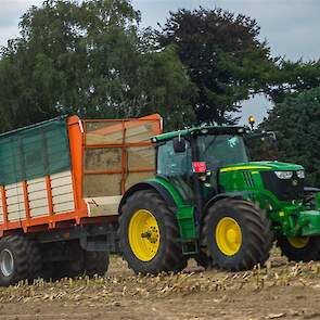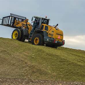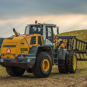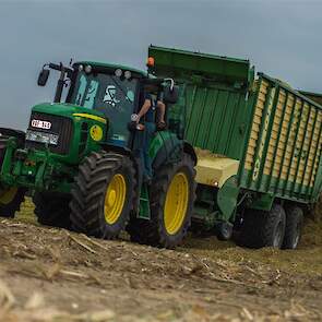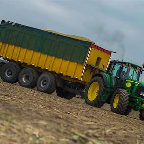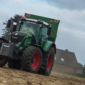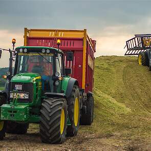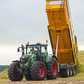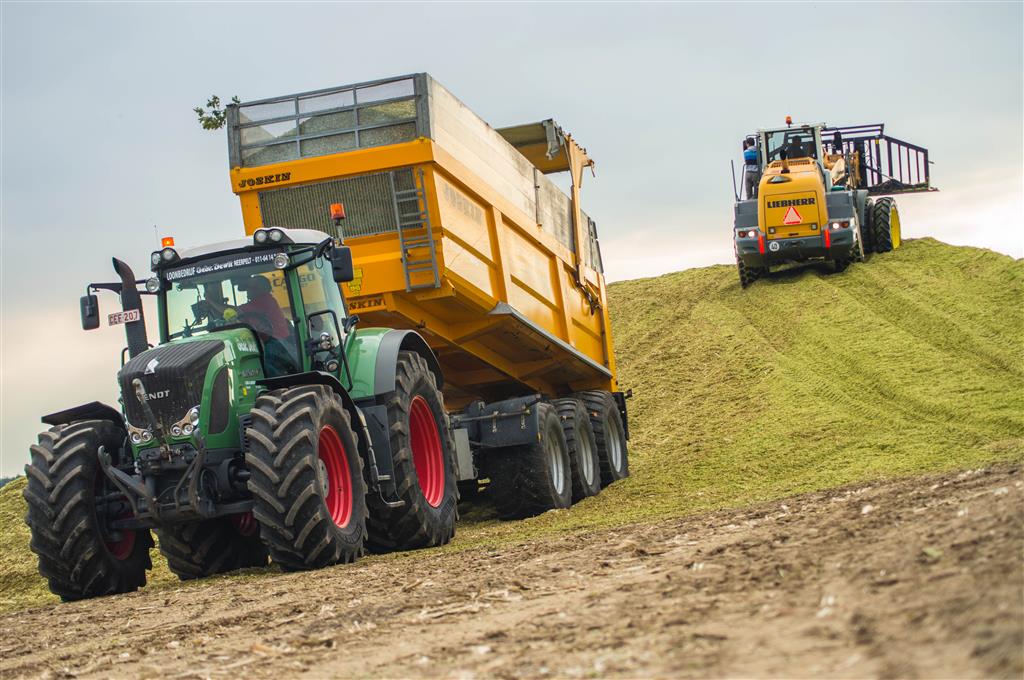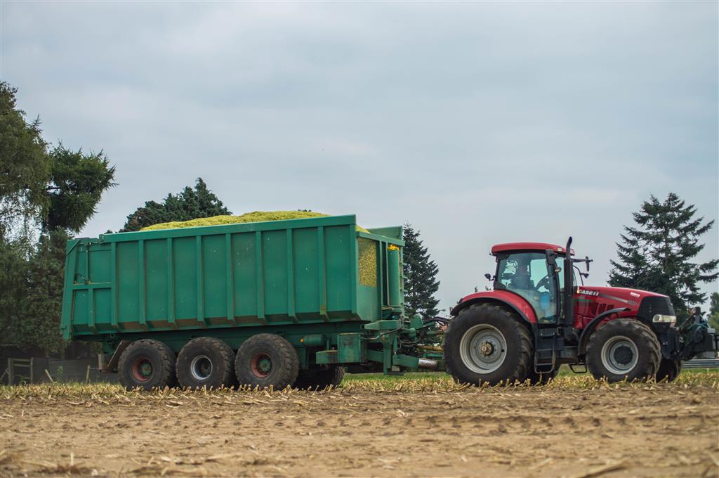 Loonbedrijf Gebr. Dewit, Loonbedrijf Geva Vandijck en Loonbedrijf Agroservice Partoens zijn mais aan het dumpen op een biogaskuil nabij Opitter (B). De kuil bij de installatie is nog niet klaar en daarom is er een kuil gemaakt op het veld. Partoens duwt de mais naar boven met hun Liebherr 556 2Plus2