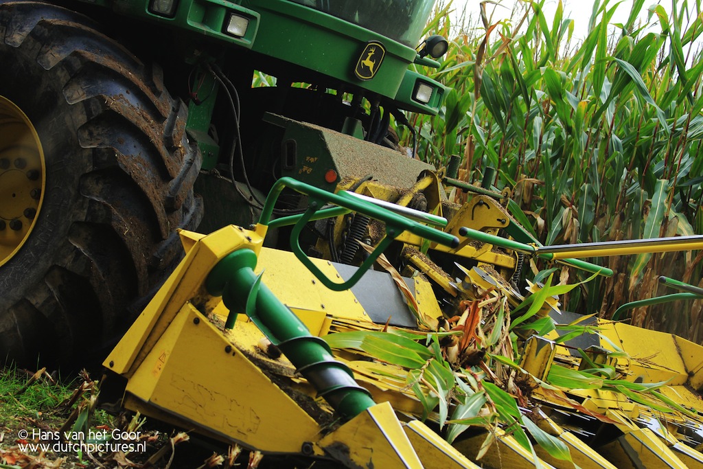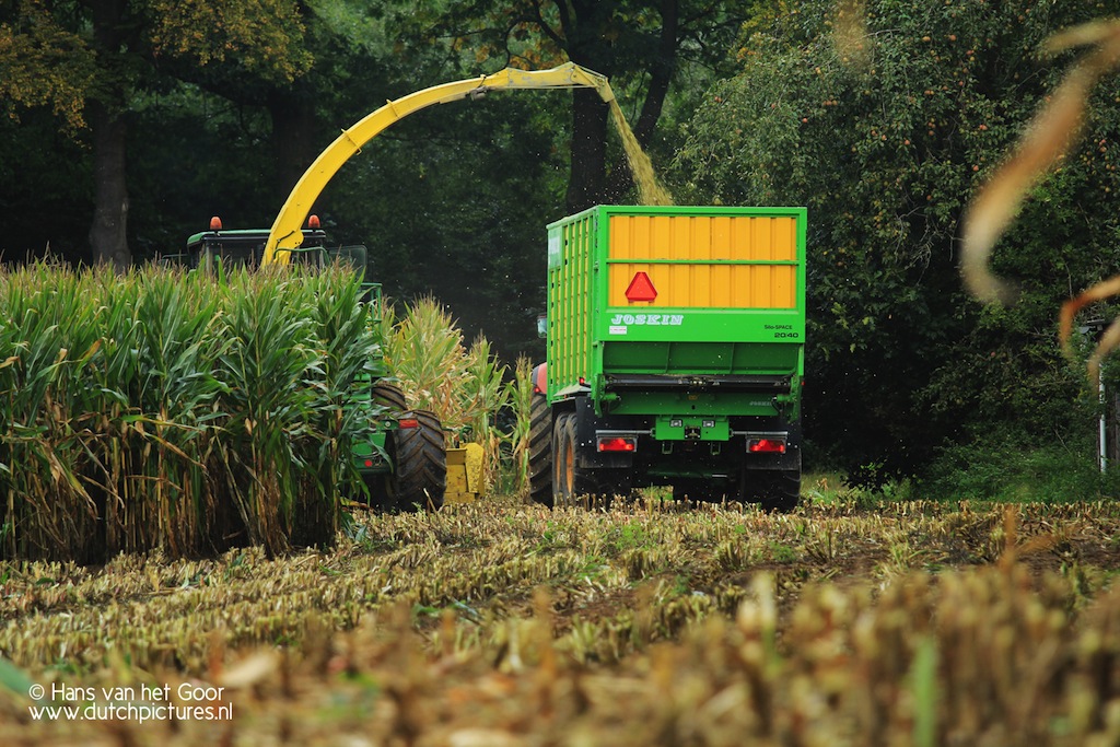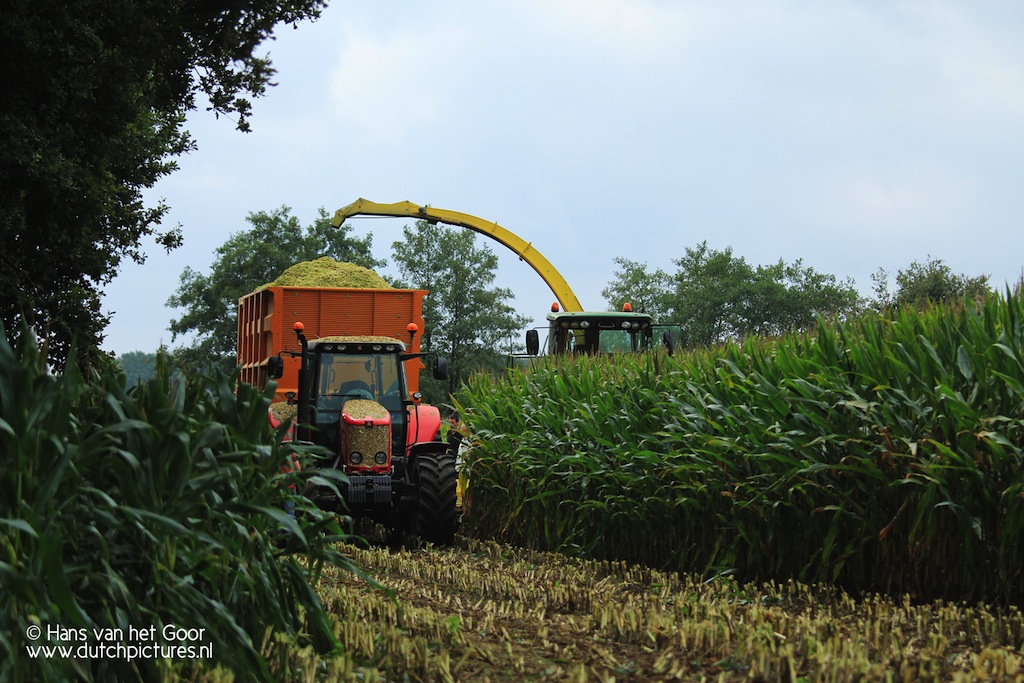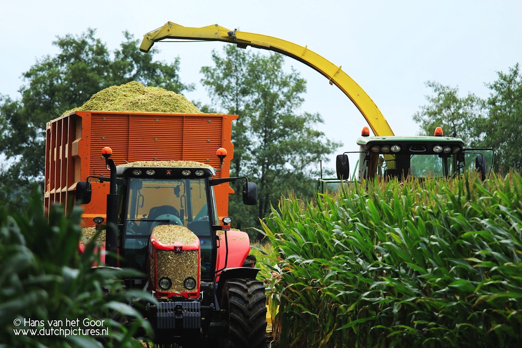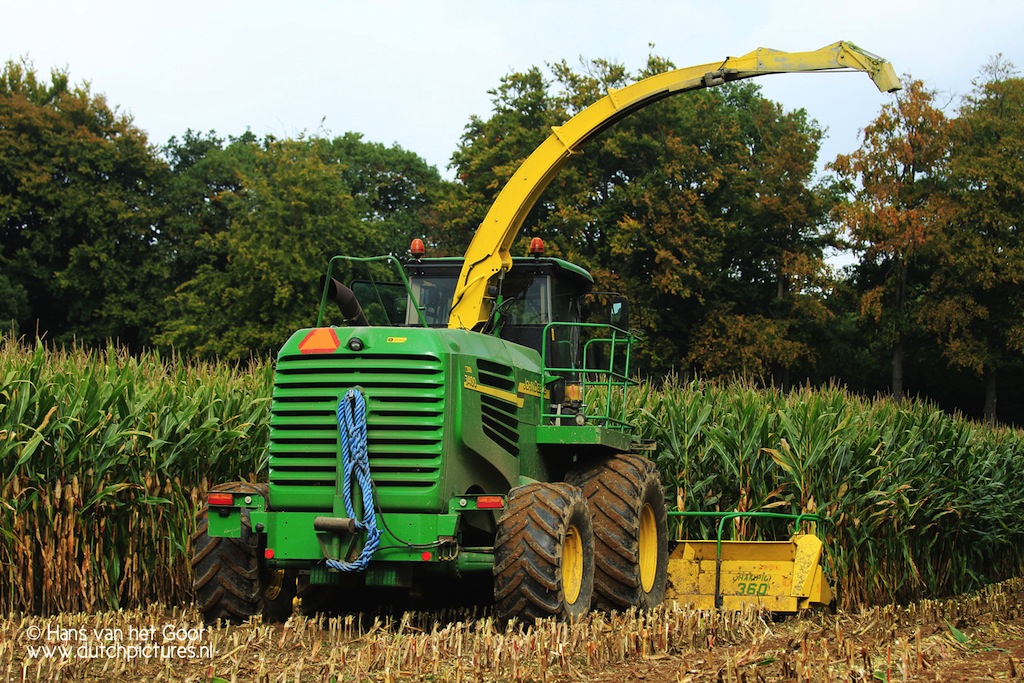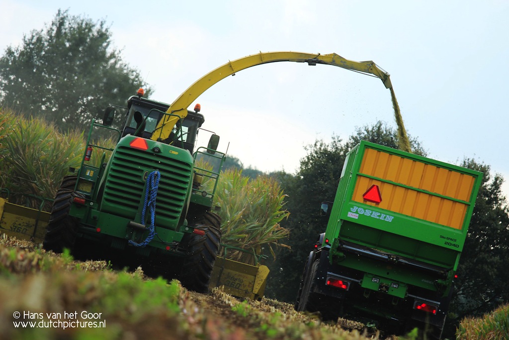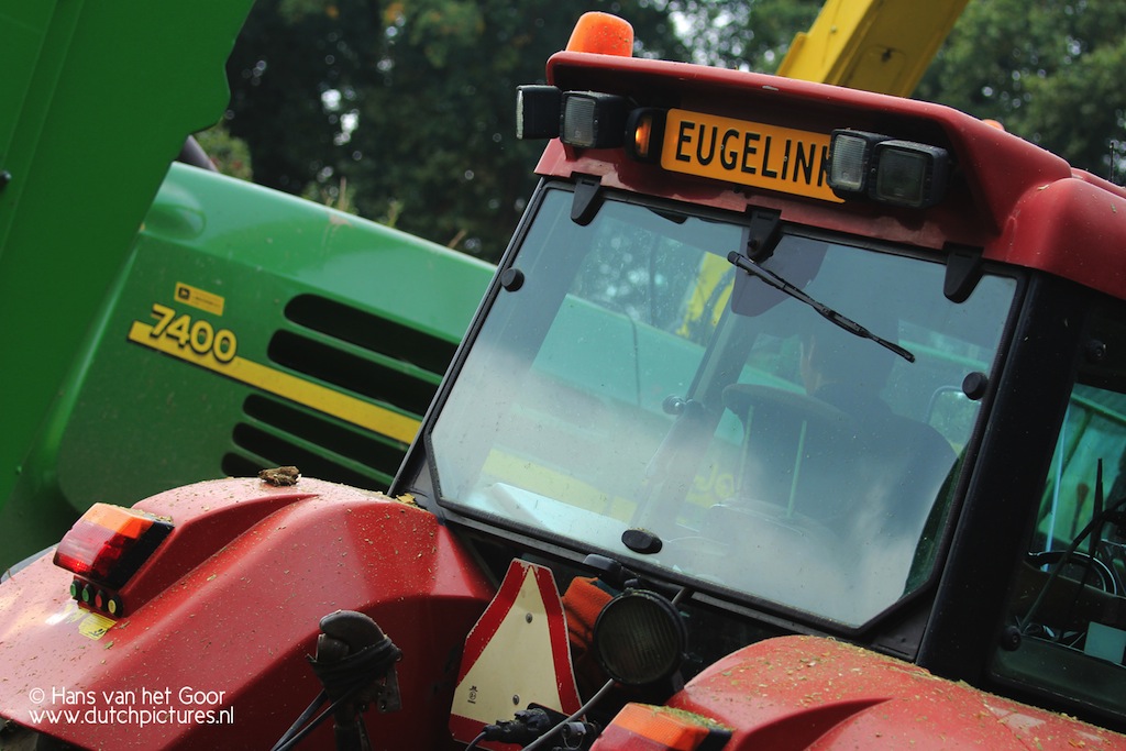 John Deere 7400 van Loonbedrijf Gebr. Eugelink uit Eldrik, aan het mais hakselen bij Laag-Keppel. Het transport werd gedaan door een New Holland T7030, een MF 6495 met Veenhuis, een Case CVX 170 met Joskin. Op de kuil een New Holland W130 shovel.