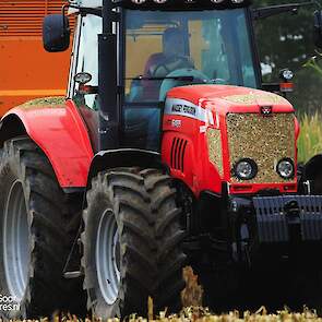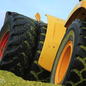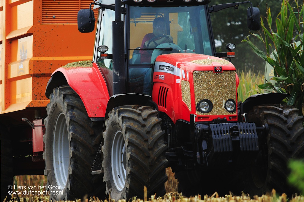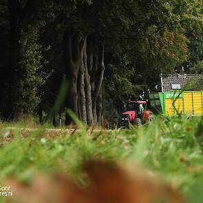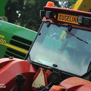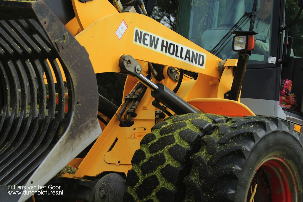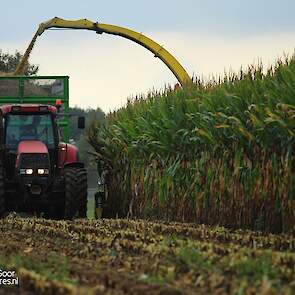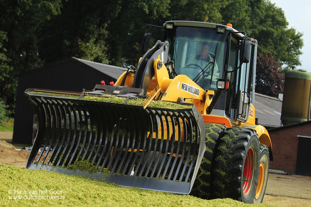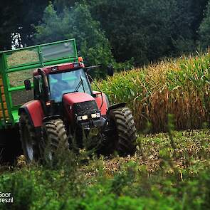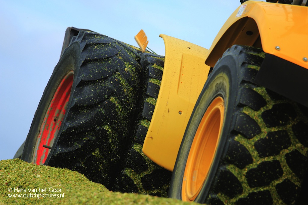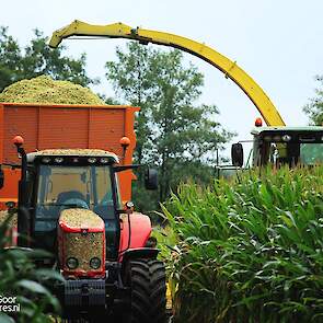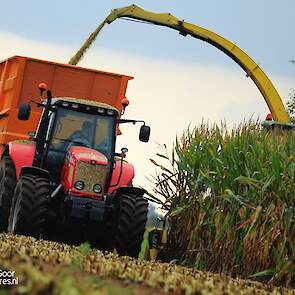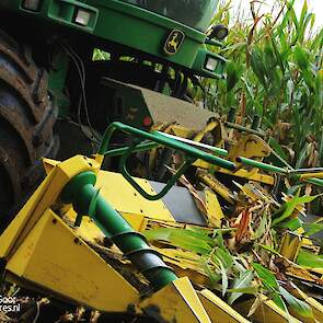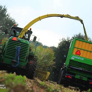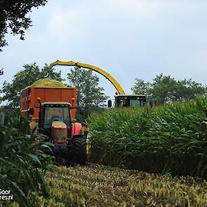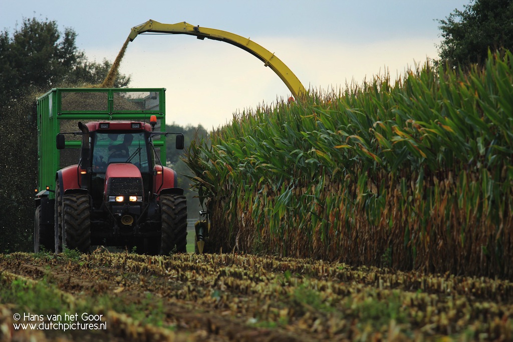 John Deere 7400 van Loonbedrijf Gebr. Eugelink uit Eldrik, aan het mais hakselen bij Laag-Keppel. Het transport werd gedaan door een New Holland T7030, een MF 6495 met Veenhuis, een Case CVX 170 met Joskin. Op de kuil een New Holland W130 shovel.