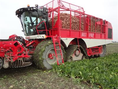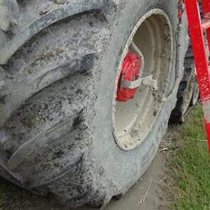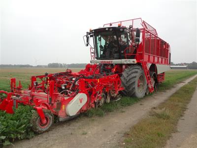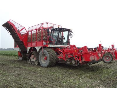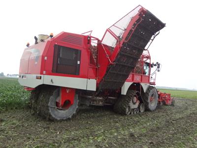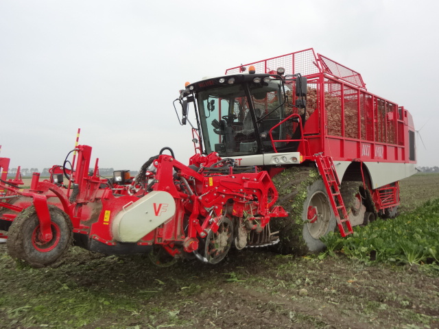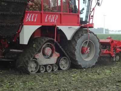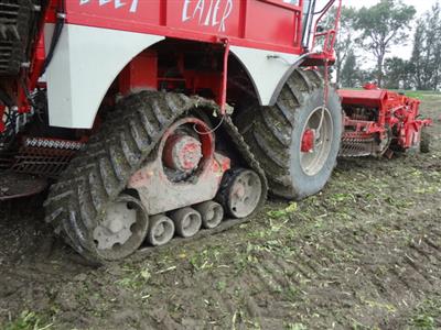 Vervaet 625 van Loonbedrijf Hopmans Wieringerwerf. Op de voorste as Michelin 900 CerexBib met luchtdrukwissel systeem en op de tweede as Zuidberg rups, bij transport over de weg wordt het rupstel opgetrokken zodat machine alleen op banden rijdt