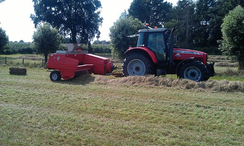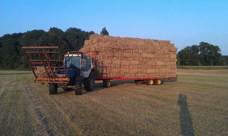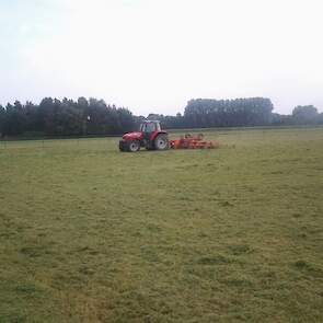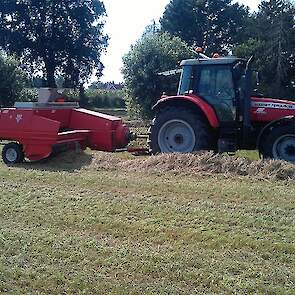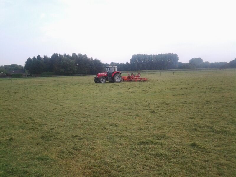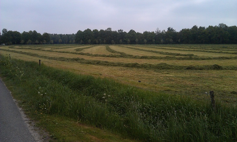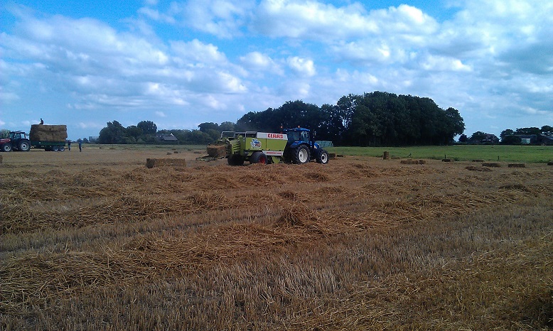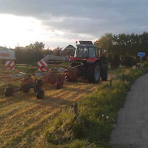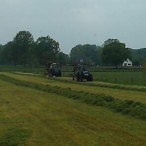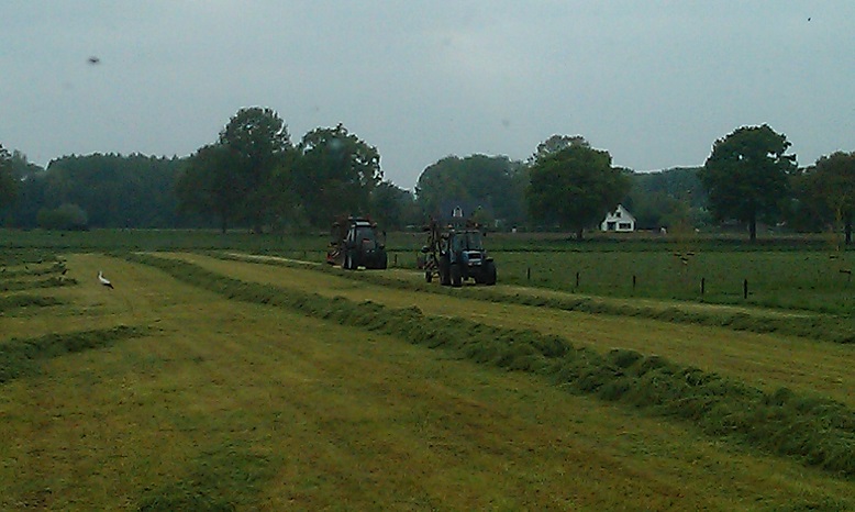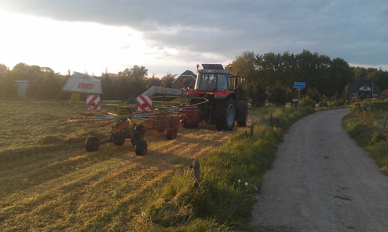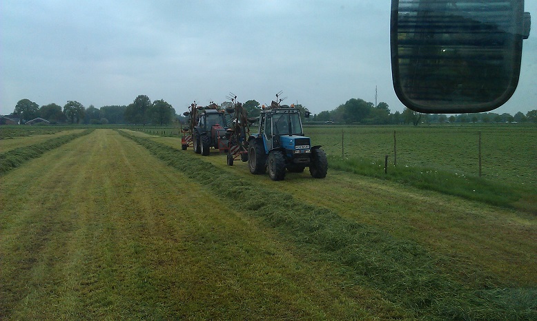 Door het koude, natte voorjaar heeft de Fam. Hulscher in pinksterweekend de 1e snede binnen gehaald. In de droge periode die volgde hebben ze nog enige balen hooi kunnen maken en een tijd aan het beregenen geweest.