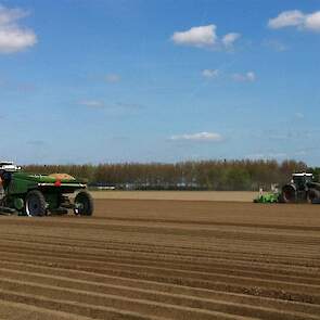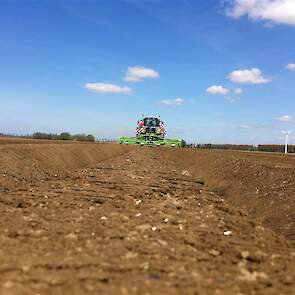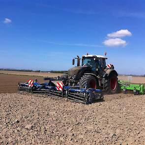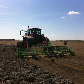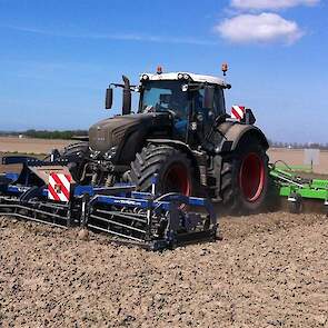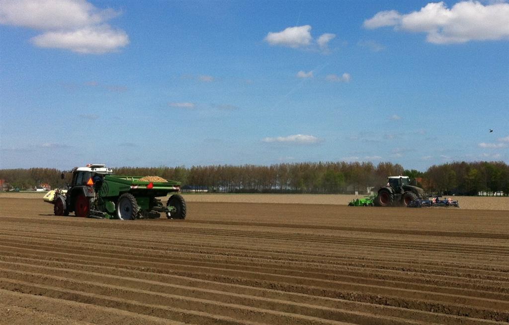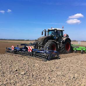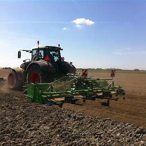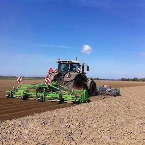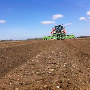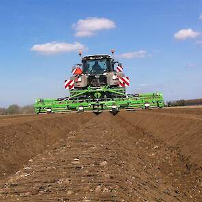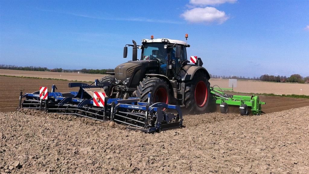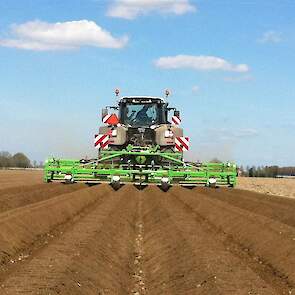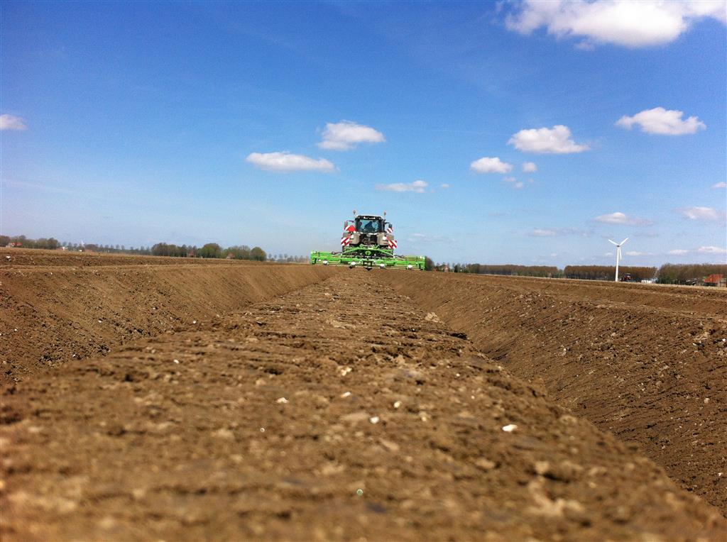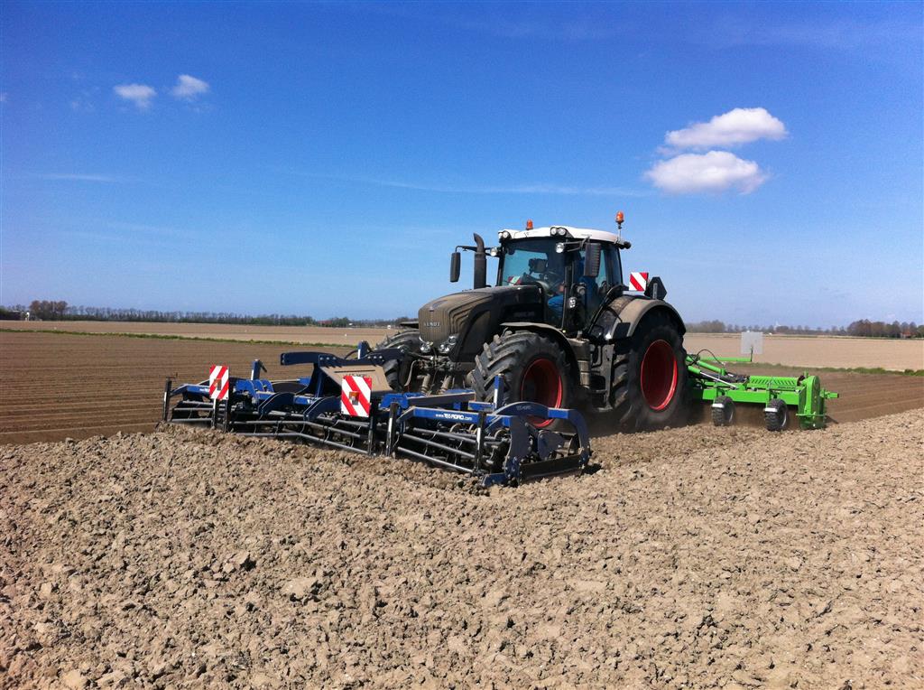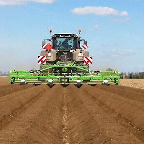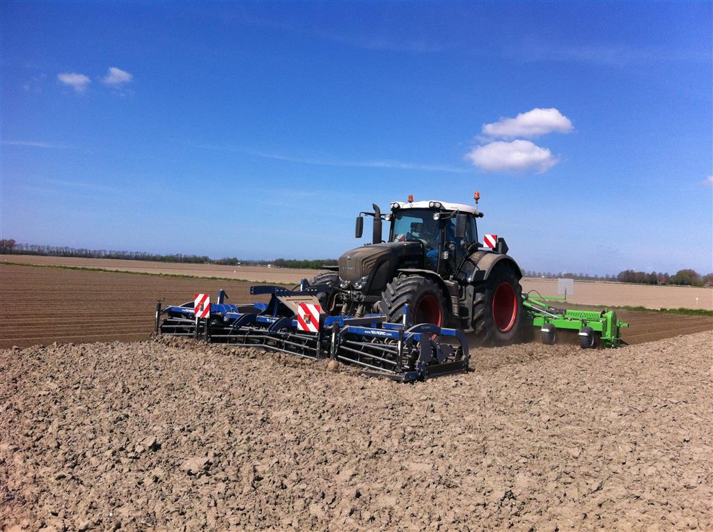 Gebr. De Zeeuw uit Emmeloord-Nagele frezen dit jaar hun aardappelland met een AVR Ge-force frees. De zes meterse frees freest in een keer 8 ruggen op voor de 2 4-rijige pootmachines. De frees met tandwielaandrijving aan beide zijden loopt mooi rustig achter de Fendt 936. Voor transport is de frees opklapbaar.