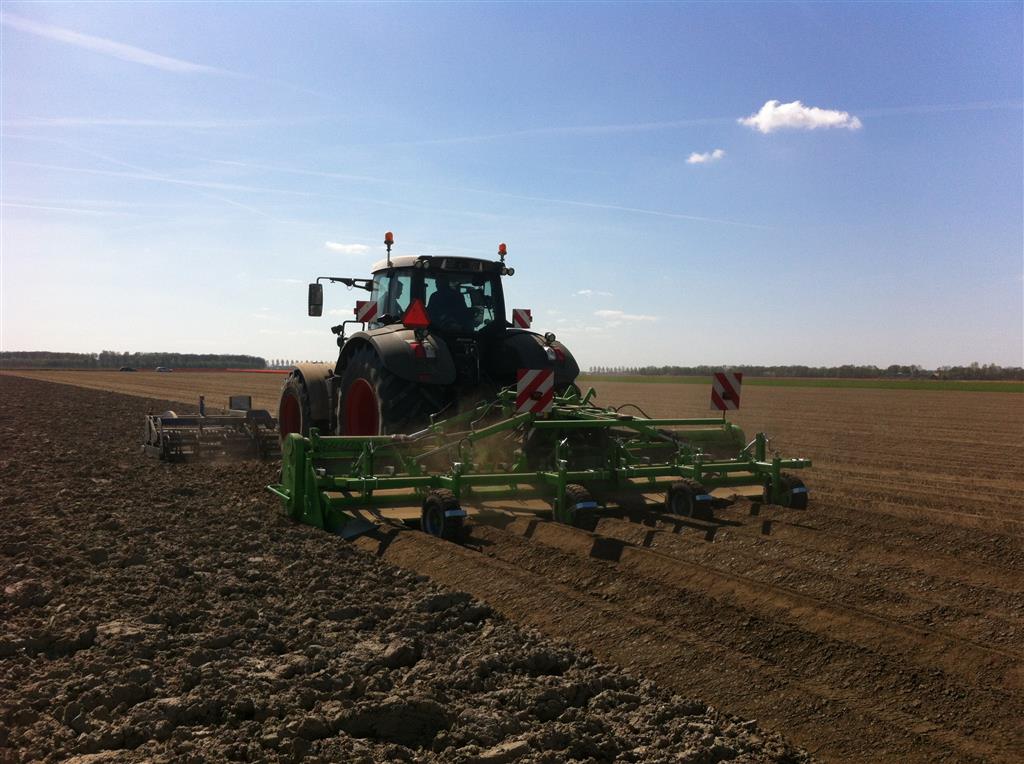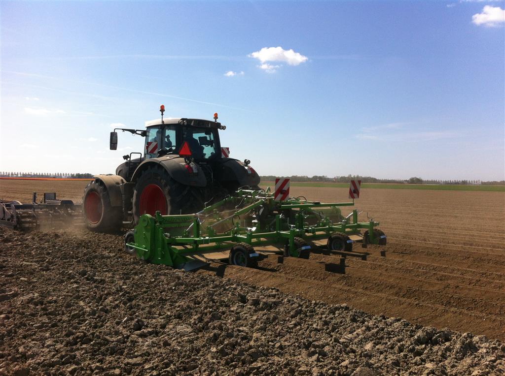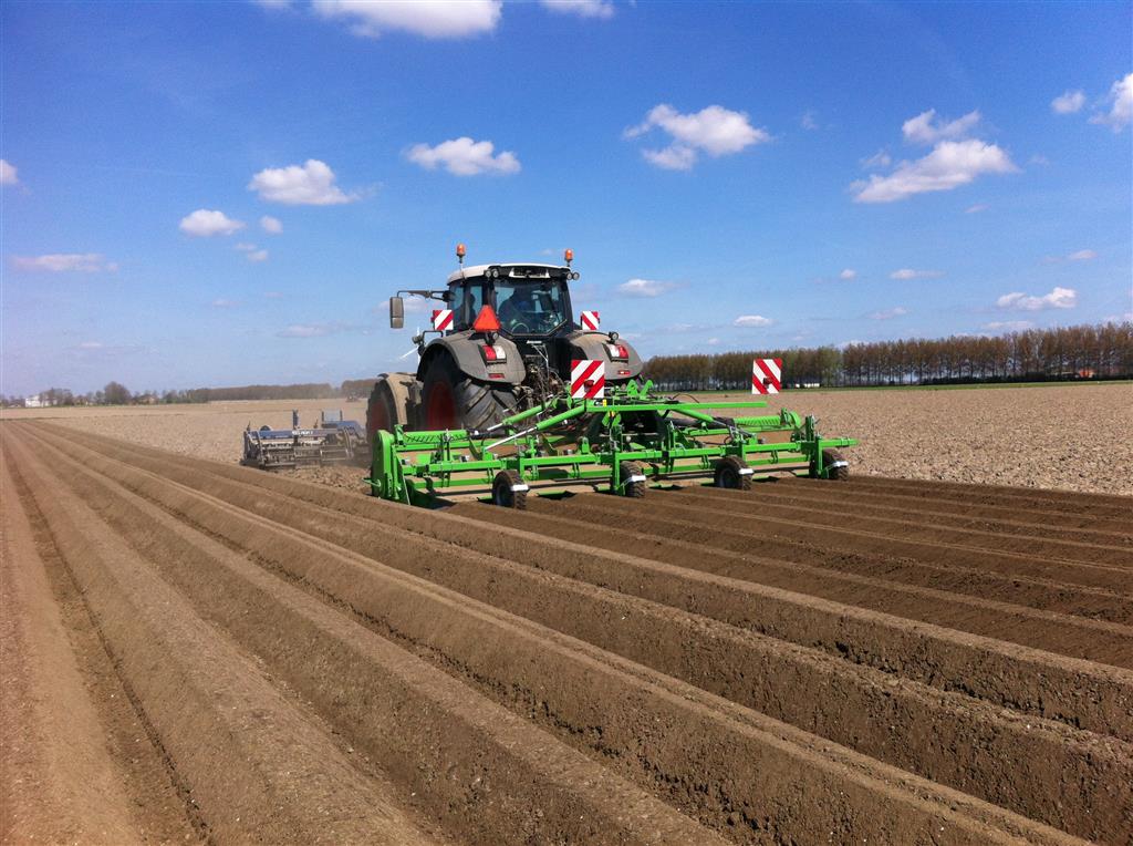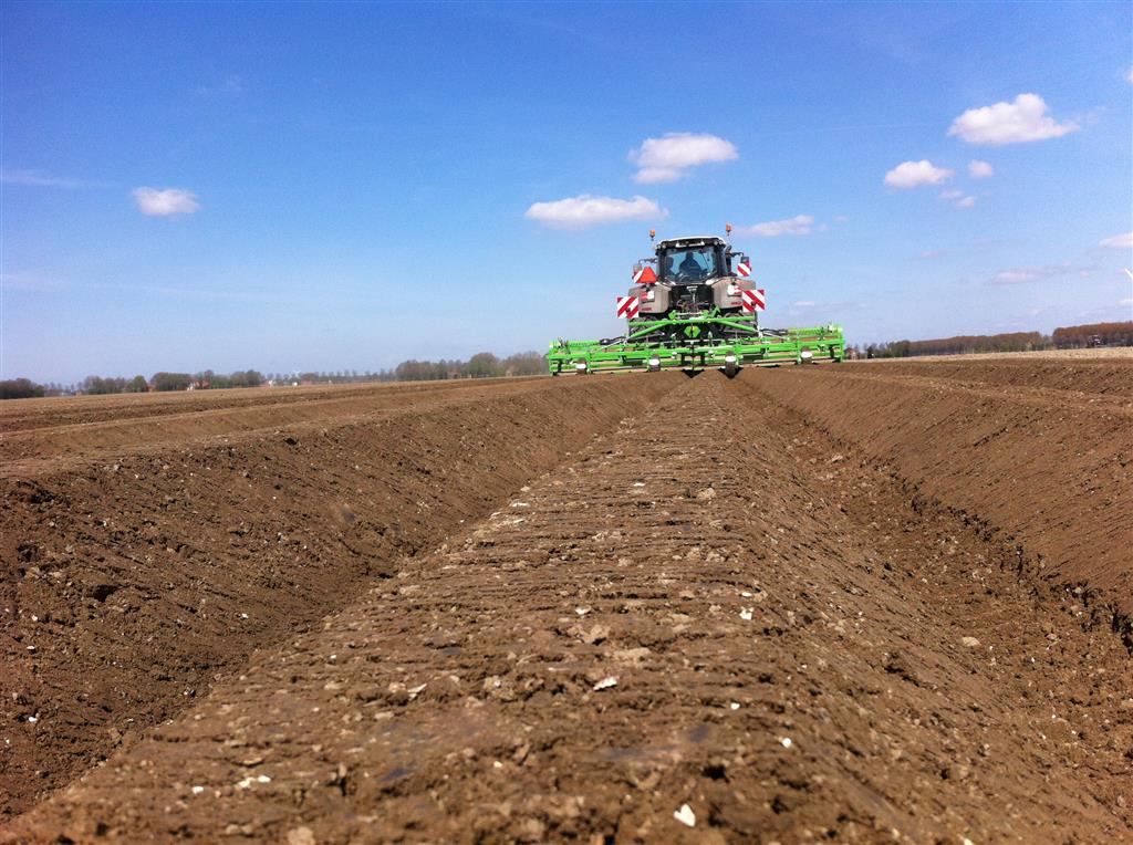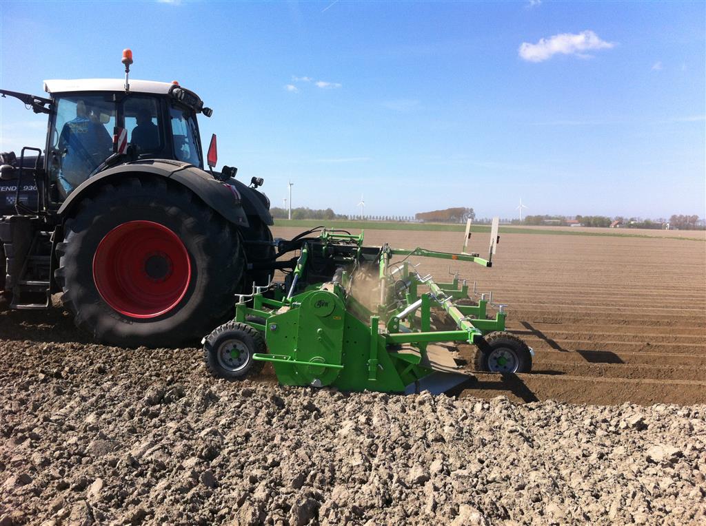 De frees is uitgerust met het 6 haaks systeem wat de grond goed zeer goed verkruimeld en op de juiste diepte om bij het poten met de aanaardkap voldoende losse grond te hebben voor een mooie rugopbouw. Trekker en frees worden gestuurd d.m.v. GPS wat resulteert in mooie rechte ruggen.