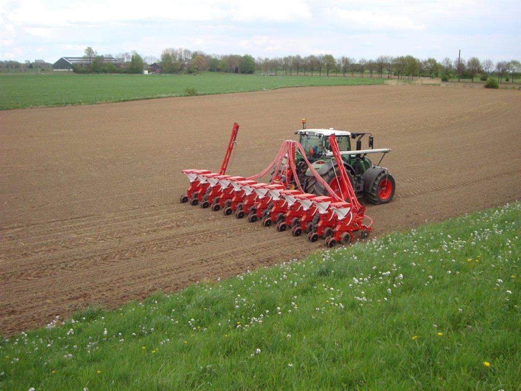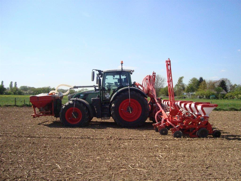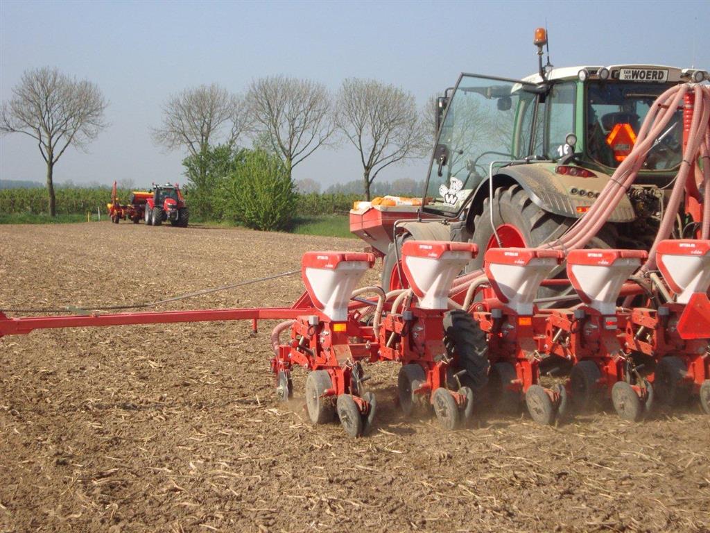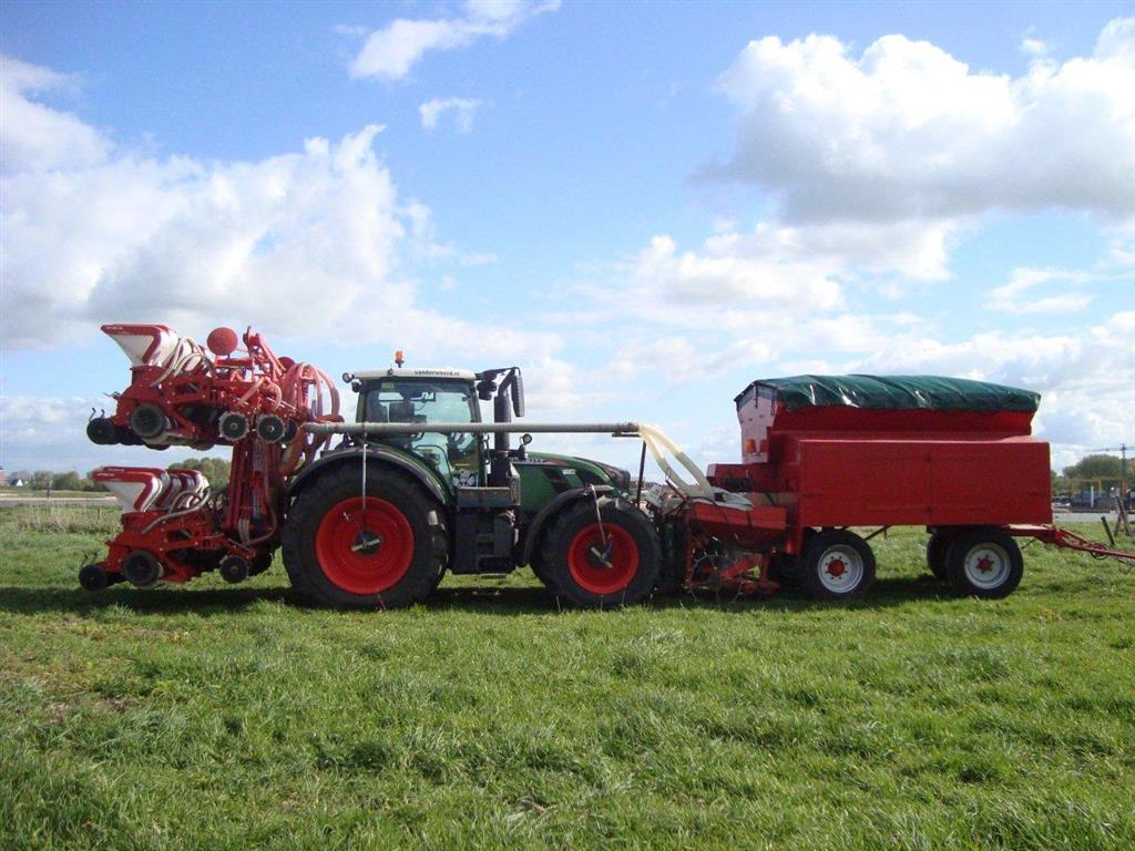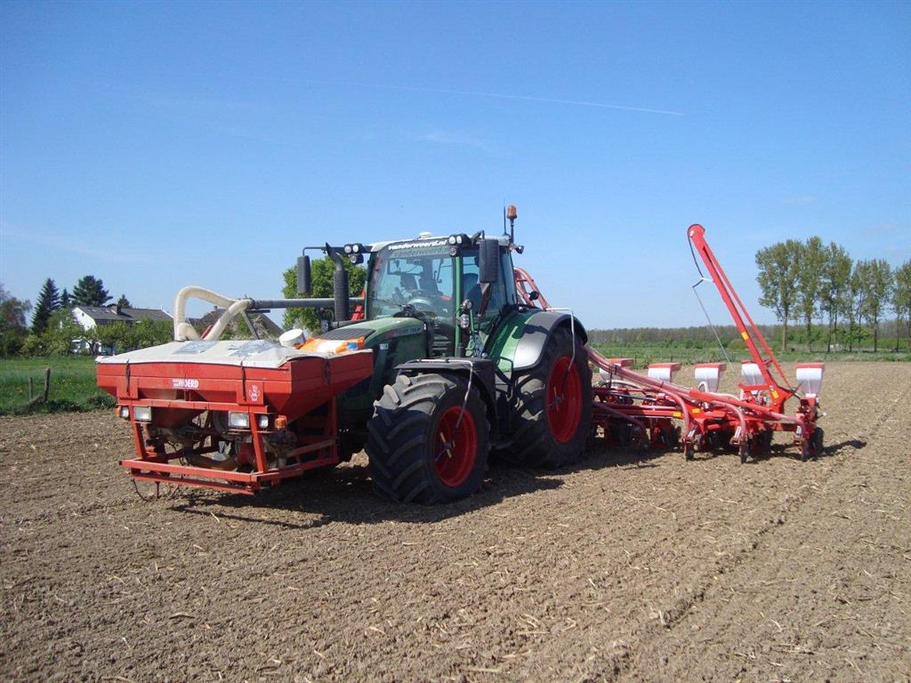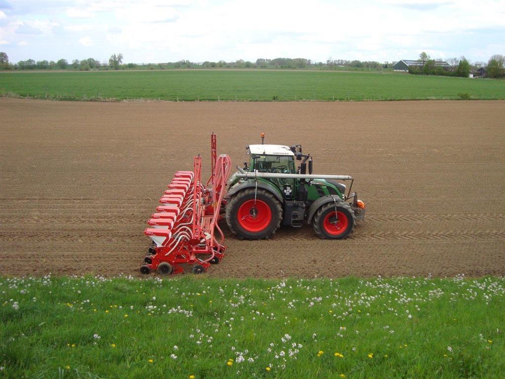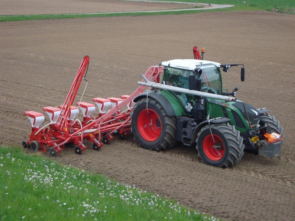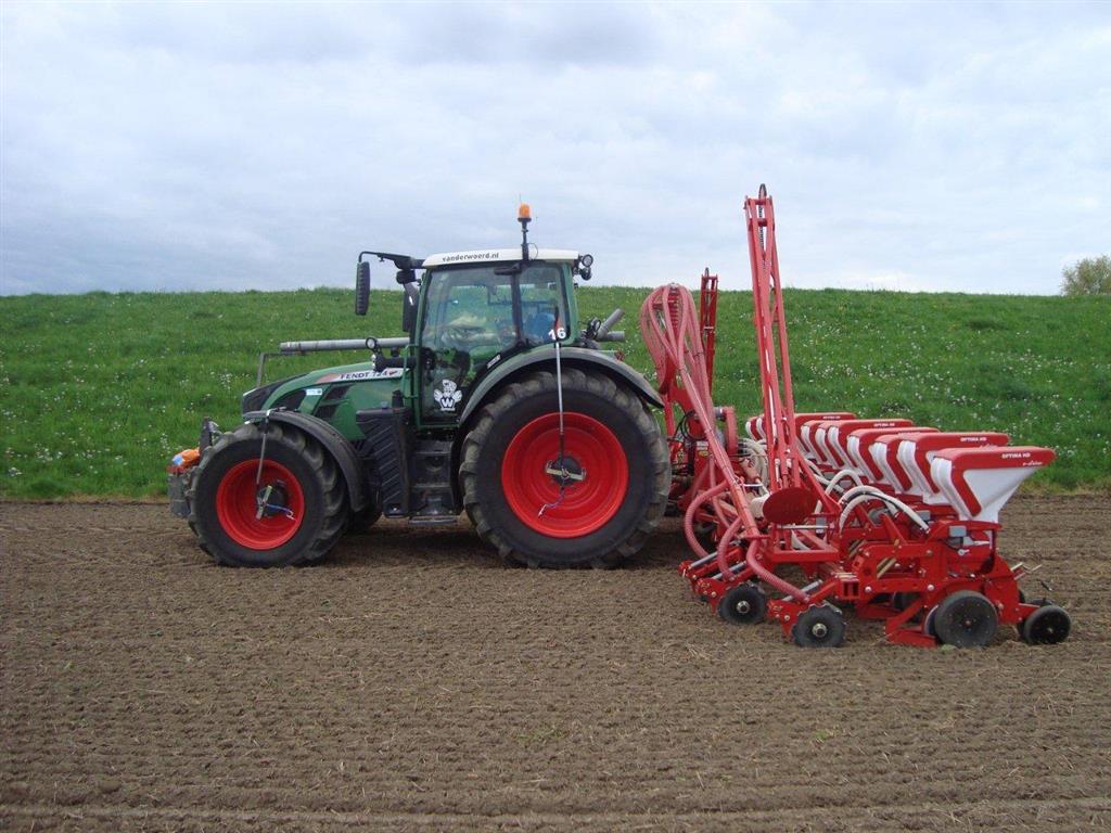 Loonbedrijf van der Woerd aan het maiszaaien met de Fendt 724