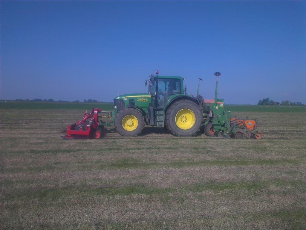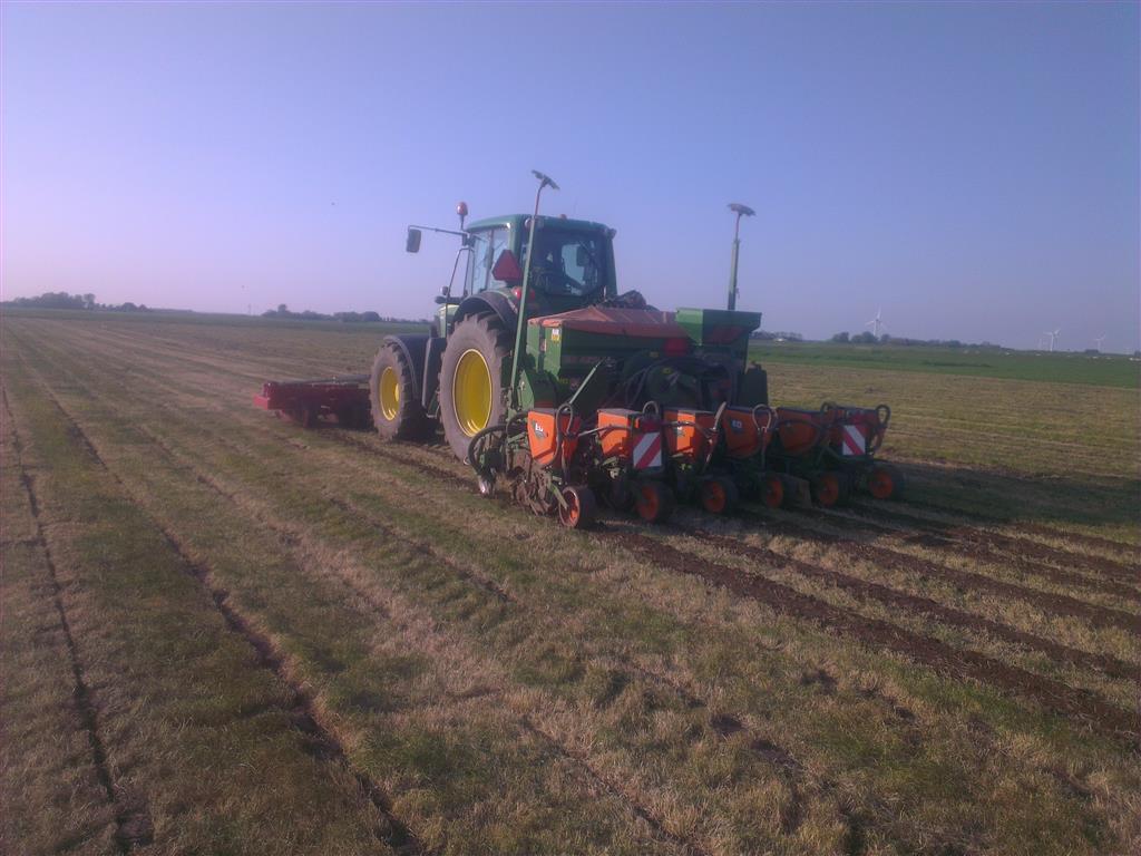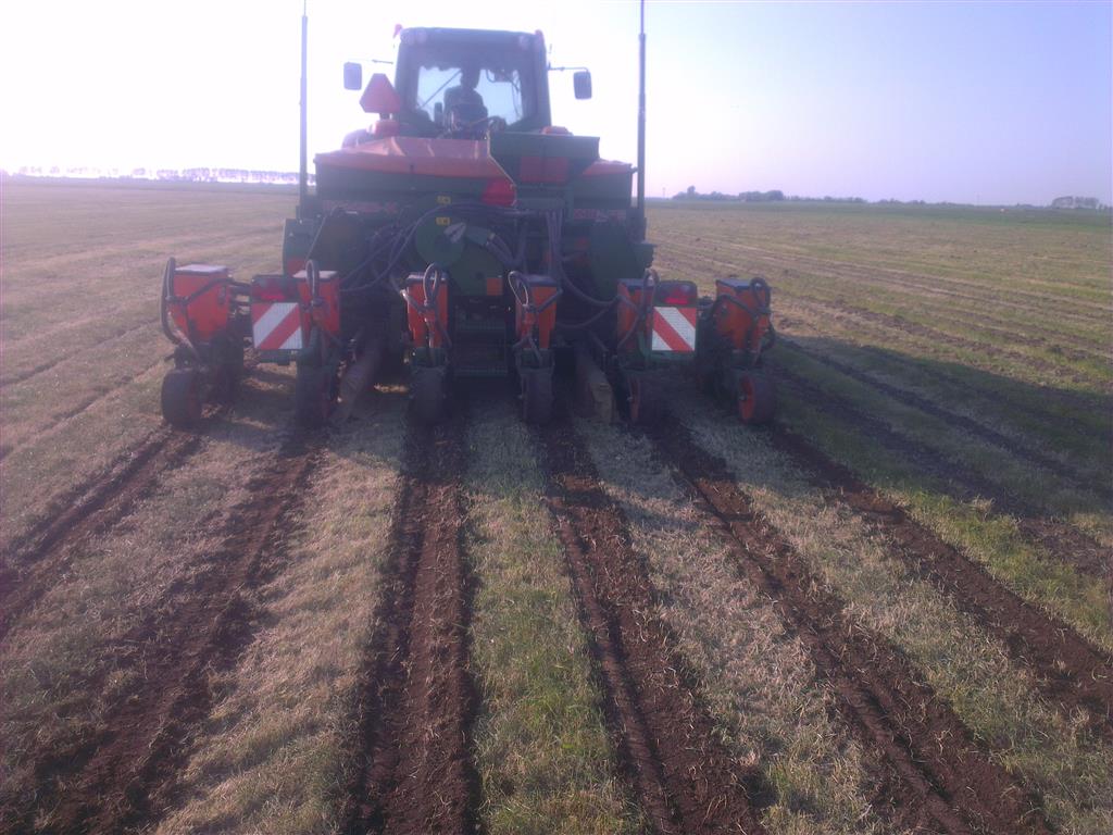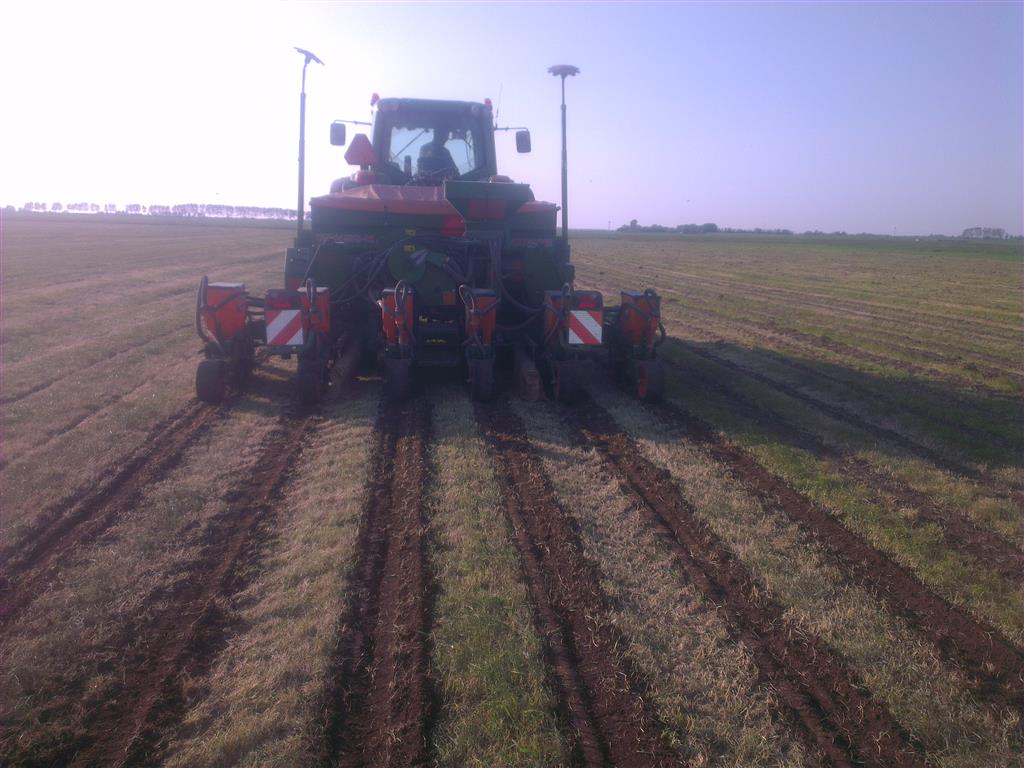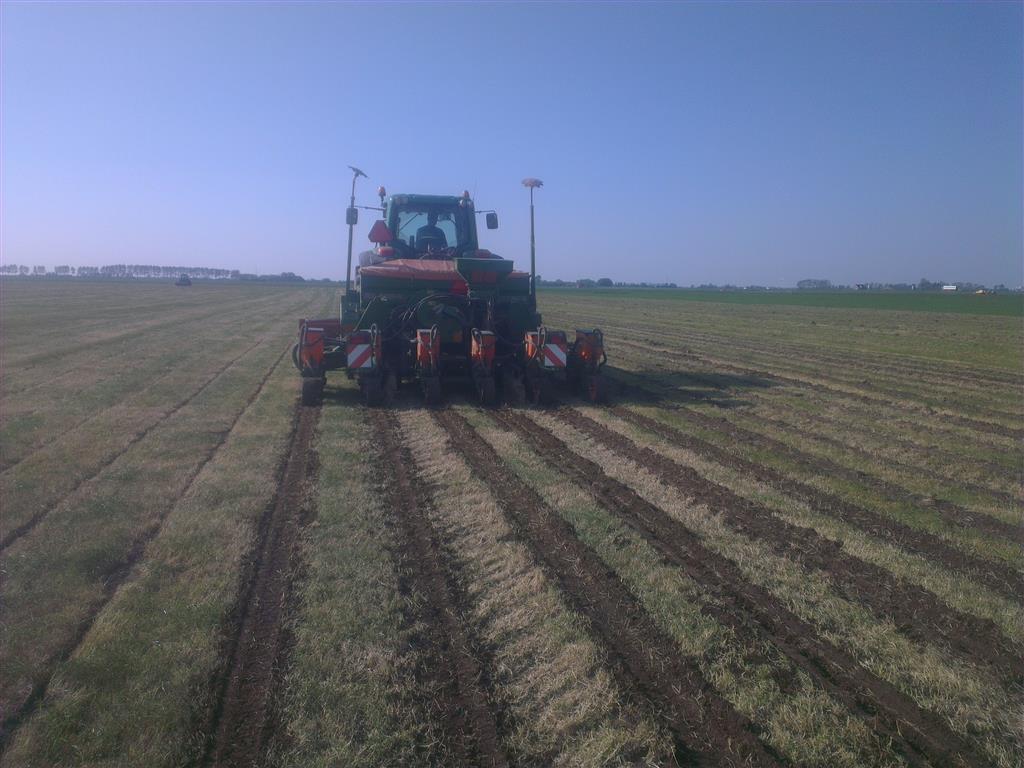 Loonbedrijf gebr. Buma aan het strokenbemesten op 75 cm op GPS, en daarna strokenfrezen en maiszaaien. Het frezen en zaaien gaat in een werkgang en komt op de plaats waar de mest zit