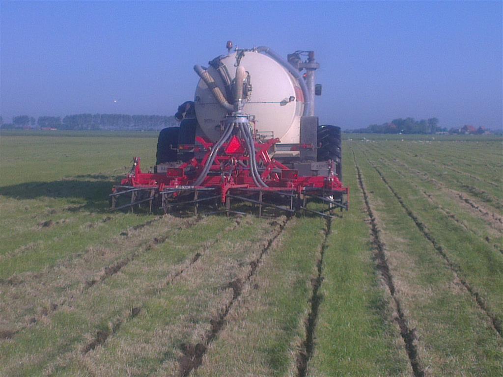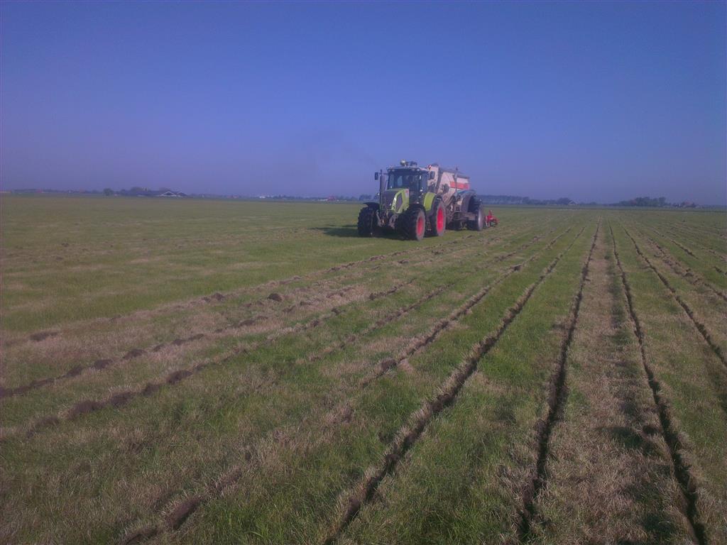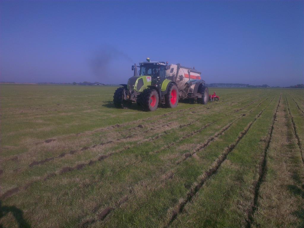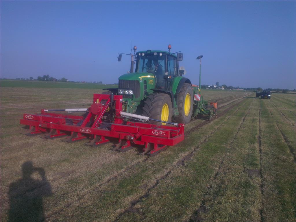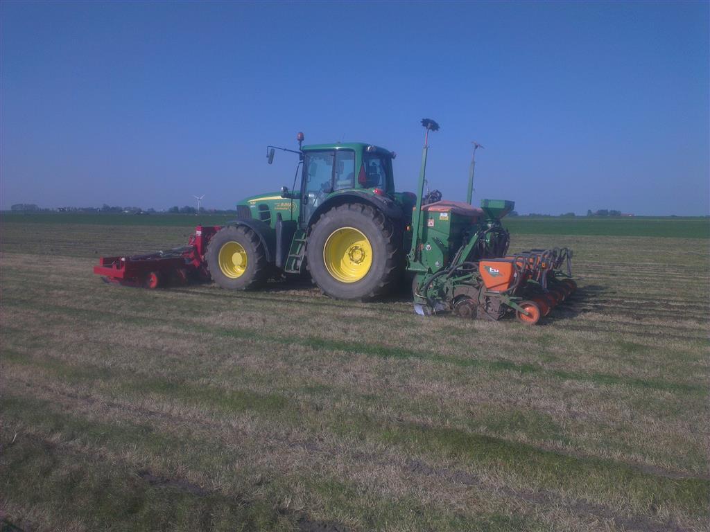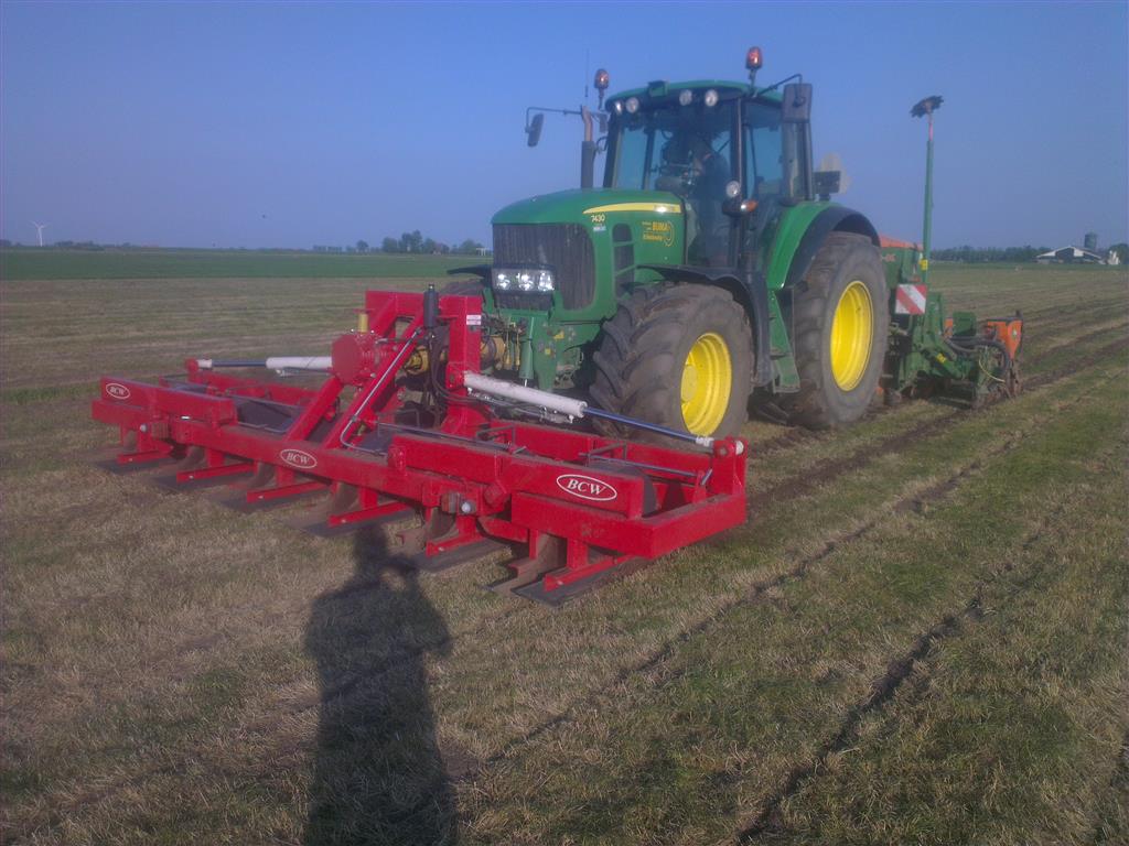 Loonbedrijf gebr. Buma aan het strokenbemesten op 75 cm op GPS, en daarna strokenfrezen en maiszaaien. Het frezen en zaaien gaat in een werkgang en komt op de plaats waar de mest zit