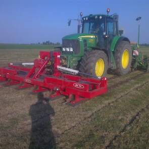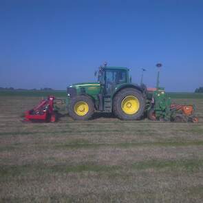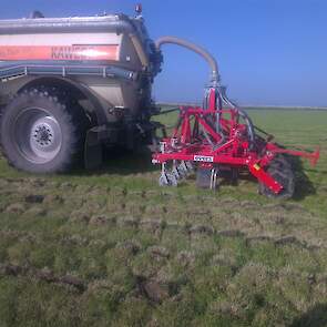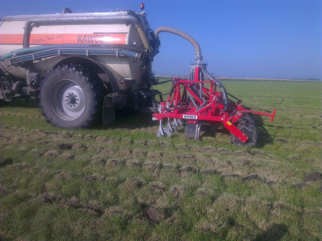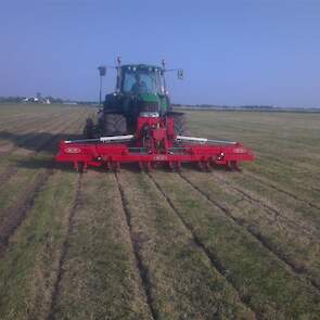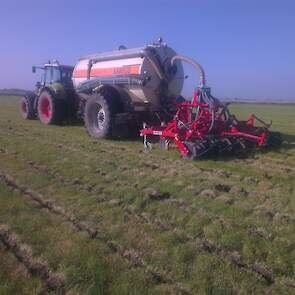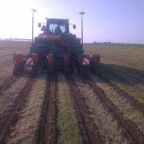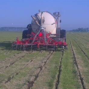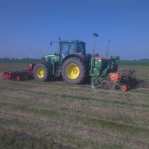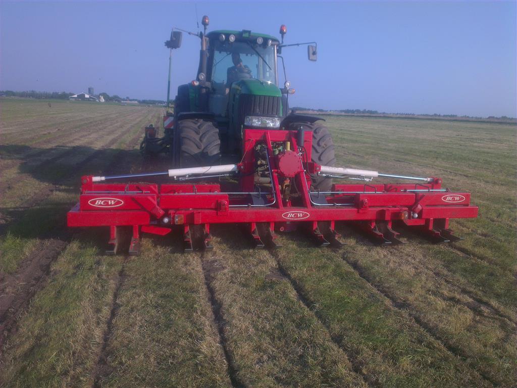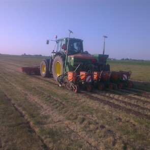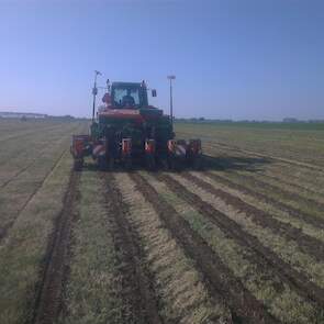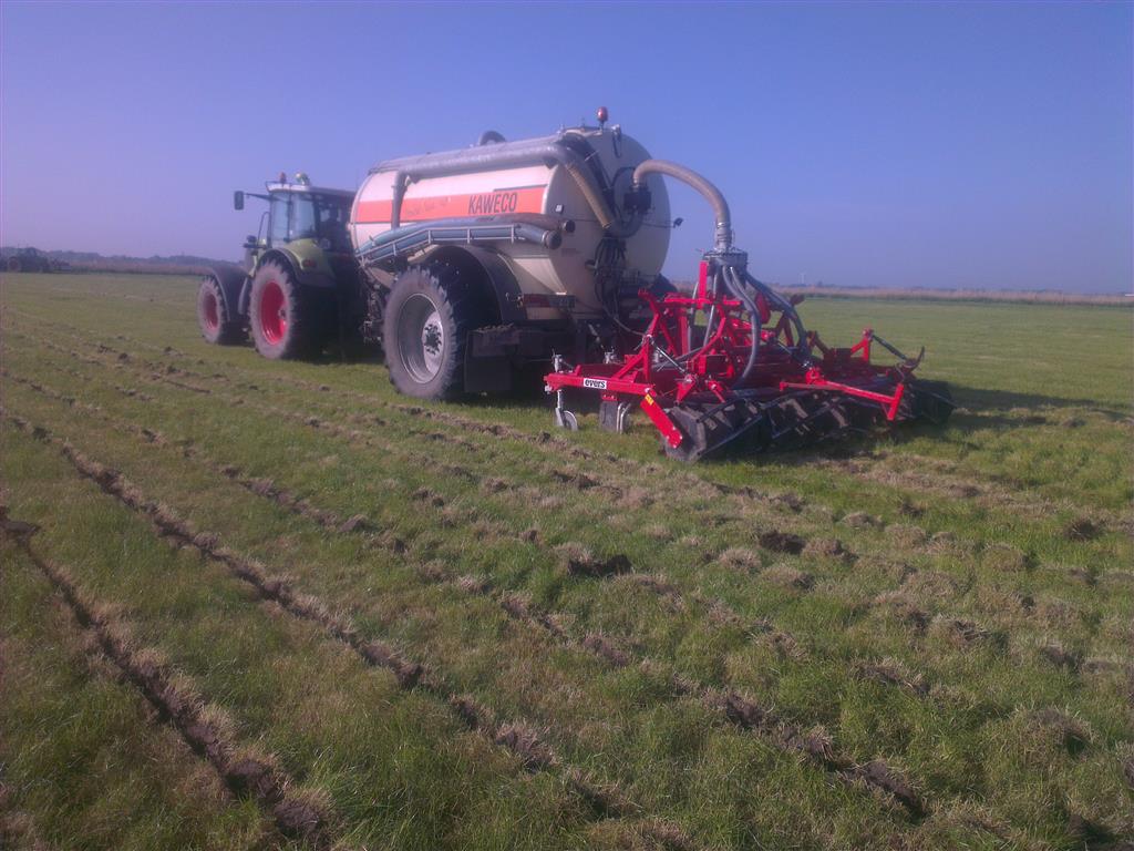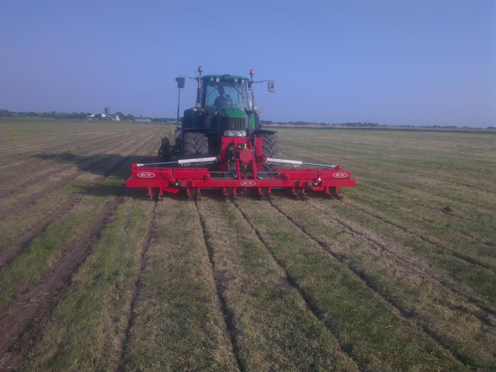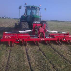 Loonbedrijf gebr. Buma aan het strokenbemesten op 75 cm op GPS, en daarna strokenfrezen en maiszaaien. Het frezen en zaaien gaat in een werkgang en komt op de plaats waar de mest zit