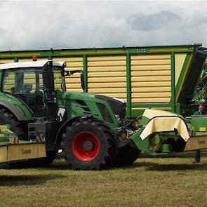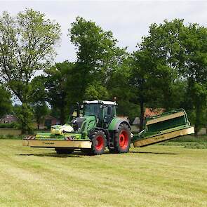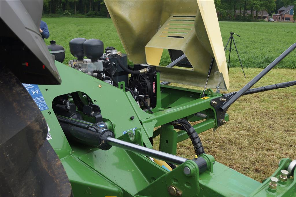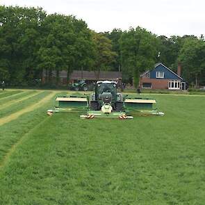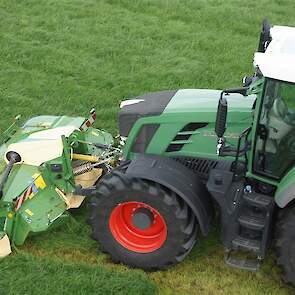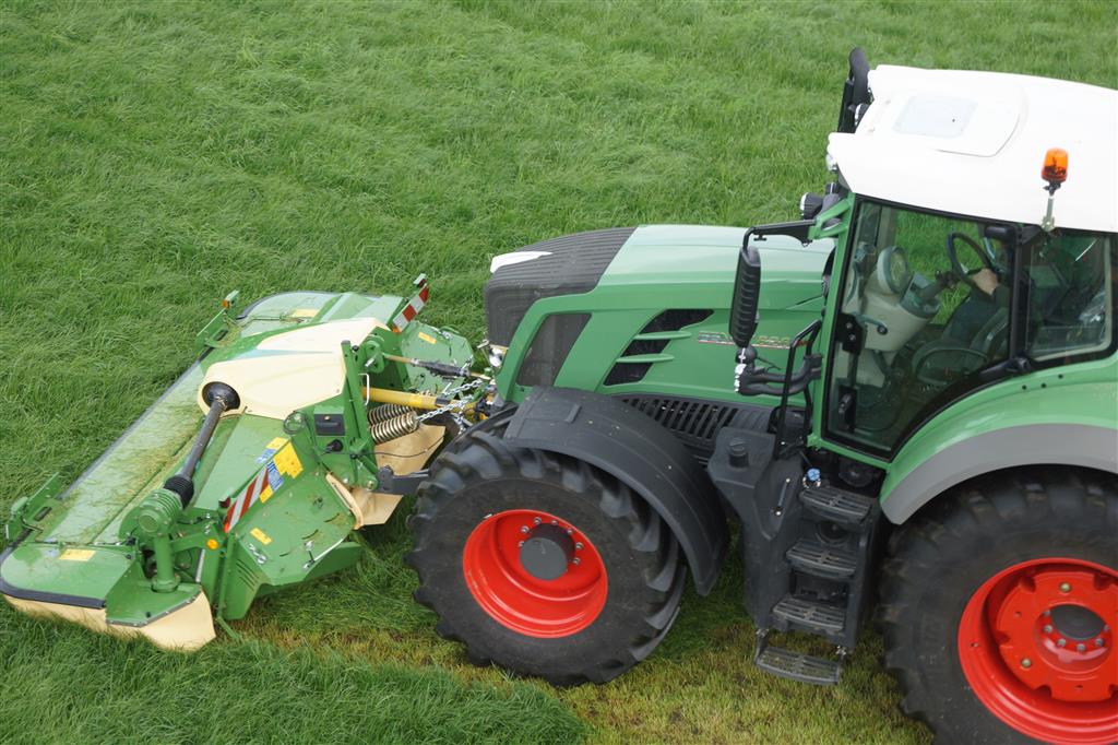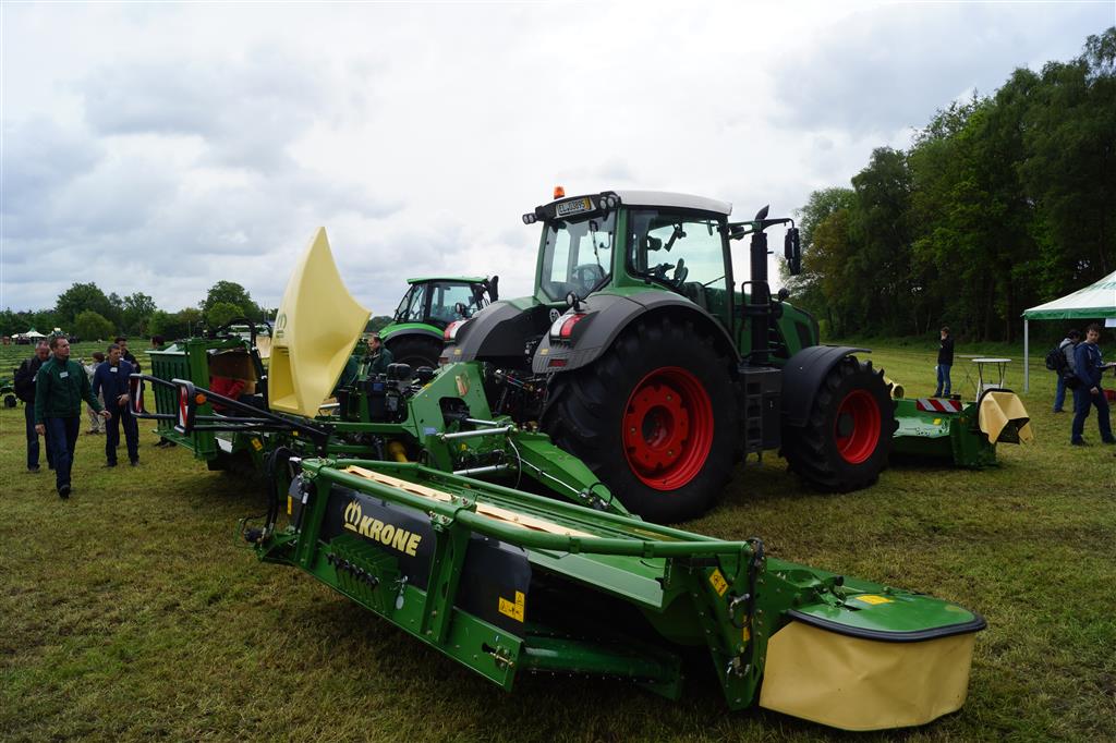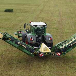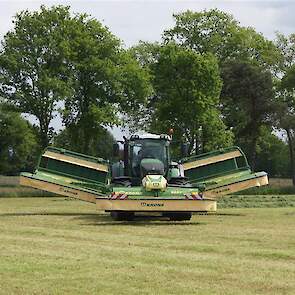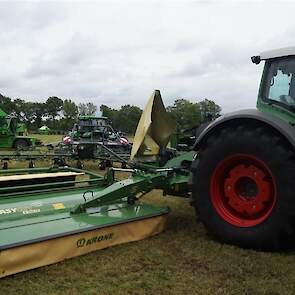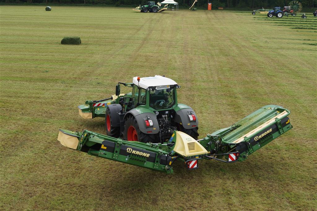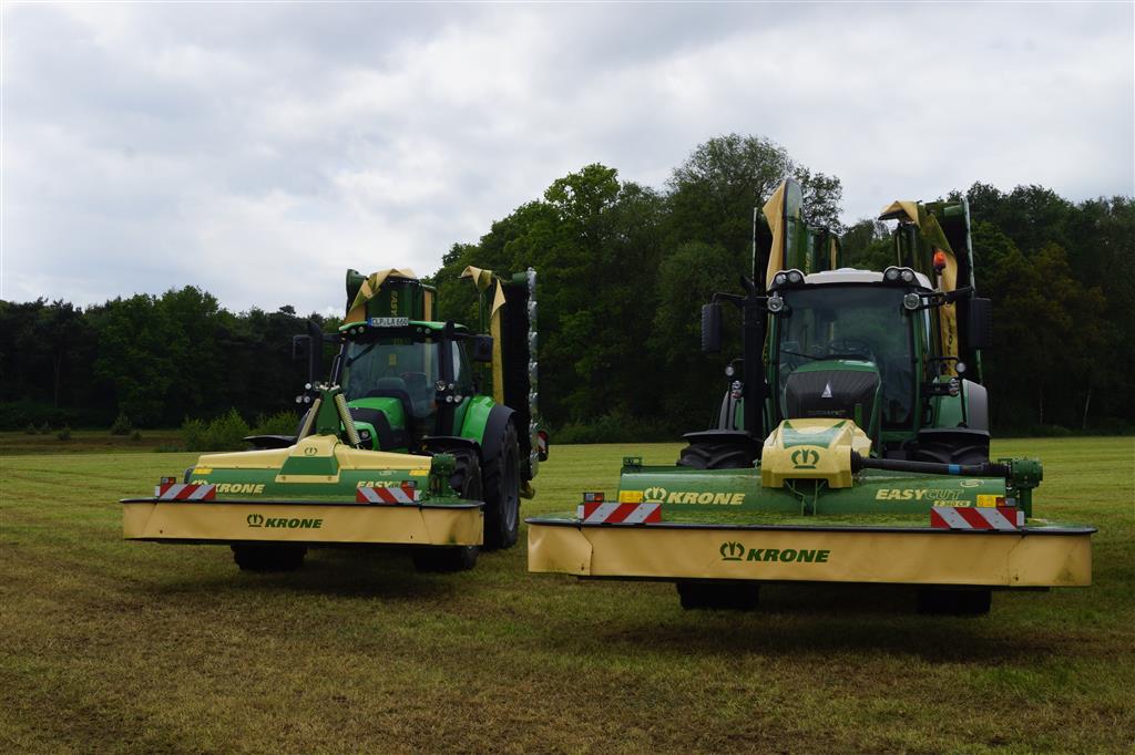 Het gaat hier om de nieuwe maaiers van Krone namelijk de EasyCut B 1000 CR Collect 9,30-10,10 meter werkbreedte en in de front de EasyCut F 360 CR 3,60 meter werkbreedte