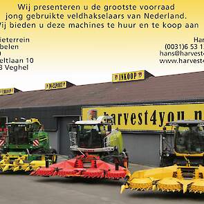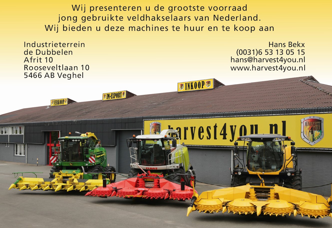 Harvest 4 You is specialist en leverancier in jong gebruikte oogstmachines, zoals veldhakselaars en combines, evenals alle mogelijke voorzetstukken.zij voeren onder andere de merken Claas, New Holland, John Deere, Fendt en Krone. Vanuit Nederland opereert Harvest 4 You wereldwijd.