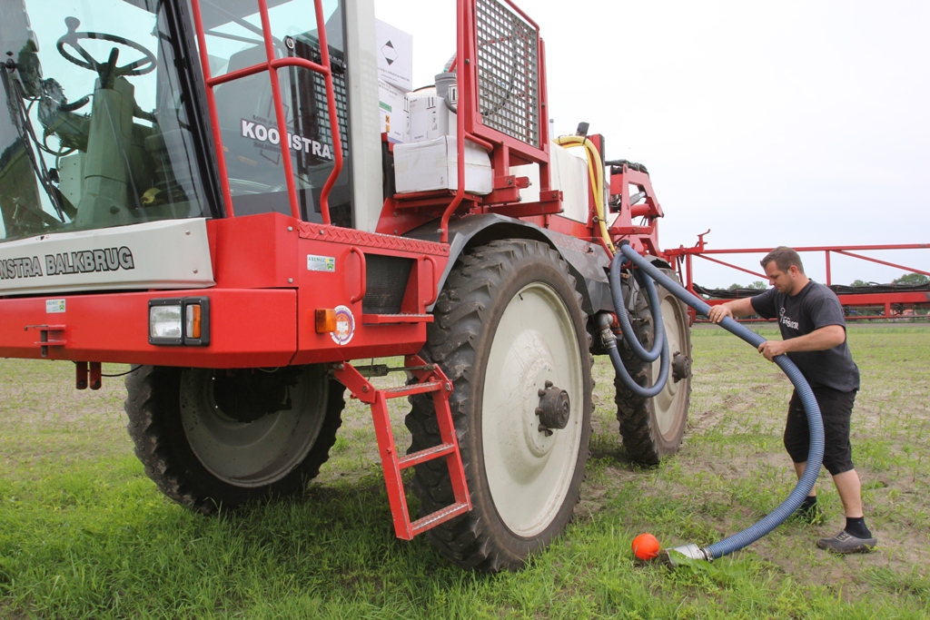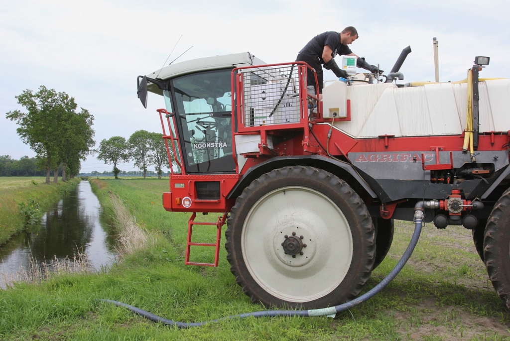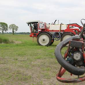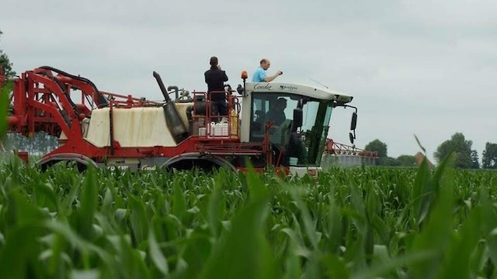 Aan De Leiding in Witharen is Gerjan Lohuis van loonbedrijf Koonstra uit Balkbrug mais aan het spuiten. Hij werkt met een spuit van 33 meter breed en een tank van 3400 liter. Op dit perceel van Bertus Binnendijk gaat 300 liter water per bunder. Met een brede sloot naast het perceel is het handig bijvullen. Lohuis spuit de mais met Kart, Milagro, Frontier en Calaris.