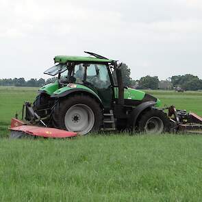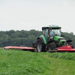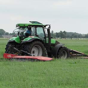Deutz Agrotron K110 aan het gras maaien in Hulshorst met Vicon en Stoll maaiers.