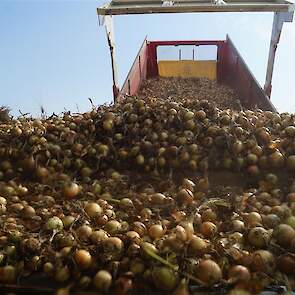 Uien laden met Deutz Fahr TTV`s Grimme wagen rooier en Beco kippers dit alles van bij en door Siebring Akkerbouw uit Oranjedorp