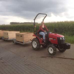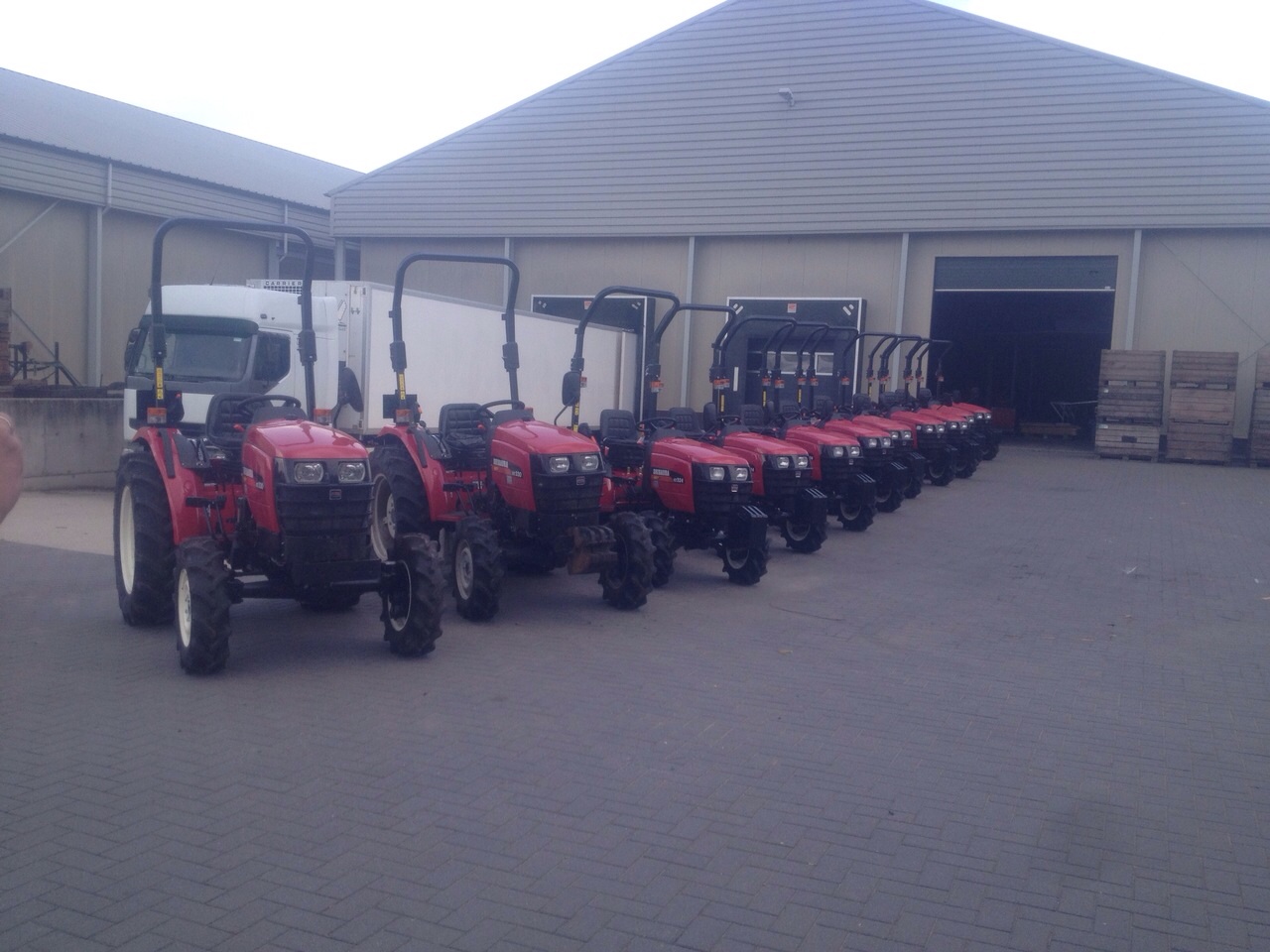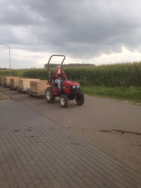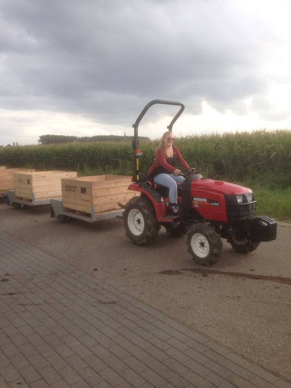 Deze tractoren zijn bij de firma van loon in dongen zo aangepast, dat het sturen en het rijden vanaf de hoogwerker te bedienen is inclusief een noodstop.De andere 9 Shibauras van het type st 3 24 hst worden vooral gebruikt tijdens de plukperiode om 5 kuubs bakken te kunnen trekken met een gezamenlijk gewicht als ze vol zijn van maar liefst 3000 kg!!