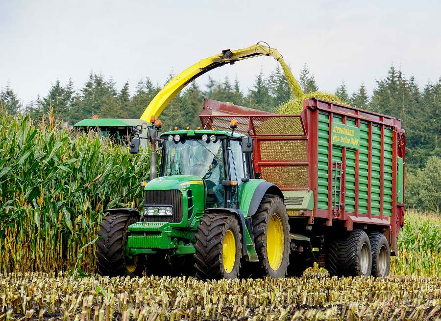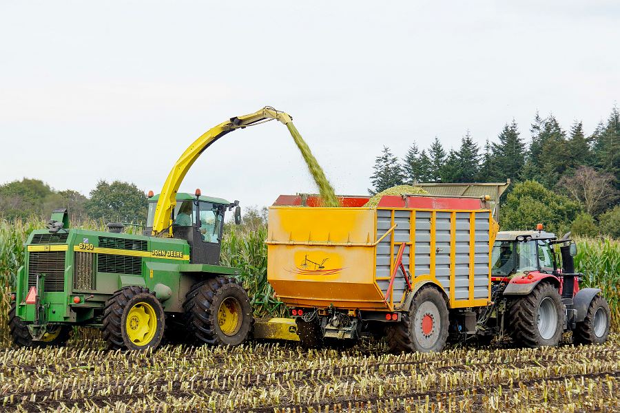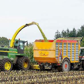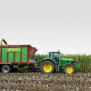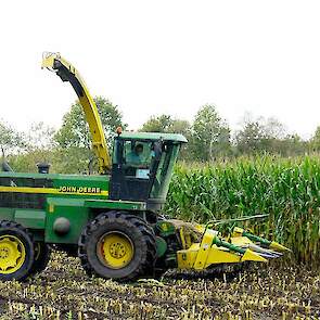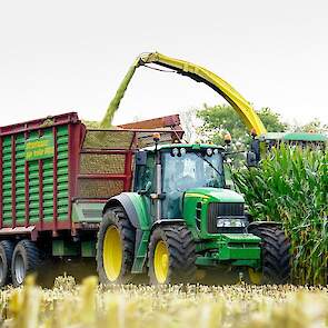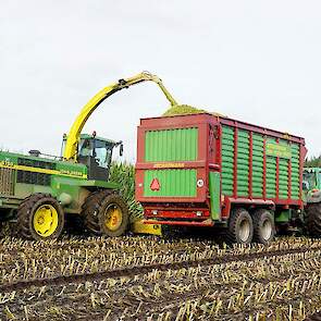 Er wordt gehakseld met een John Deere 6750. Ernaast rijden:
