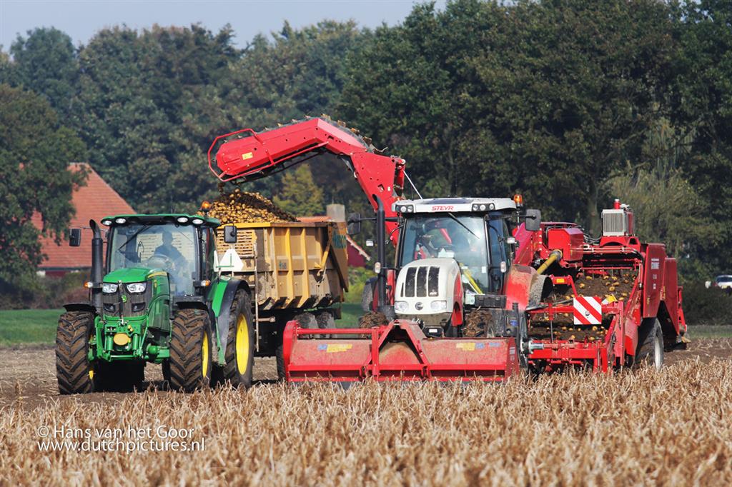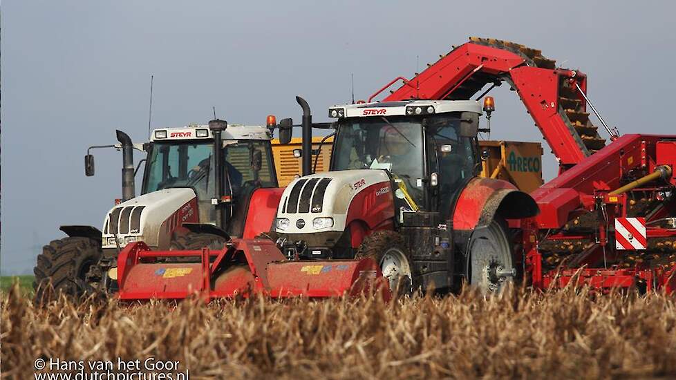Akkerbouwer Mts. Brus uit Biddinghuizen aan het aardappel rooien met een Steyr CVT 6230 met Grimme GV 3000 aardappelrooier.