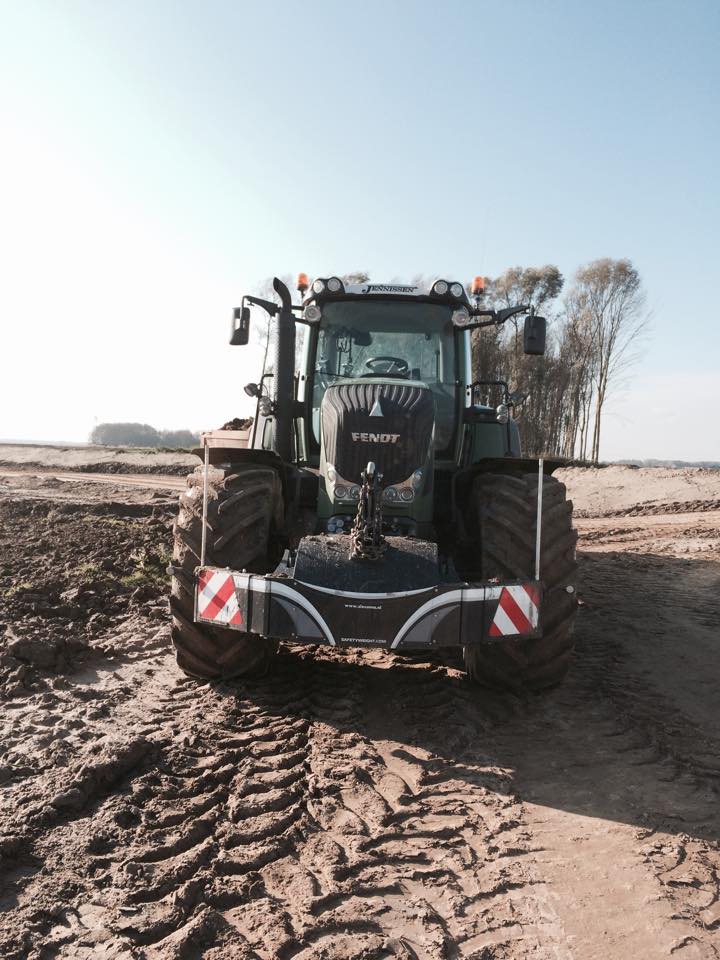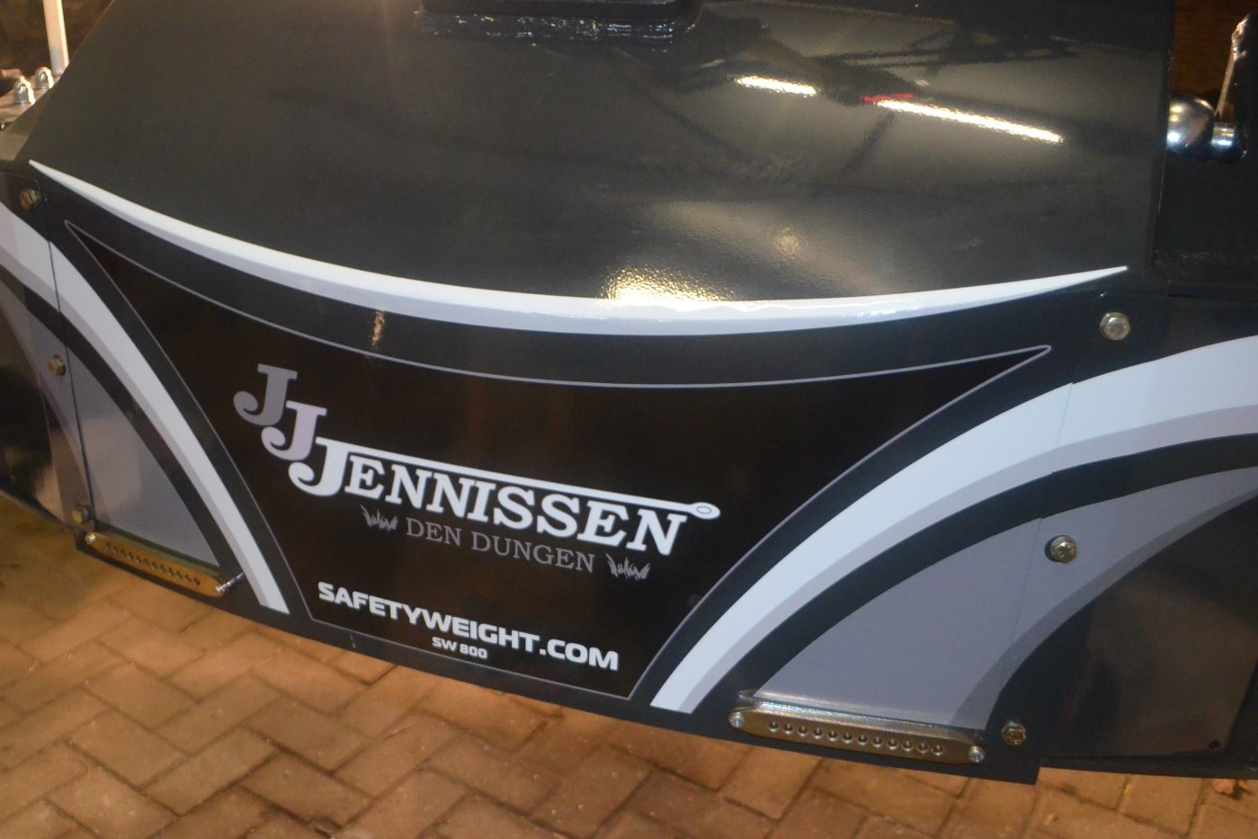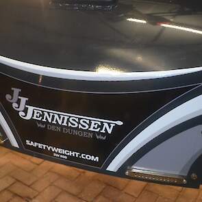 Loonbedrijf Jennissen den Dungen in het grondverzet met een veilig frontgewicht, een SafetyWeight, van 800 kg. Met de SafetyWeight is er een gewichtsblok gecombineerd met extra breedteverlichting, dagrijverlichting,rood-wit markering en helpt ter afscherming van de voorwielen. Daarnaast is het mogelijk om het eigen logo voorin de sticker te bestellen, zoals de volgende voor Jennissen. Ideaal voor het grondverzet over de openbare weg.