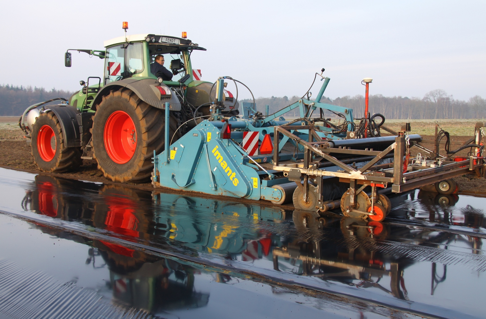 Jan Albert Joldersma, van het gelijknamige loonwerkbedrijf in Smilde, en een medewerker dekken met Metamnatrium ontsmette grond af. Op een Imants spitmachine bouwde de loonwerker een hef met zelfgemaakte folielegger met onderdelen van oud ijzer. In de verte bewerkt lelieteler Wijnand Eleveld uit Smilde het oude maisland voor ontsmetting.Vanwege alle onzekerheid en de nieuwe (emissie-)eisen van het ministerie heeft Joldersma even minder klanten dan vorig jaar, maar volgens hem is deze machine de uitvinding die telers weer over de streep zal trekken.Joldersma gebruikt dubbele GPS. De GPS die op de folielegger zit, is exact hetzelfde ingesteld als de GPS op de trekker. Een baan moet in één keer worden dichtgelegd. Schijven duwen de folie in de grond waardoor de randen niet hoeven te worden afgedekt met zand.