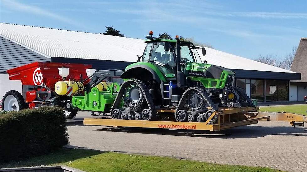 Deze combinatie bestaat uit hun huidige tractor Deutz Agrotron TTV 7.250Deze trekker is voorzien van een compleet nieuw gebouwde vooras voor 3 mtr spoorbreedte met aangepaste overbrenging ivm voorloop plus een complete set soucy tracks.Achter de trekker hangt een AVR volveldfrees (prototype met hydraulische woelers)Van de Miedema planter is de trekhaak verhoogd en verlengd zodat de frees eronder door kan draaien en heffen