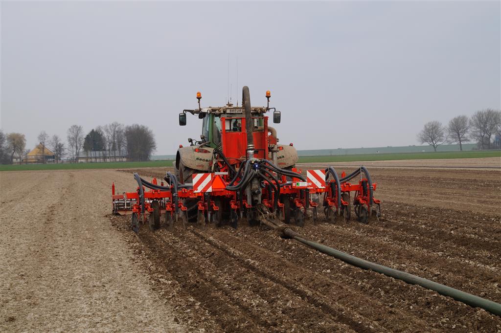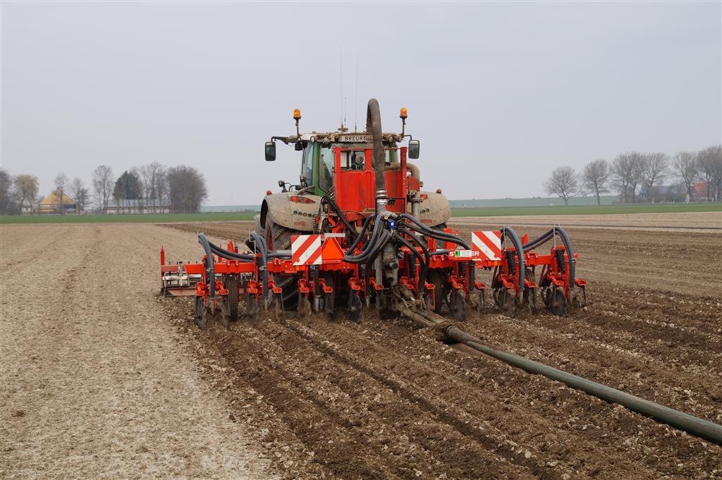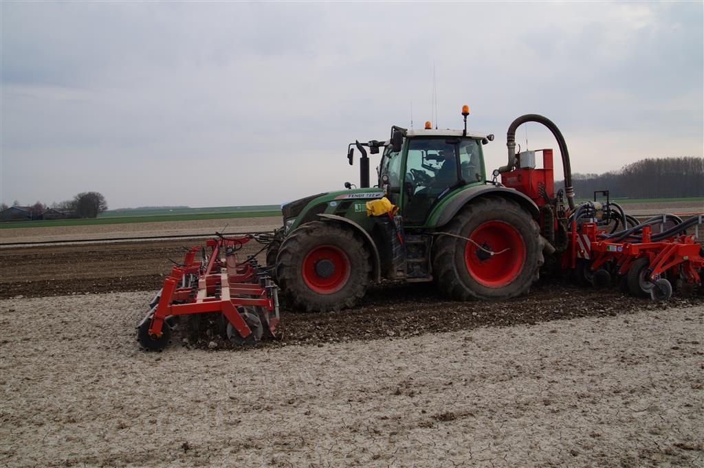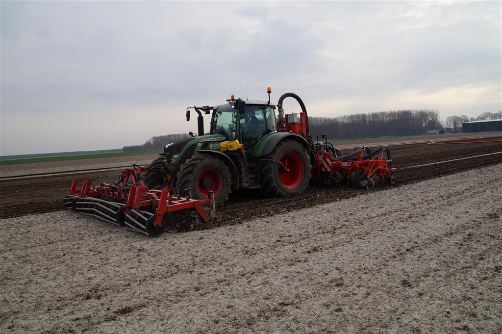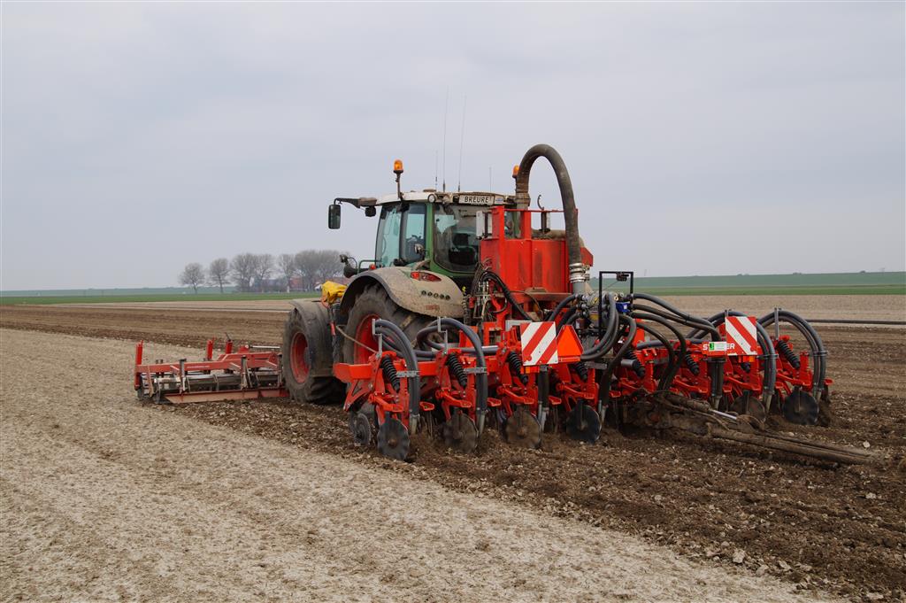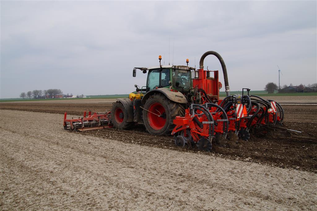 Fendt 722 van loonbedrijf Breure aan het stroken bemesten. Voorp de Fendt een 6 mtr. brede steketee en een 8 rijer Kuhn stroken bemesten hangen in een hefmast achter de trekker. Er wordt op RTK gps gereden zodat de maiszaaier precies de zelfde lijnen kan volgen en de mais dicht bij de mest gezaaid kan worden.