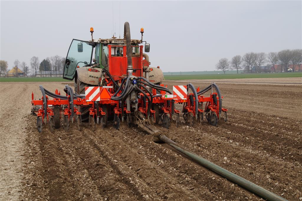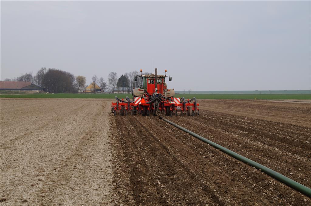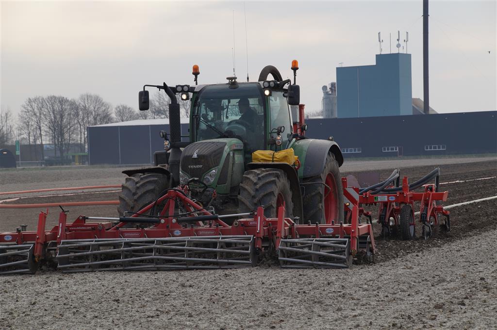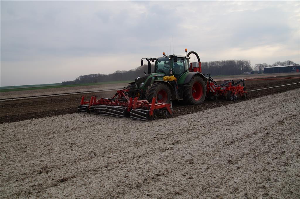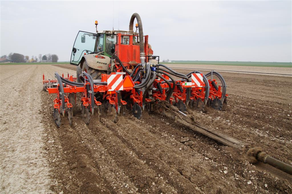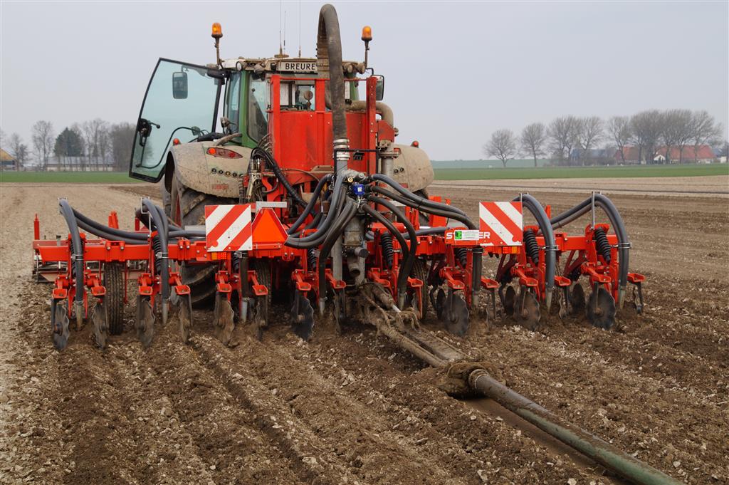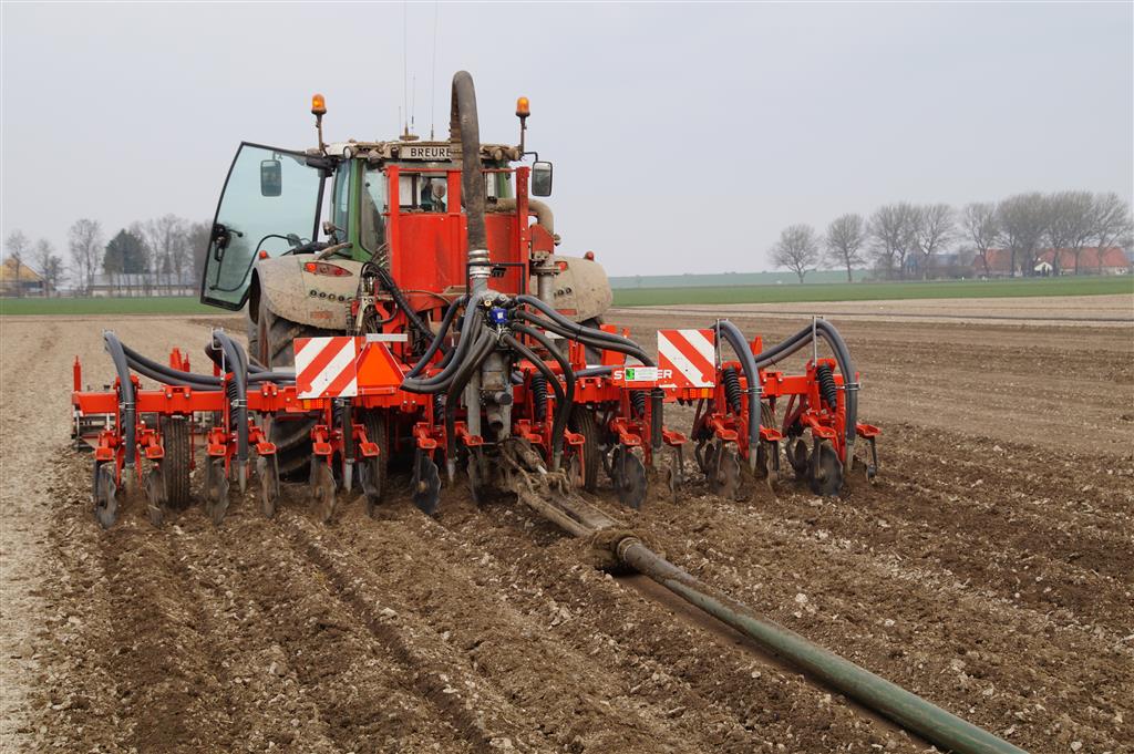 Fendt 722 van loonbedrijf Breure aan het stroken bemesten. Voorp de Fendt een 6 mtr. brede steketee en een 8 rijer Kuhn stroken bemesten hangen in een hefmast achter de trekker. Er wordt op RTK gps gereden zodat de maiszaaier precies de zelfde lijnen kan volgen en de mais dicht bij de mest gezaaid kan worden.