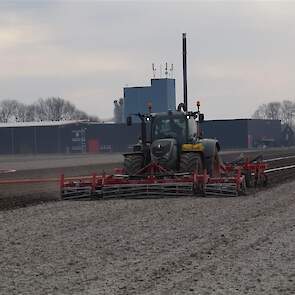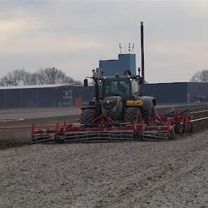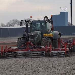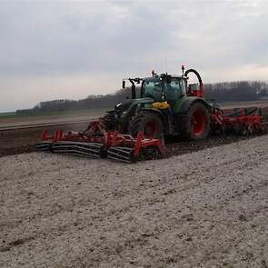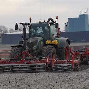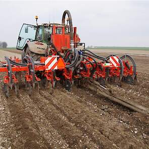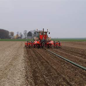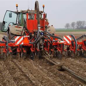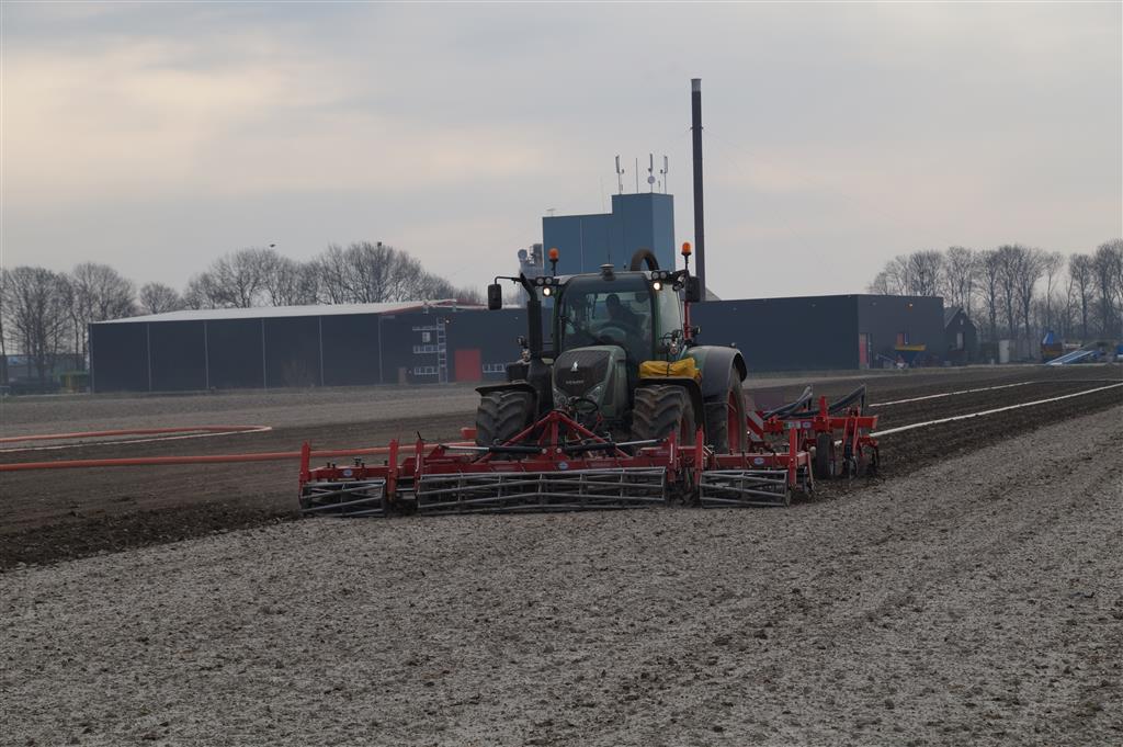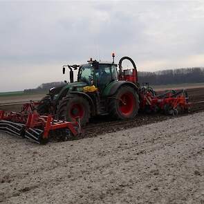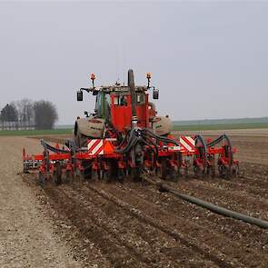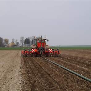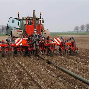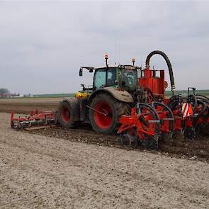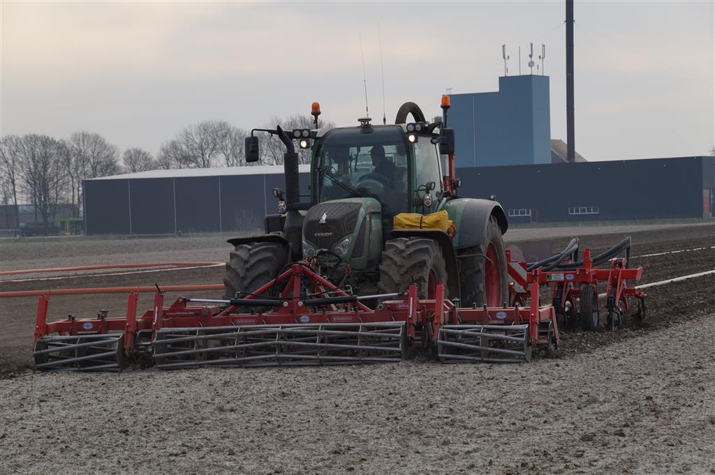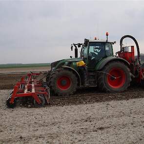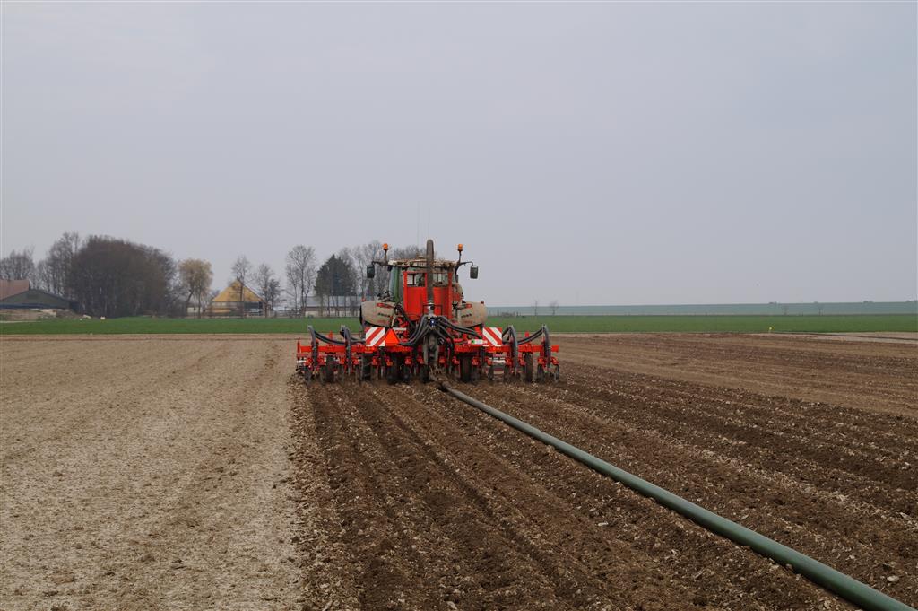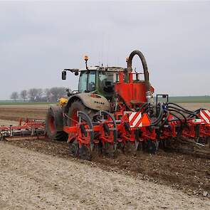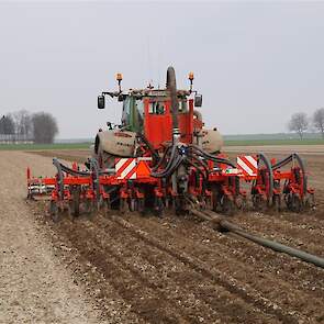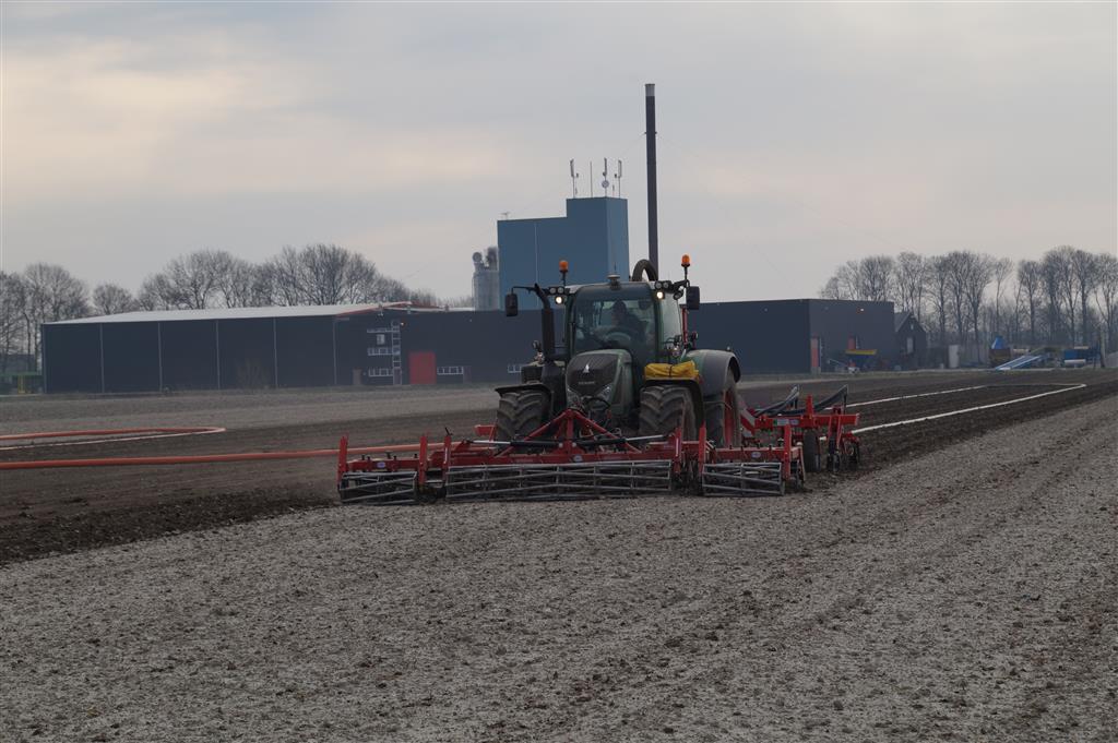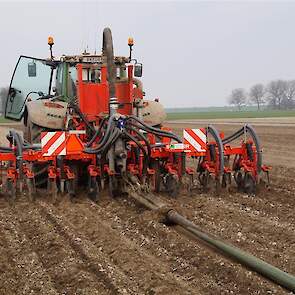 Fendt 722 van loonbedrijf Breure aan het stroken bemesten. Voorp de Fendt een 6 mtr. brede steketee en een 8 rijer Kuhn stroken bemesten hangen in een hefmast achter de trekker. Er wordt op RTK gps gereden zodat de maiszaaier precies de zelfde lijnen kan volgen en de mais dicht bij de mest gezaaid kan worden.