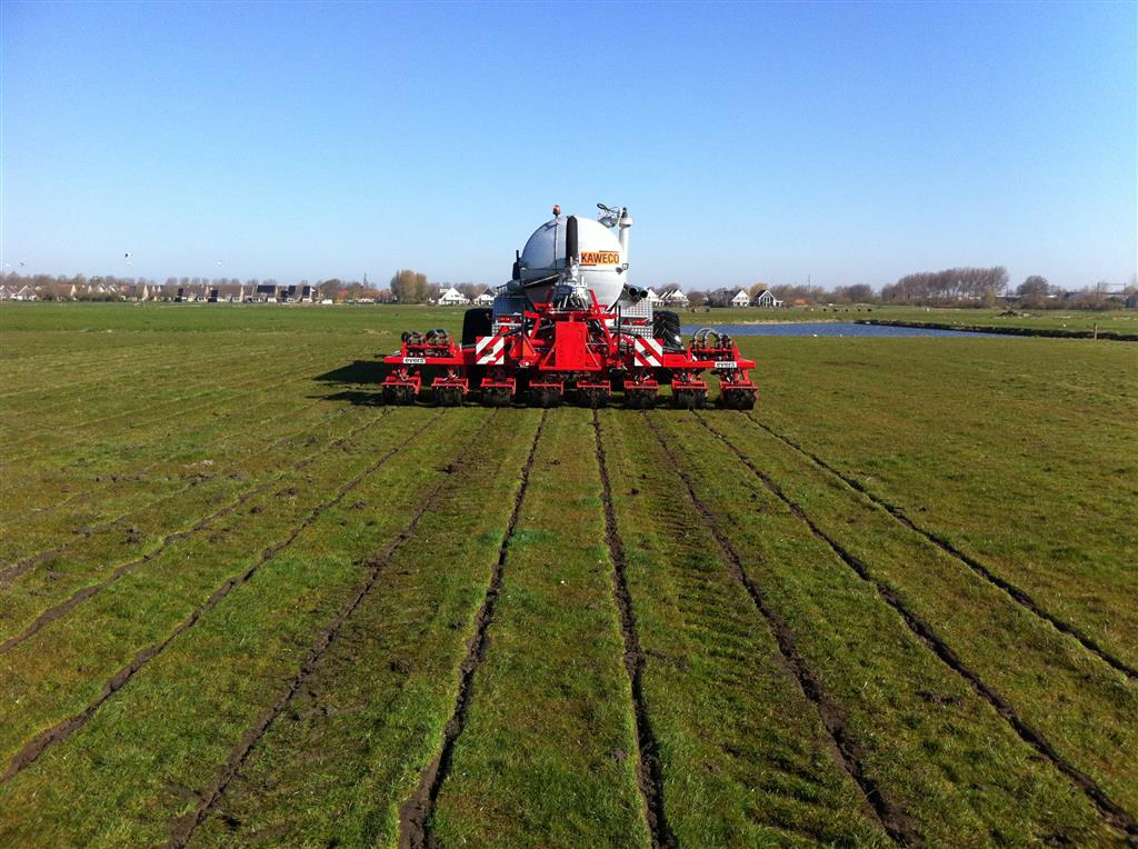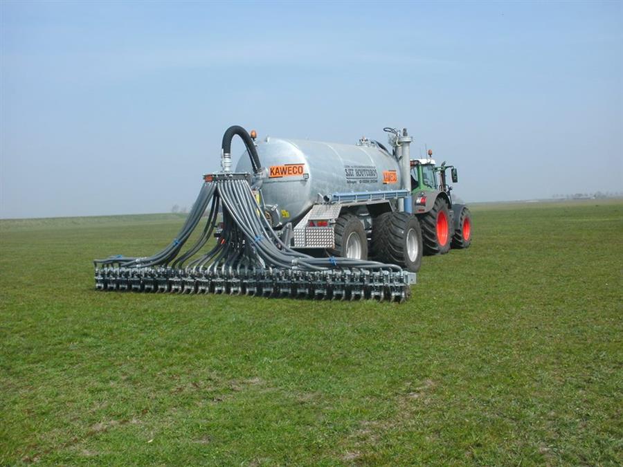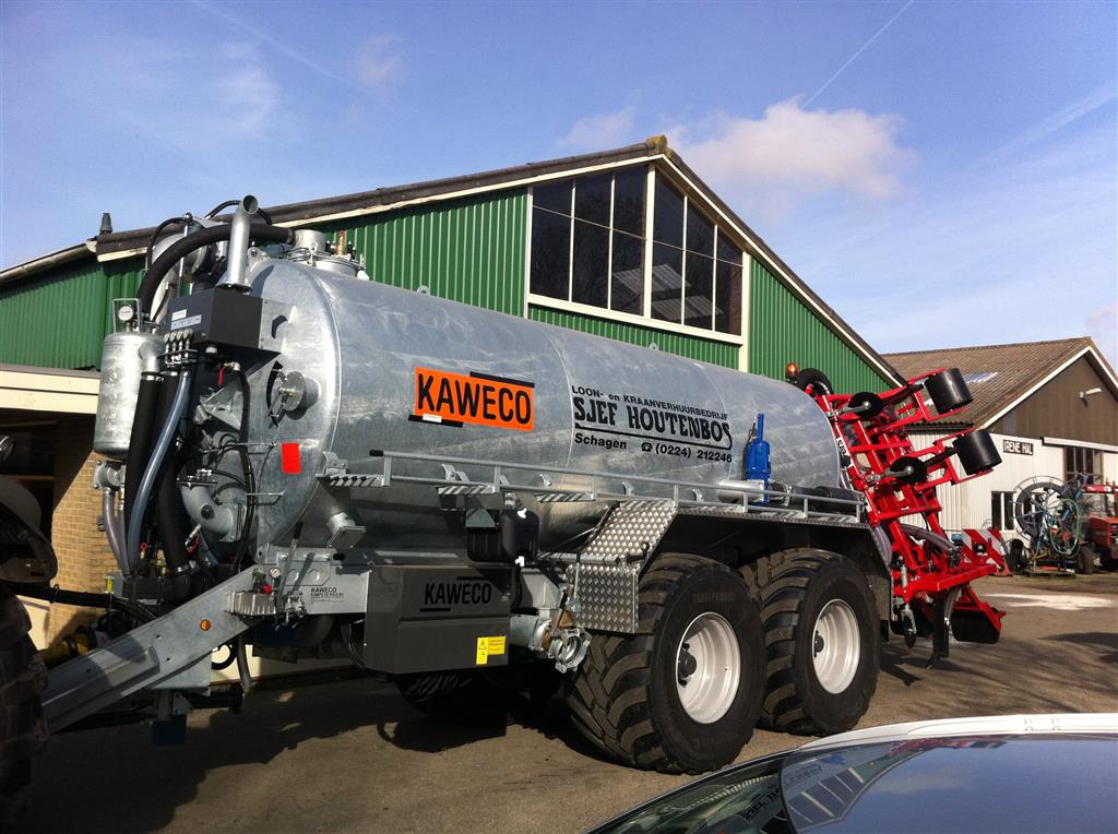 Afleveren en in het werk stellen KAWECO 16.000 vacuum tank, tandem met uitschuifas, flowmeter, 4 keer Trelleborg 850/50R 30.5 TWIN en een hydrauisch arm met turbovuller. Bemester is een KAWECO project 720 met 40 uitlopen.