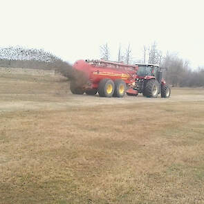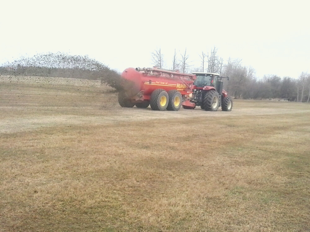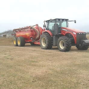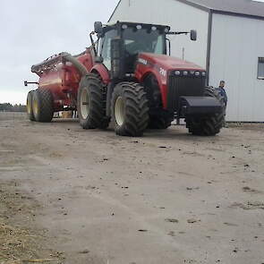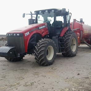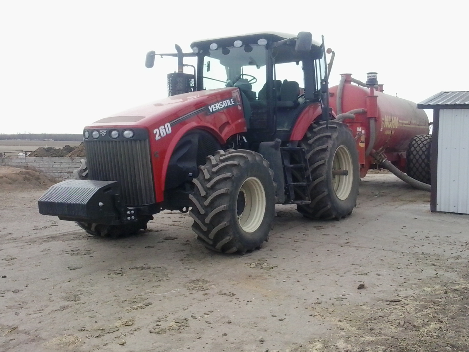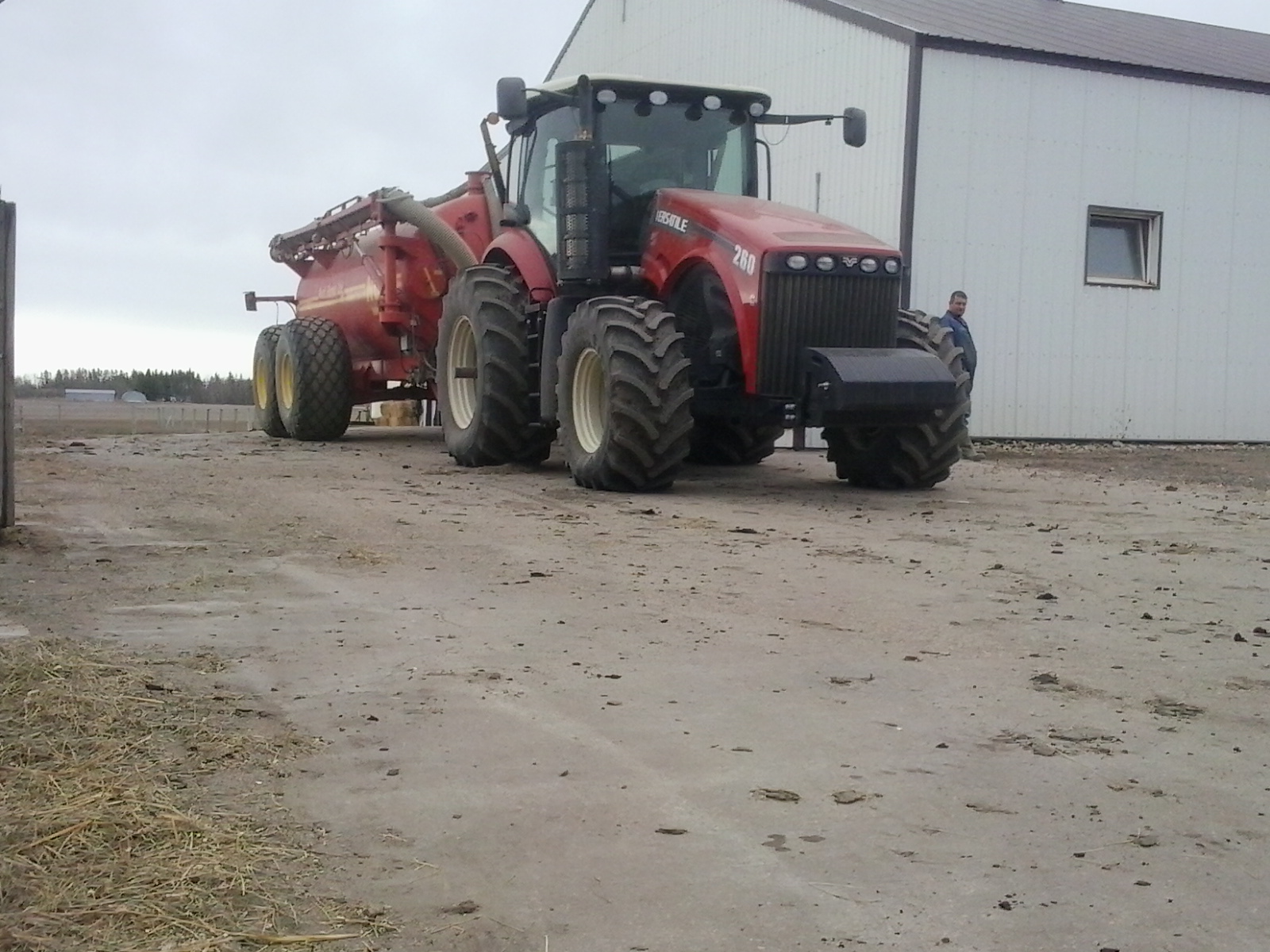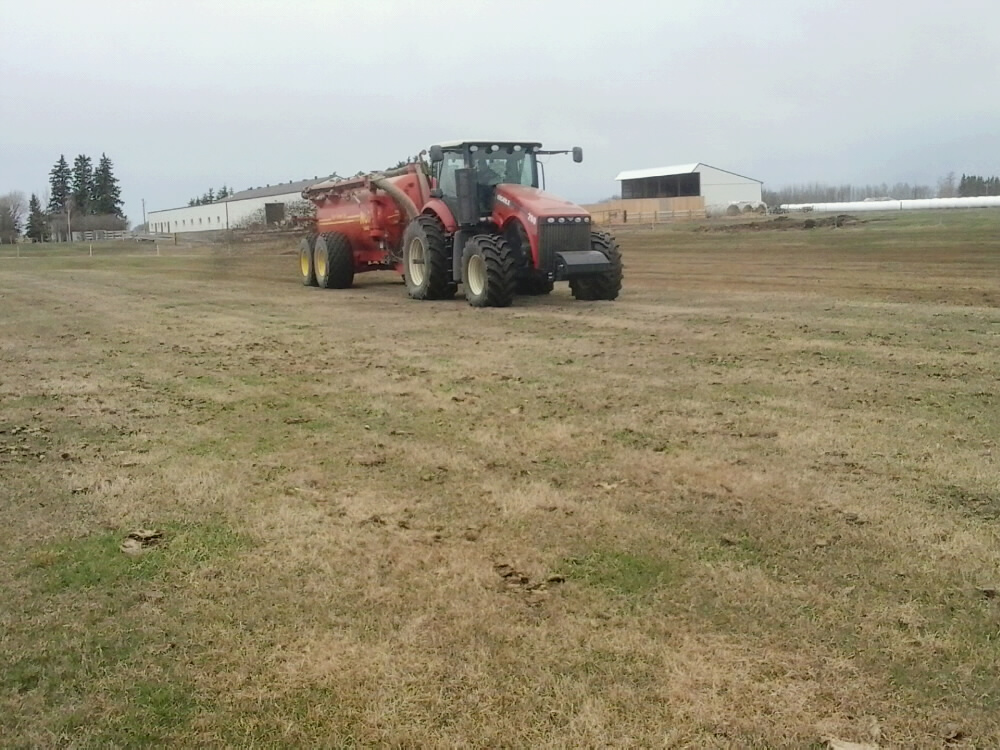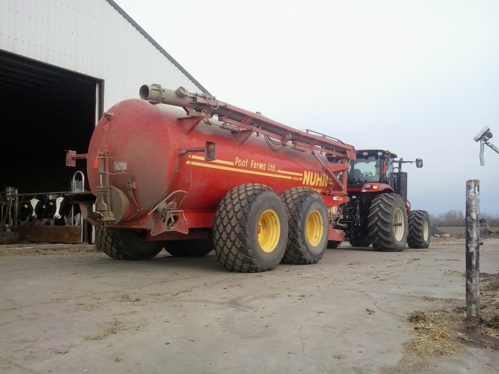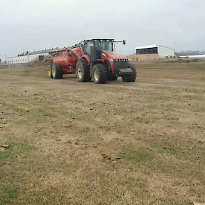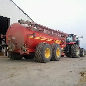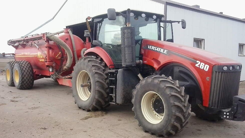 Bart Poot custom work van Poot FARMS met zijn Versatile 260 en Nuhn 5000 vacuum tank aan het drijfmest uitrijden bij Otten Dairies barrhead Alberta