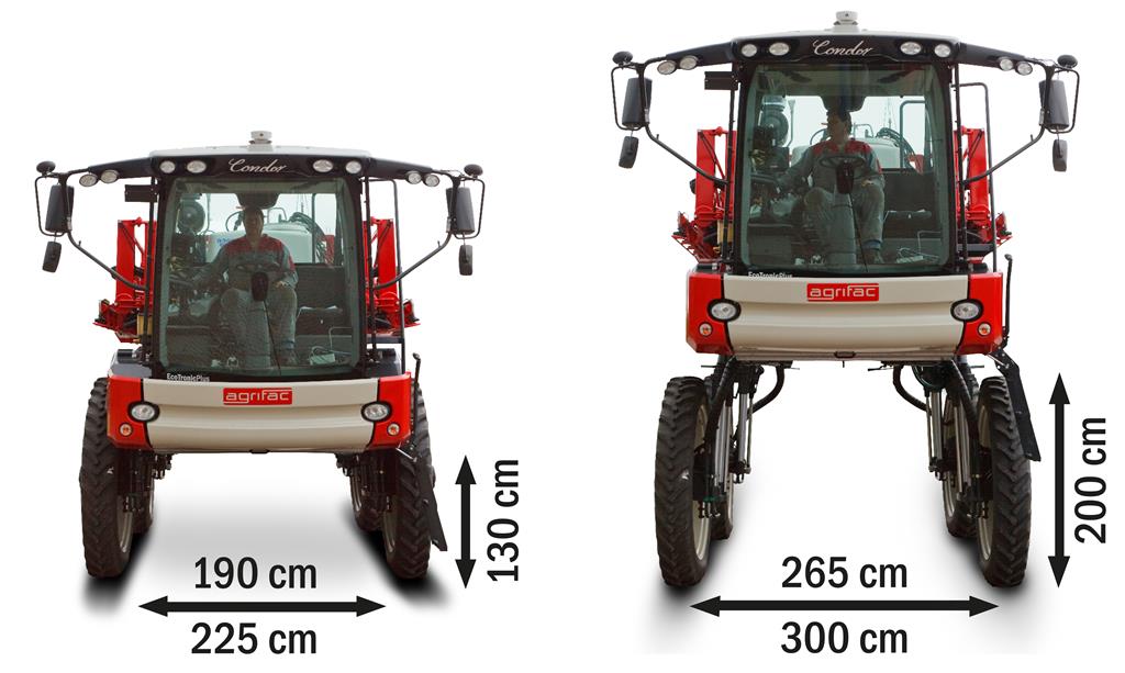 De vergrote traploos verstelbare bodemvrijheid is 70 cm en kan vanuit de cabine worden ingesteld. Dit betekent dat er met een bodemvrijheid van tussen de 130 en 200 cm gewerkt kan worden. Zo biedt de Condor ClearancePlus een nog grotere flexibiliteit in hoogtes aan. Dat de Condor ClearancePlus ook met 130 cm bodemvrijheid kan werken, biedt bovendien extra gemak en werkcomfort.Ongekende stabiliteit en keuzemogelijkheid door spoorbreedte verstelling De Agrifac Condor ClearancePlus heeft een traploos verstelbare spoorbreedte verstelling van 190 - 265 cm of 225 - 300 cm. Afhankelijk van de gebruikte rijafstanden kan de machine aangepast worden. Ook in de smalste spoorbreedte is stabiliteit en comfort gegarandeerd; daar zorgt het geroemde en bewezen StabiloPlus onderstel voor. De garantie voor een unieke stabiliteit voor zowel de spuitboom als de machine zelf. Het pendelende chassis effent moeiteloos alle oneffenheden weg waardoor een uiterst stabiele en comfortabele spuit ontstaat. Zelfs in heuvelachtige gebieden.