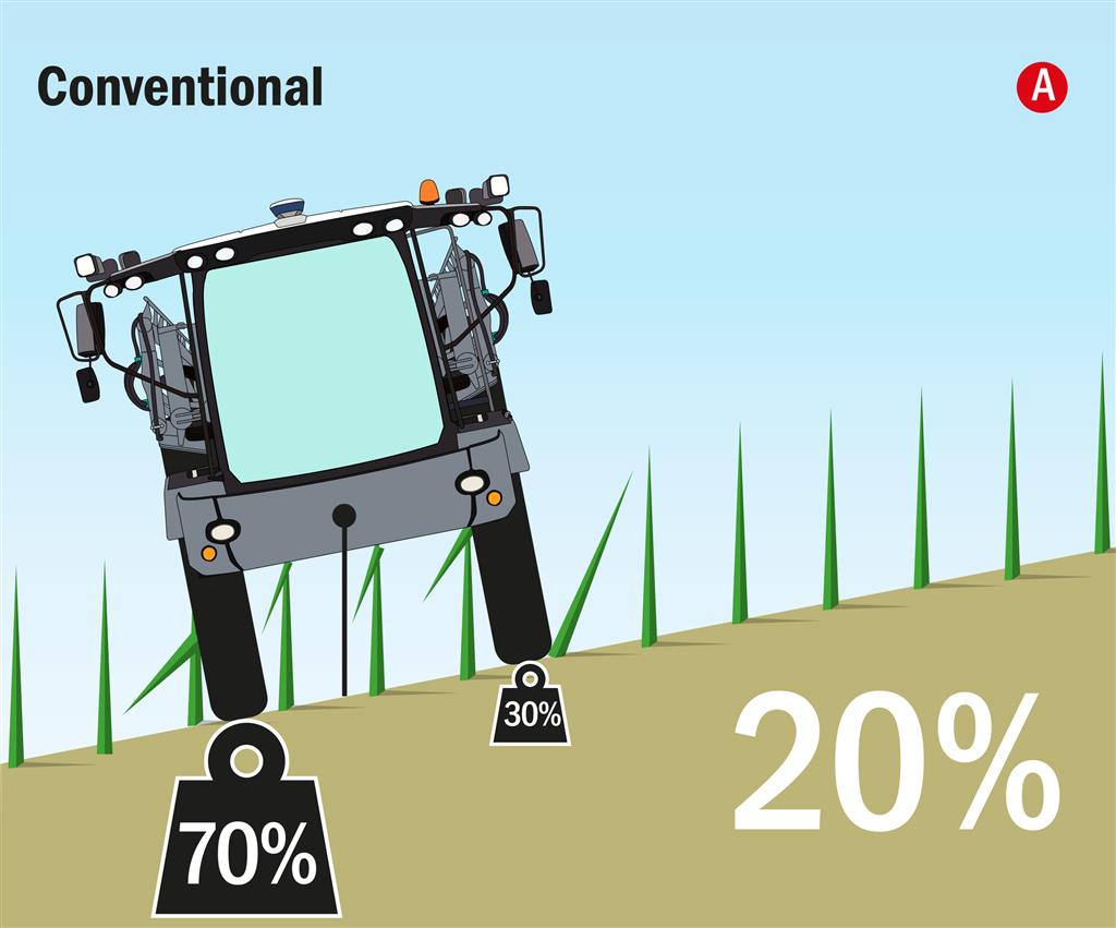 Gesproken over heuvelachtige gebieden, om gebruikers die met extreme omstandigheden te maken hebben nog beter van dienst te kunnen zijn is de Condor ClearancePlus voorzien van een nog sterkere aandrijving. Doorde sterkere aandrijving en het StabiloPlus chassis wordt het vermogen van een machine efficiënt op de grond overgebracht. Hierdoor kan de machine in alle gebieden en onder alle omstandigheden goed uit de voeten voor optimale gewasbescherming.