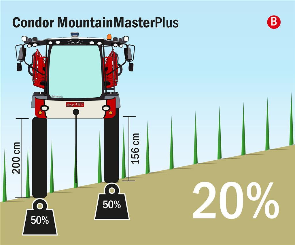 Voor bergachtige gebieden heeft Agrifac een nog uitgebreidere oplossing; de Condor MountainMasterPlus. Deze zelfrijdende landbouwspuit heeft hetzelfde chassis als de Condor ClearancePlus. Het grote verschil is dat elk van de vier hoogte cilinders die de bodemvrijheid bepalen apart bediend kunnen worden. Dit heeft als voordeel dat de machine vlakgesteld kan worden op heuvels met een hoek tot 20%. Hierdoor worden stabiliteit en comfort vergroot. Ook wordt het gewas hier nog beter door beschermd doordat de machine in dezelfde hoek als het gewas staat.