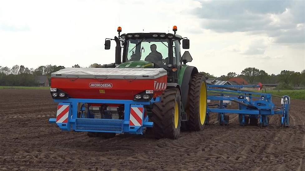 Mais zaaien met een John Deere 6210R met achter dubbellucht en GPS en een Monosem 12 rijer van Loonbedrijf Schimmel uit Scherpenzeel in Renswoude in Nederland. Het land werd zaaiklaar gemaakt met een Fendt 820 Vario TMS met voor een VSS AGRO drukrol en achter een Evers vaste tand cultivator.