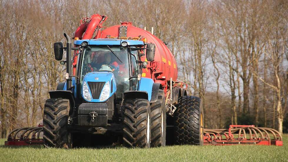 Melkveebedrijf Mts. Van Weperen uit Oosterwolde in actie tijdens het zodebemesten. Dit met de New Holland T7.250 en daarachter de Schuitemaker Robusta met een tankinhoud van 22m3. De tank is tevens voorzien van een spreidas en een drukwisselsysteem.