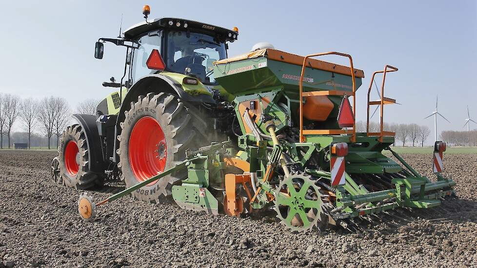 Medewerker Arie van den Twil van Loonbedrijf Van de Bunt uit Puteen zaaide afgelopen week in Zeewolde 7 hectare gras in.Het loonbedrijf heeft nog meerdere percelen op de planning staan om opnieuw te zaaien.maar het weer werkt nog niet bepaald mee.