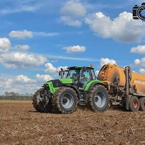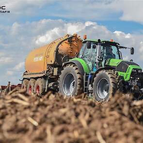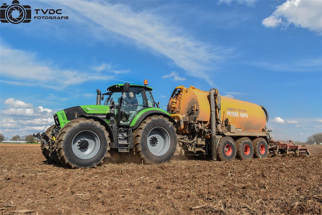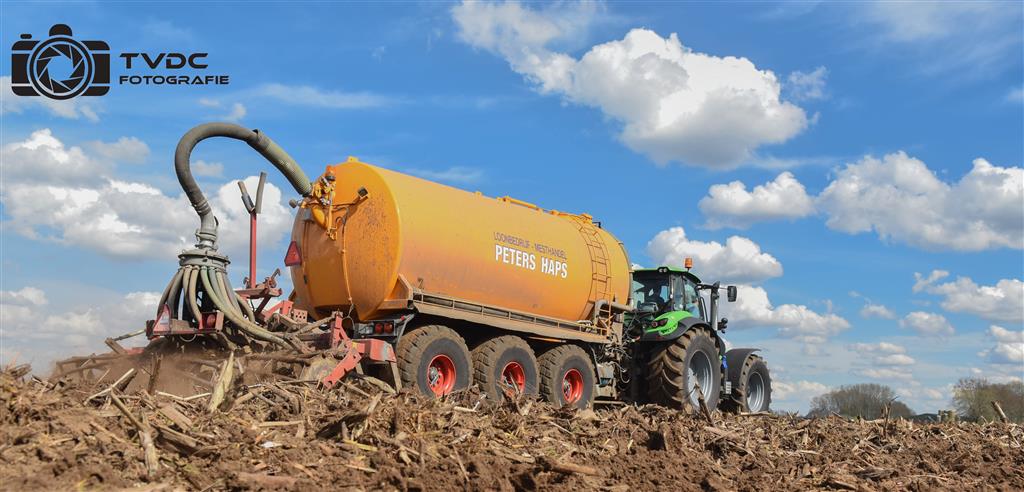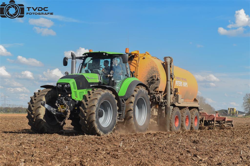 Loonbedrijf Peters Haps bouwland bemesten in Wanroy met De Deutz Fahr 7250TTV Warrior en drie asser mesttank
