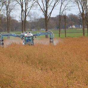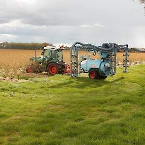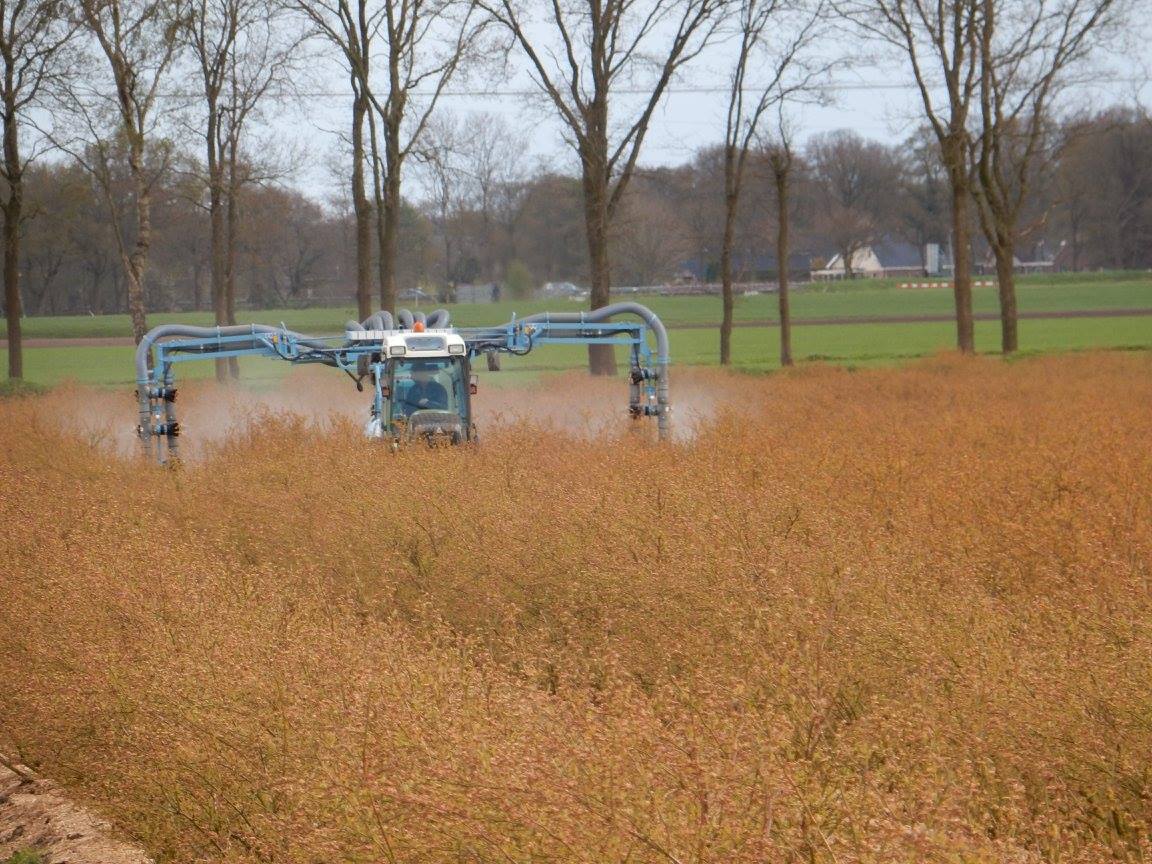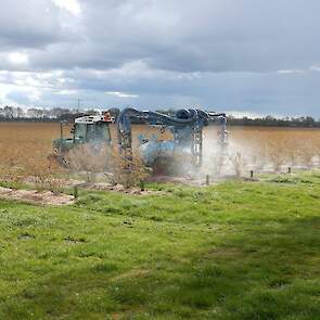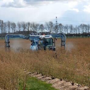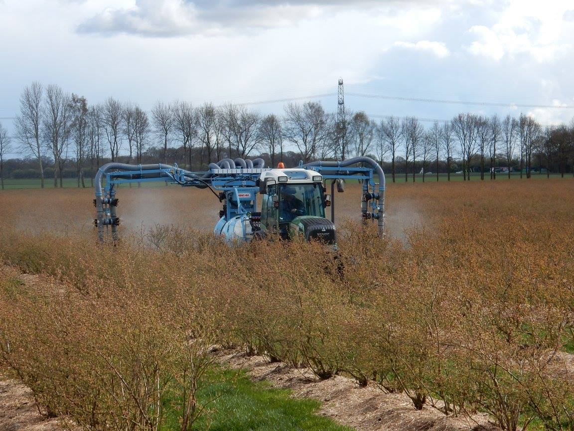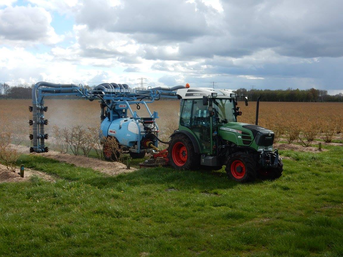 Fendt 211 v vario tms met Ideal veldspuit een bespuiting aan het uitvoeren in de blauwe bessen