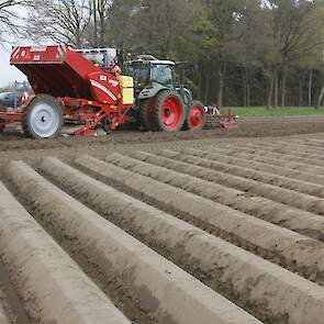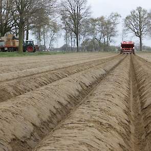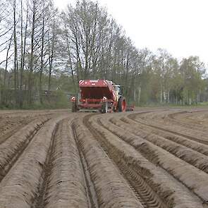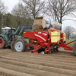 Hilbert Somsen en Ivo Groot Wassink pootten onlangs een kleine 4 hectare aardappelen in Lintelo (Gld). Somsen deed het pootwerk en Groot Wassink vulde de pootmachine. Ze werkten met de vierrijige pootmachine van Prinzen-Somsen. Totaal gebruikten ze een dikke 16 ton poters van het ras Carrera. Ze hebben dit jaar ongeveer 200 hectare te doen. Het bedrijf heeft (huur)grond in de driehoek Aalten, Zieuwent, Etten. Dat is goed werkbaar. De pootmachine is voorzien van GPS, het eerste jaar dat hiermee gewerkt wordt. Groot Wassink: Dat bevalt zo goed, het werkt zeer effectief.
