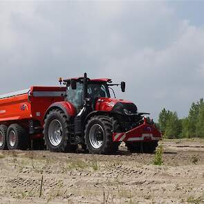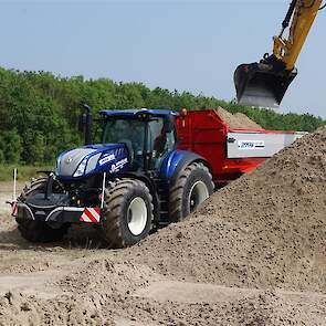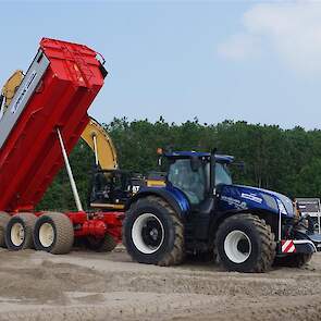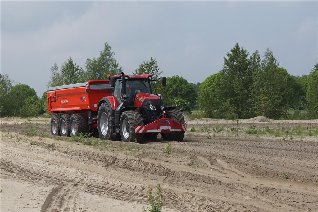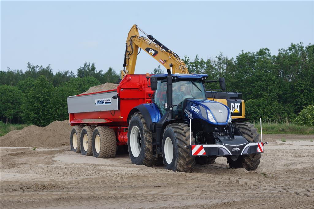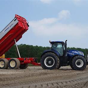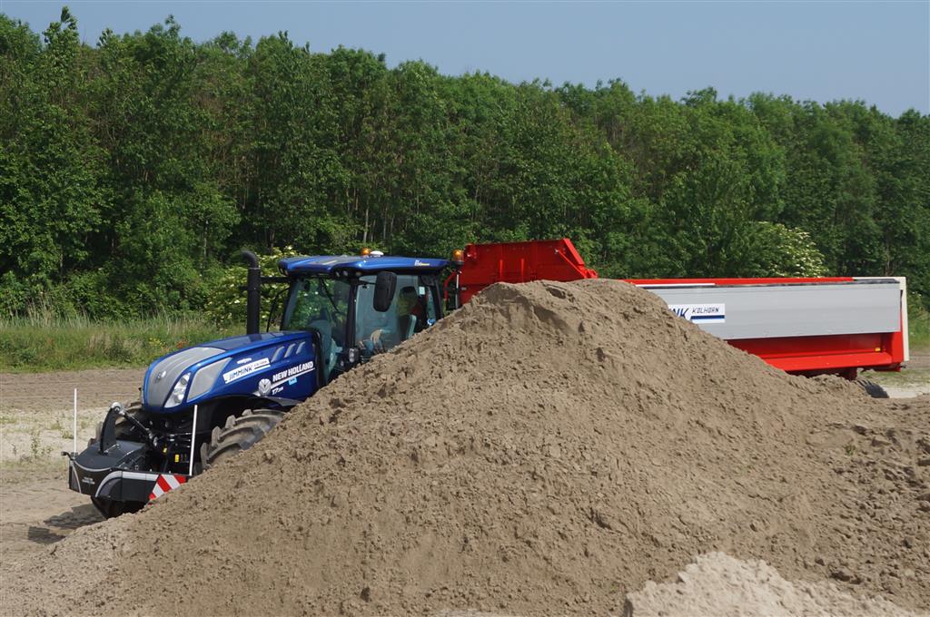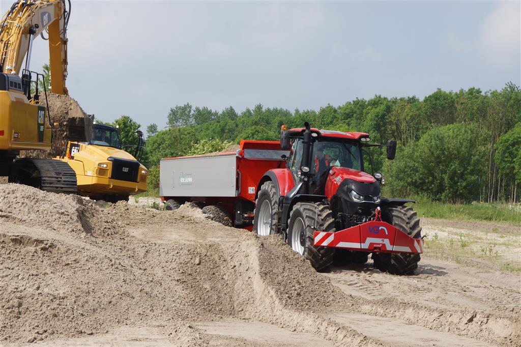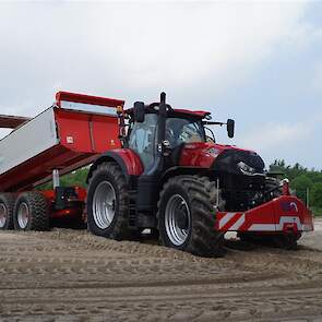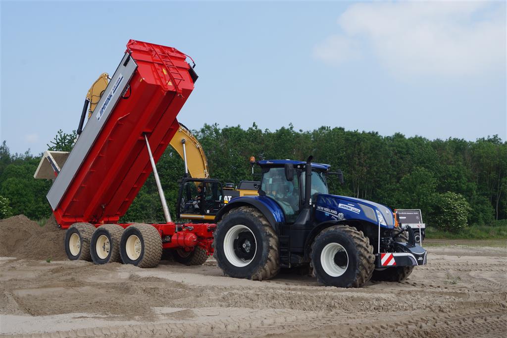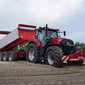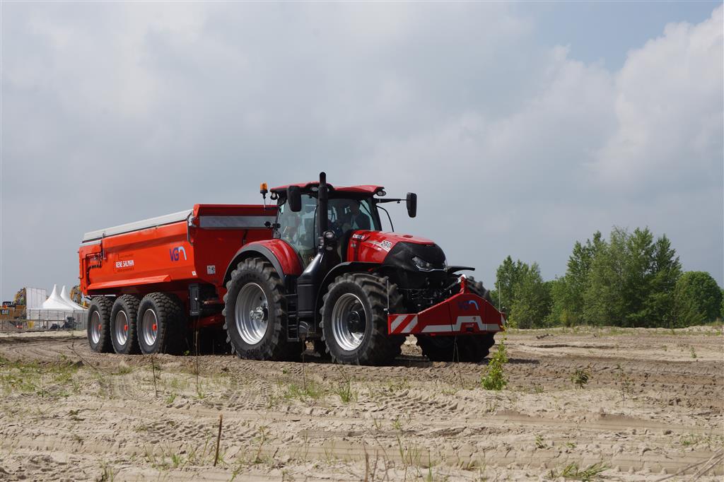 Het blijft mooi zandrijden met een Case-IH Optum en een New Holland HD in het zandtransport.