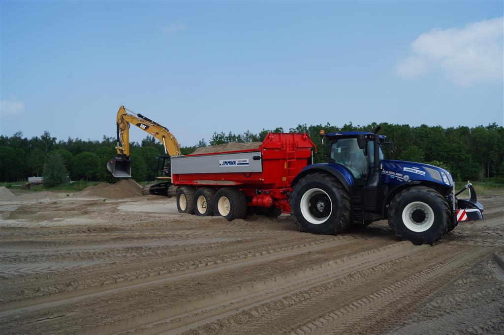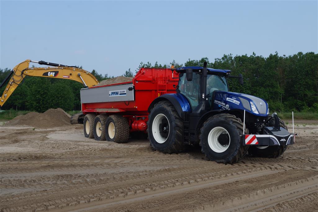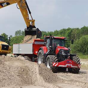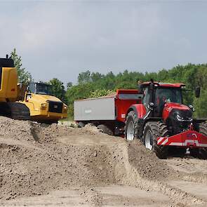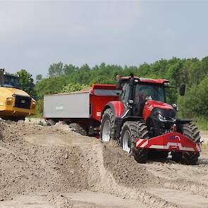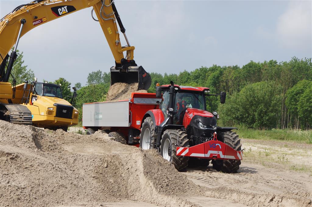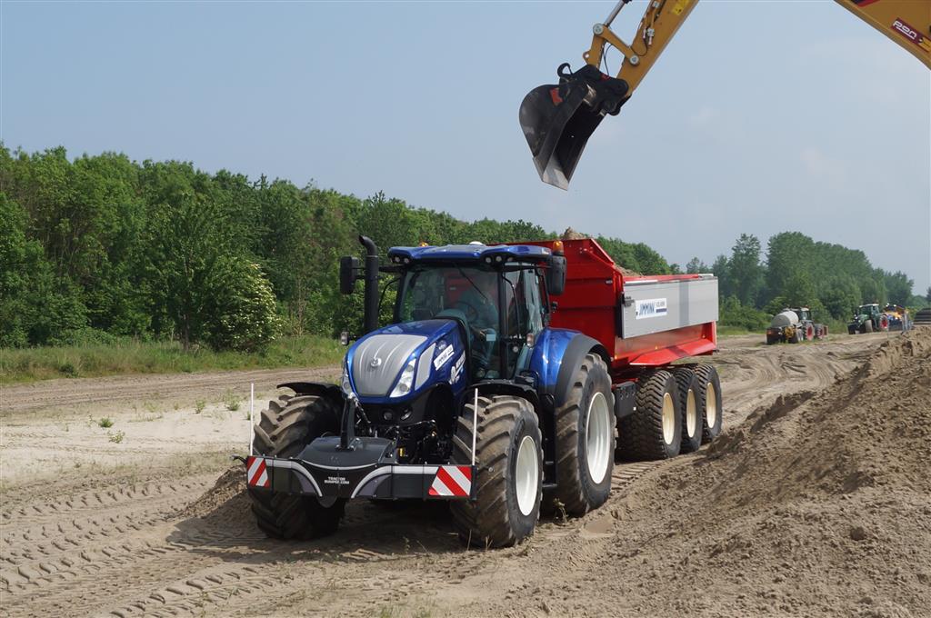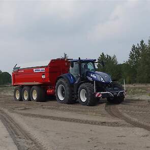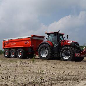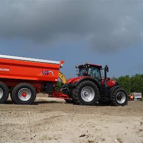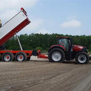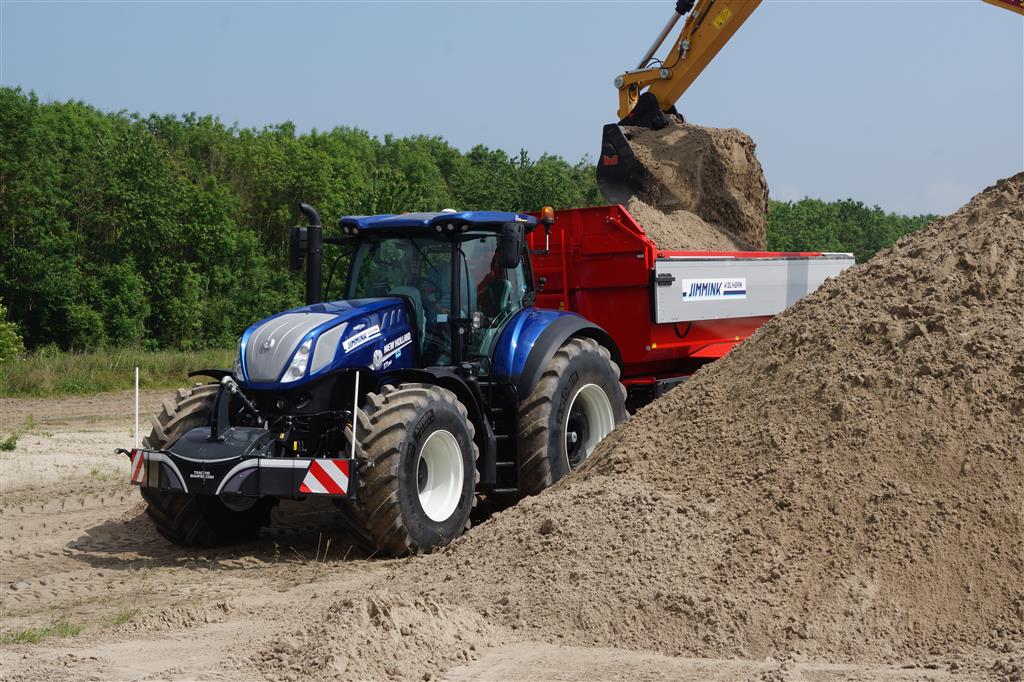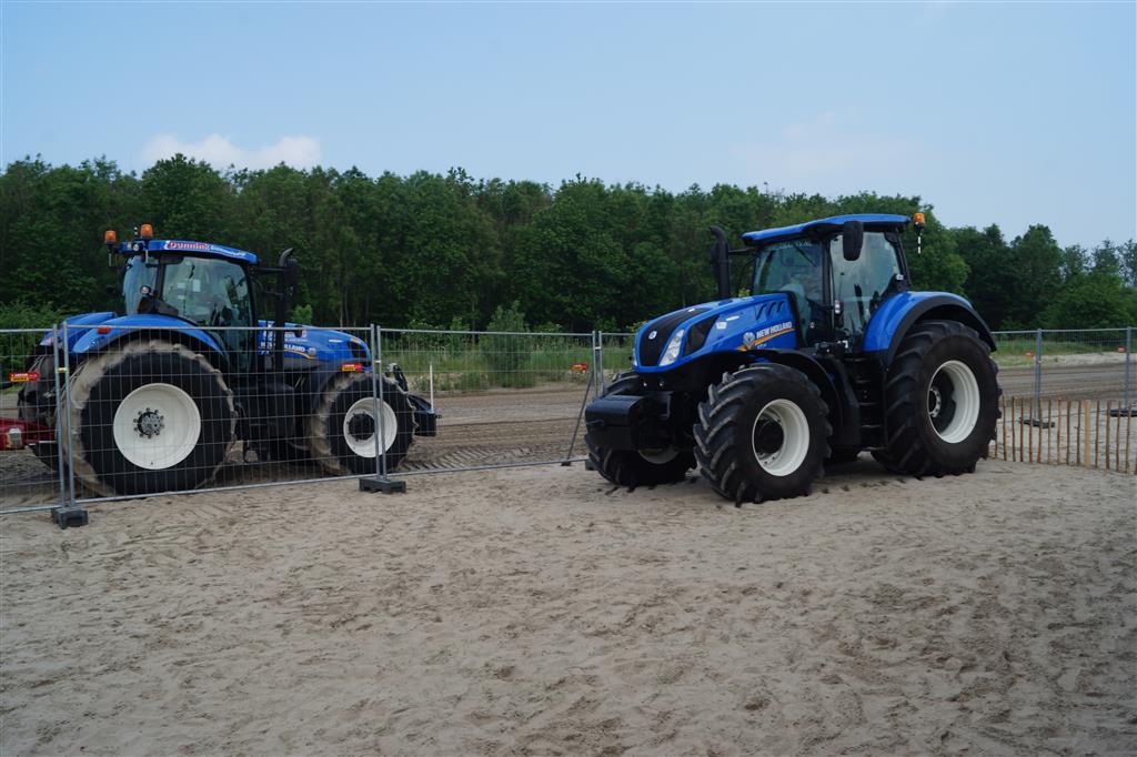 Het blijft mooi zandrijden met een Case-IH Optum en een New Holland HD in het zandtransport.