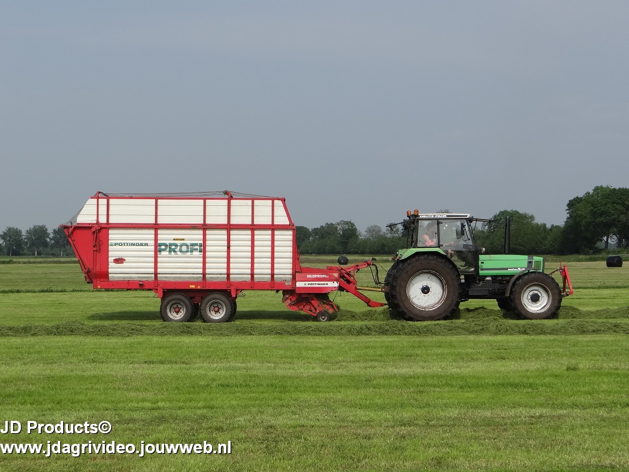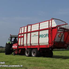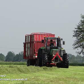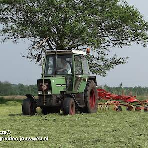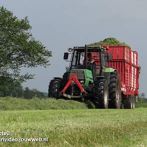 Deutz-Fahr AgroPrima 6.06 van melkveehouderij Wajer uit Hulshorst aan het gras inkuilen. Fendt 304 LS is aan het harken.