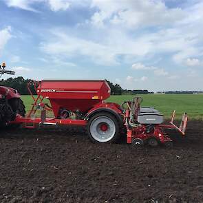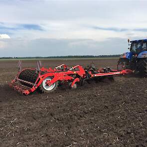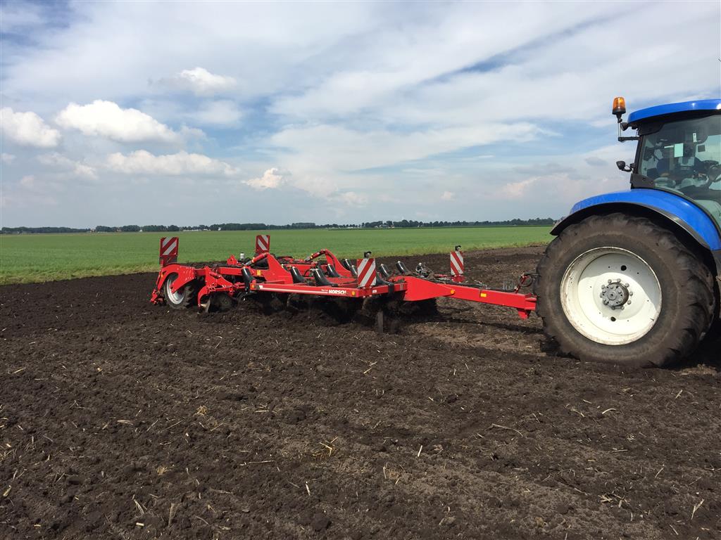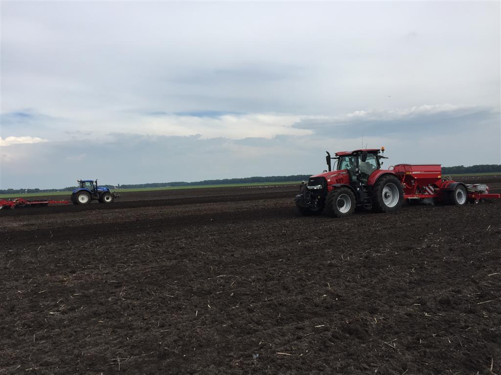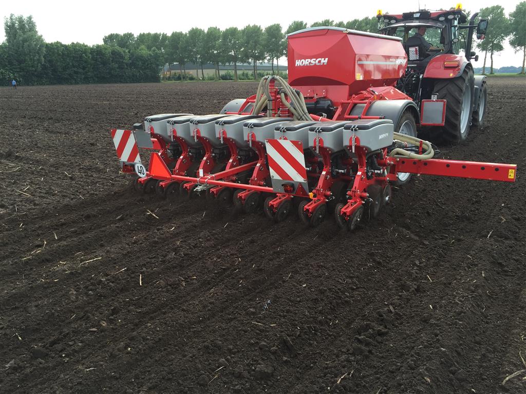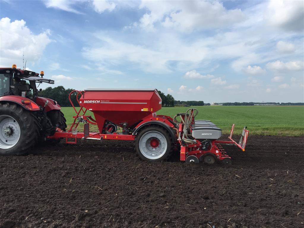 De laatste mais gaat nog snel de grond in. Het land wordt tussen de buien door klaar gemaakt met de Horsch Tiger 3 AS en vervolgens gezaaid met de Horsch Maestro. Met de Horsch Tiger wordt het land 35cm diep losgetrokken om vervolgens de mais te zaaien. Grote voordeel hierbij is dat de 1 meter hoge bandenpacker de bodem weer aandrukt zodat de mais in de vaste grond gezaaid kan worden. De Maestro is omgebouwd naar een rijafstand van 45cm. Dit met de filosofie dat er ook vol velds bemest wordt en de plant hierdoor meer ruimte krijgt om te groeien.