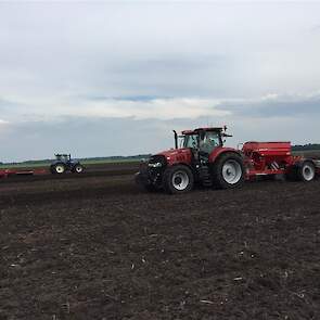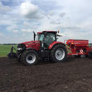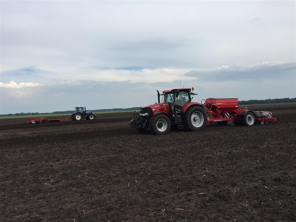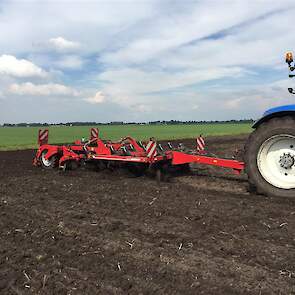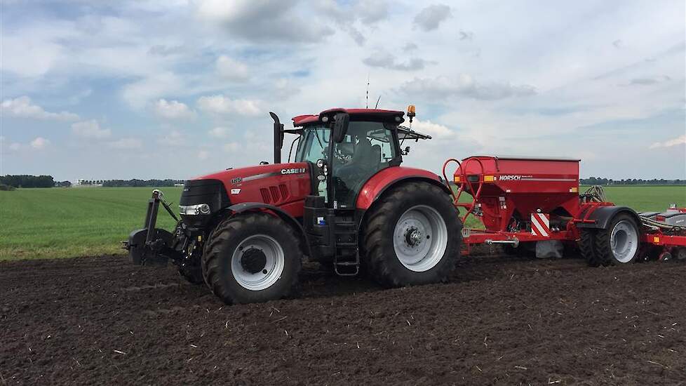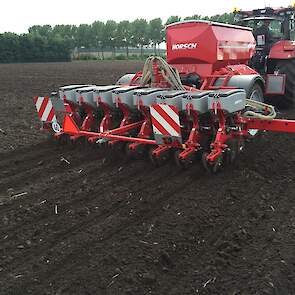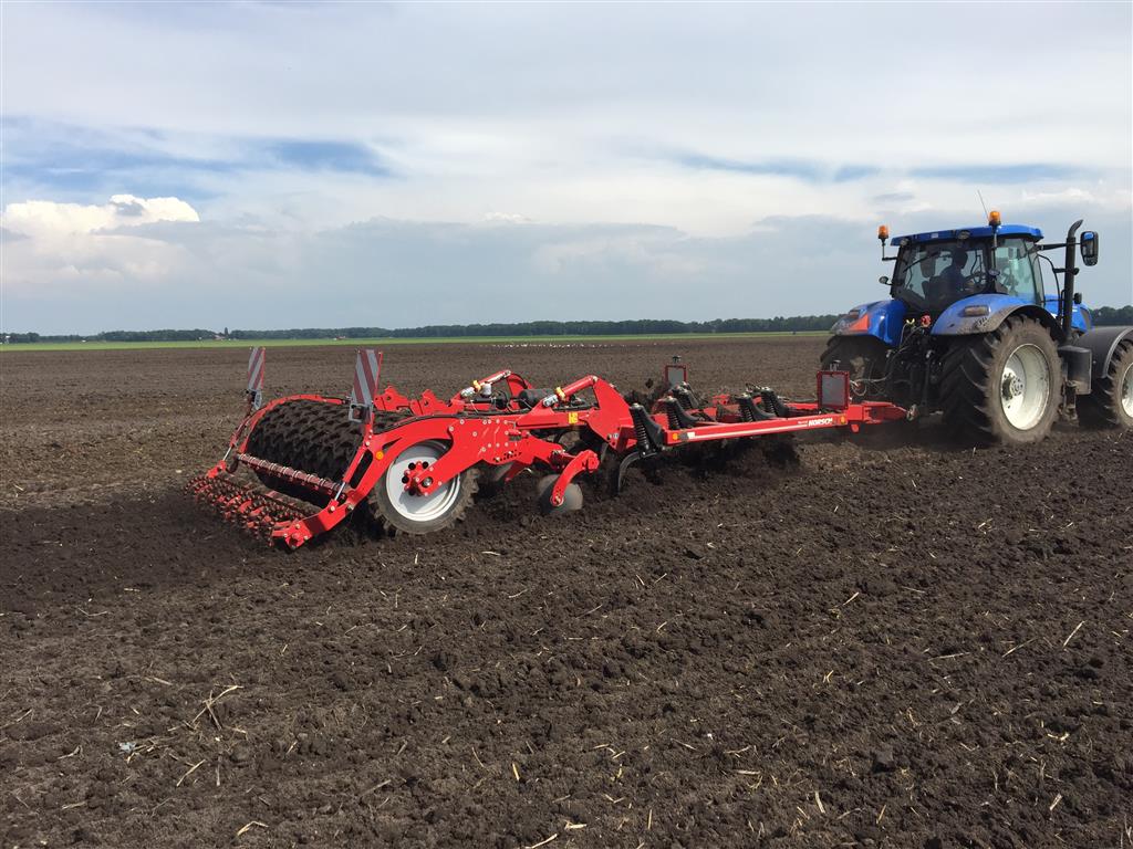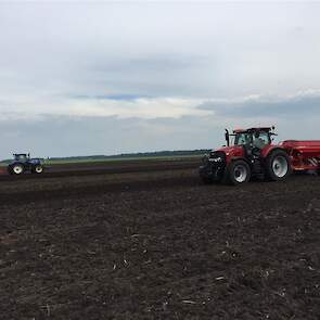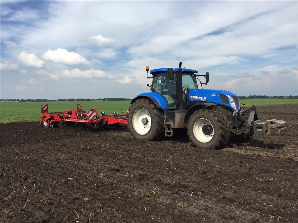 De laatste mais gaat nog snel de grond in. Het land wordt tussen de buien door klaar gemaakt met de Horsch Tiger 3 AS en vervolgens gezaaid met de Horsch Maestro. Met de Horsch Tiger wordt het land 35cm diep losgetrokken om vervolgens de mais te zaaien. Grote voordeel hierbij is dat de 1 meter hoge bandenpacker de bodem weer aandrukt zodat de mais in de vaste grond gezaaid kan worden. De Maestro is omgebouwd naar een rijafstand van 45cm. Dit met de filosofie dat er ook vol velds bemest wordt en de plant hierdoor meer ruimte krijgt om te groeien.