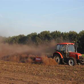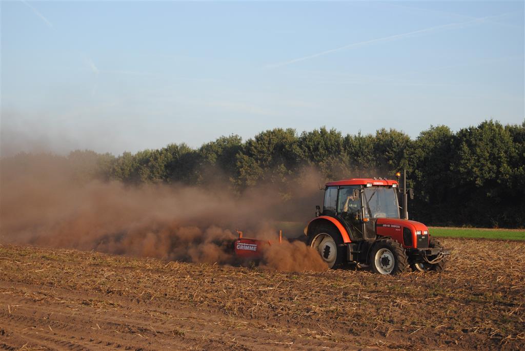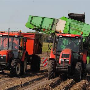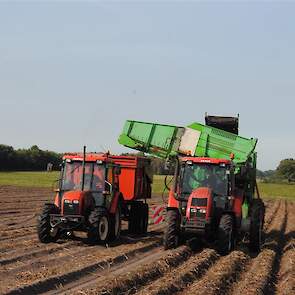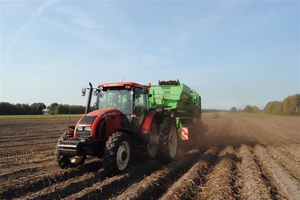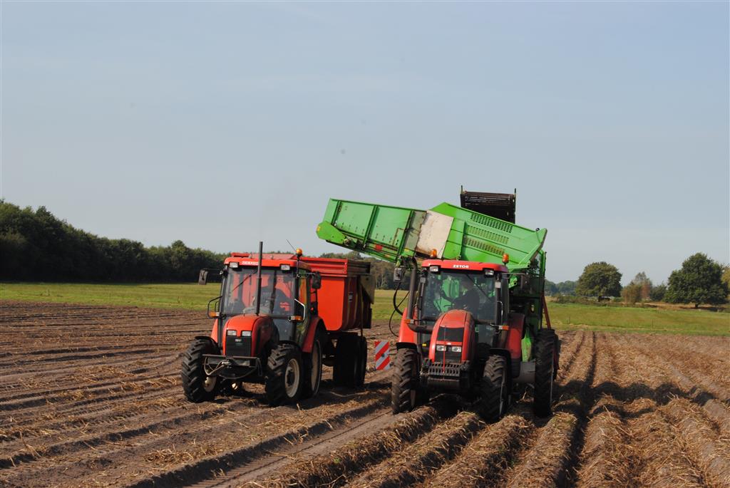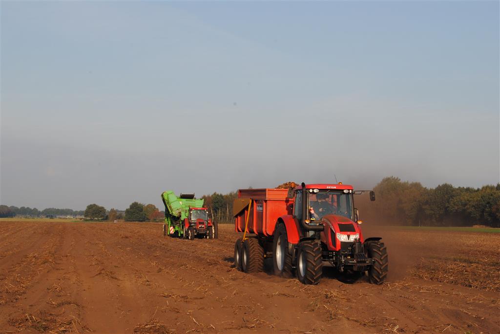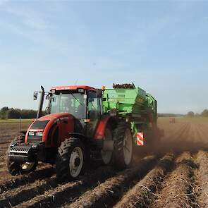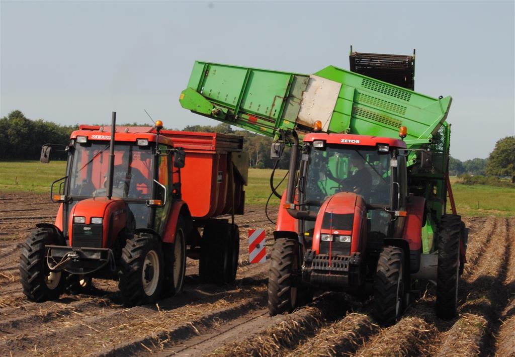 Mts Scholten aardappels rooien onder droge omstandigheden met de Accent rooimachine van AVR. De Zetor trekkers zorgen voor het transport en staat voor de rooimachine