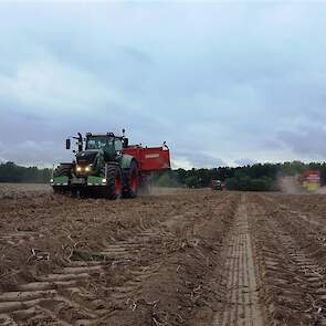 12 typisch Duitse HW 80 - 3 zijden kippers, 2 per combinatie rijden de aardappels over grote afstand snel en efficiënt naar het depot zon 50km verderop. De rooier is nog niet weg of de kopakkers worden al bewerkt. Maar liefst 10 Fendt trekkers op één veld, een drukte van belang.Afstanden zijn in Duitsland geen probleem, zeker niet als je daar 60km/uur mag rijden en gewoon met het verkeer mee kunt, ook over de Bundesstraße waar het overige verkeer 100km/u mag. De gewoonste zaak van de wereld.